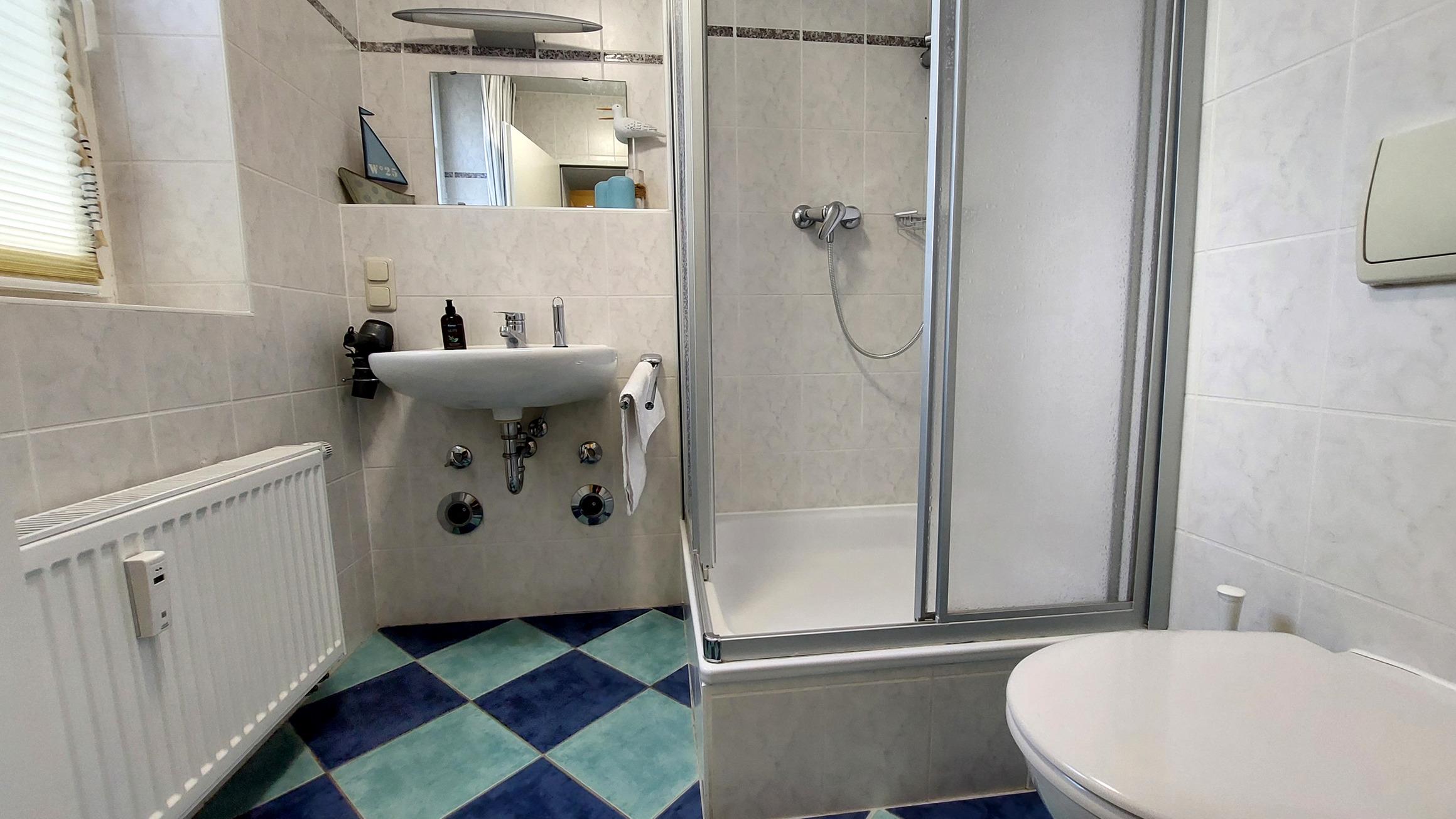 Im Tageslichtbad finden Sie Dusche, Waschbecken, WC und einen Föhn.