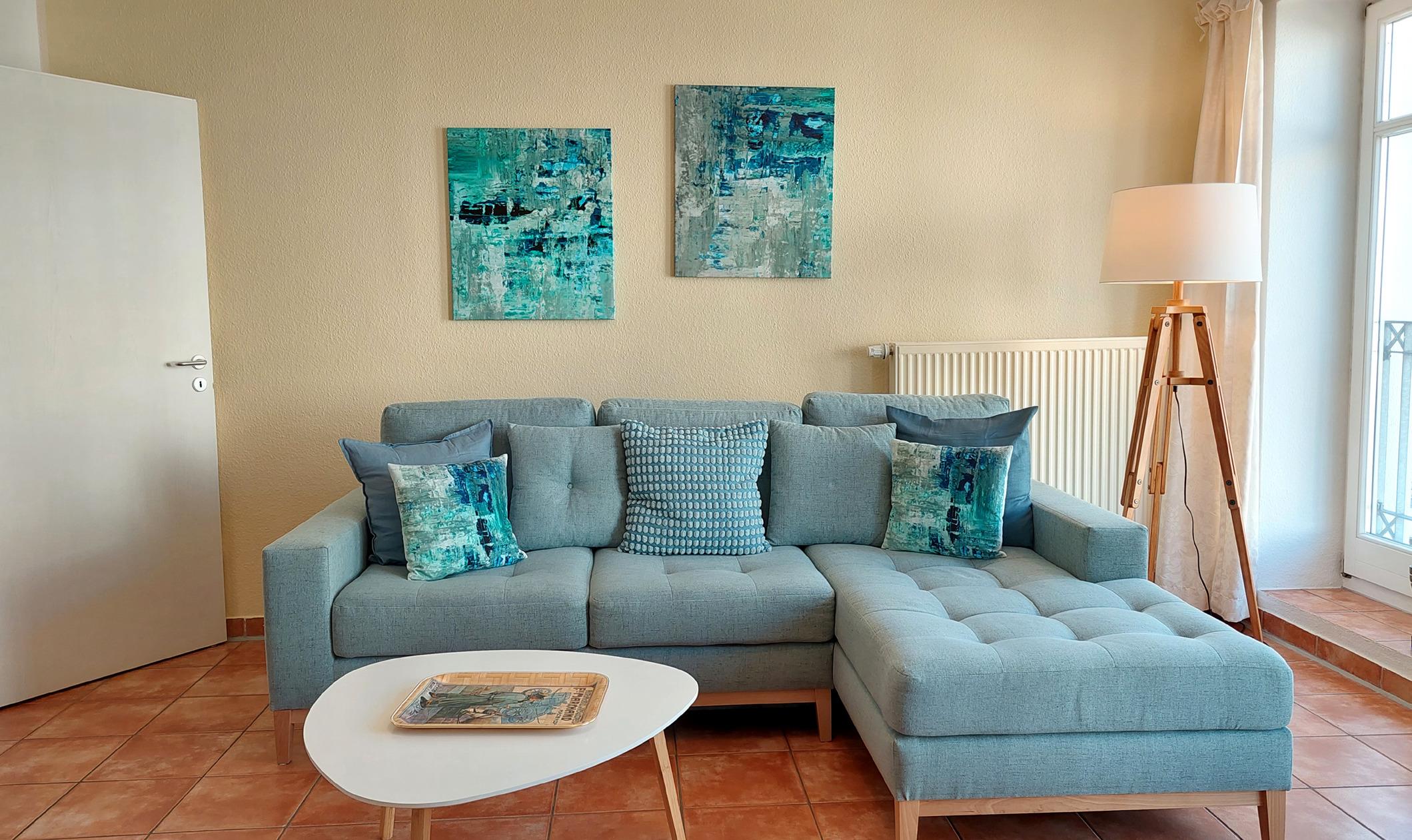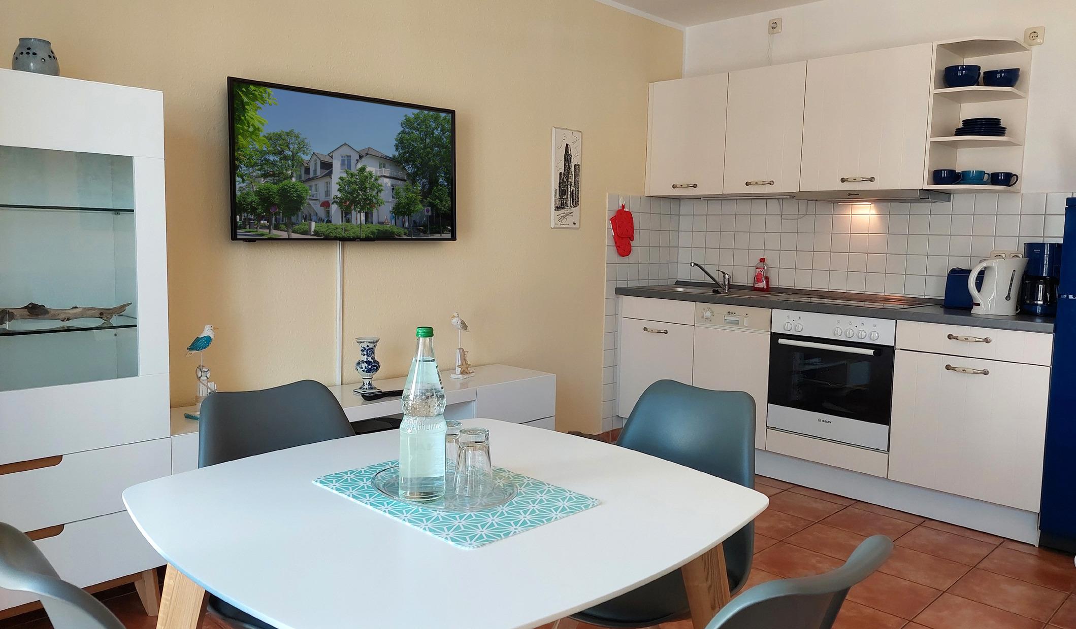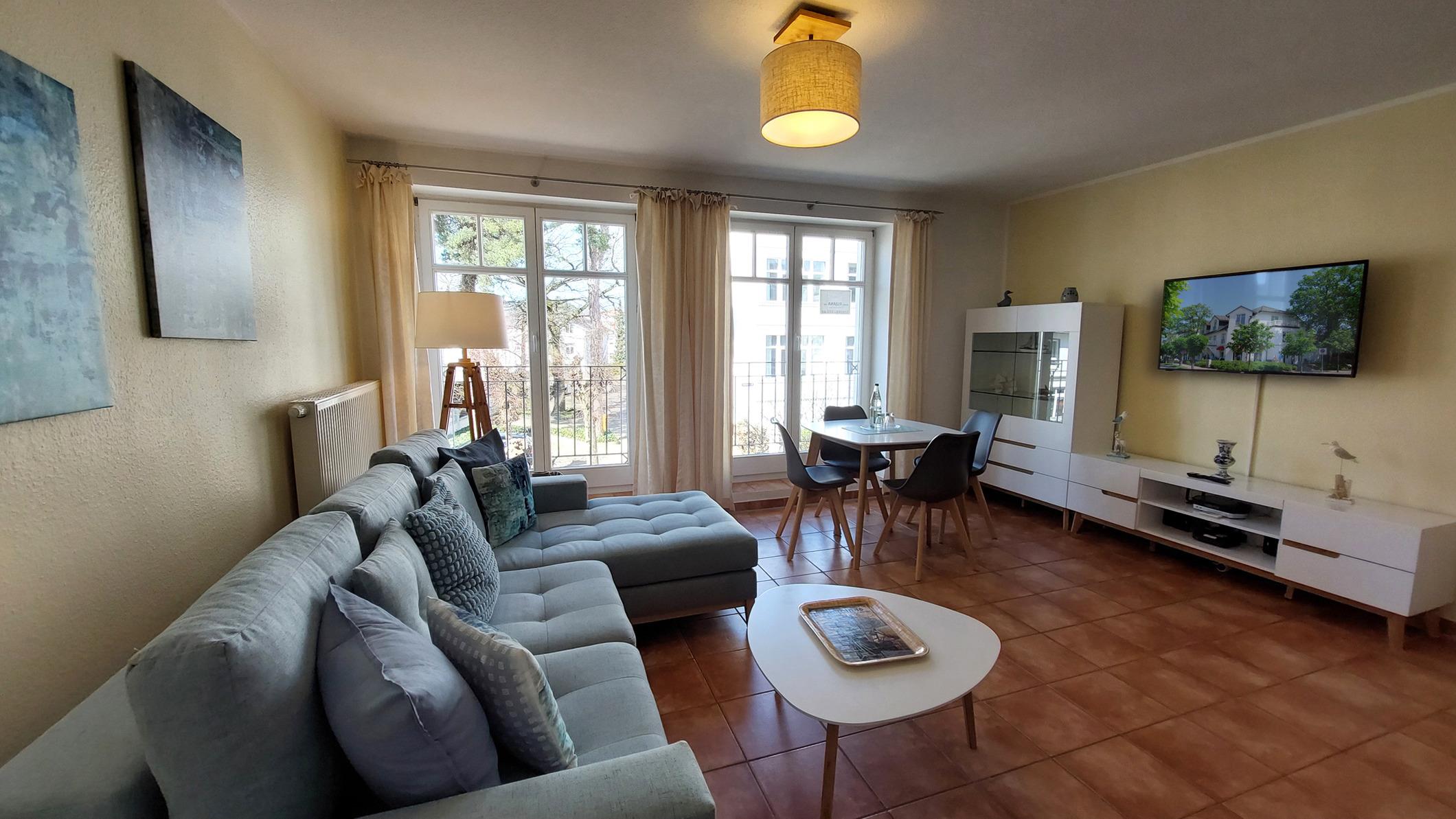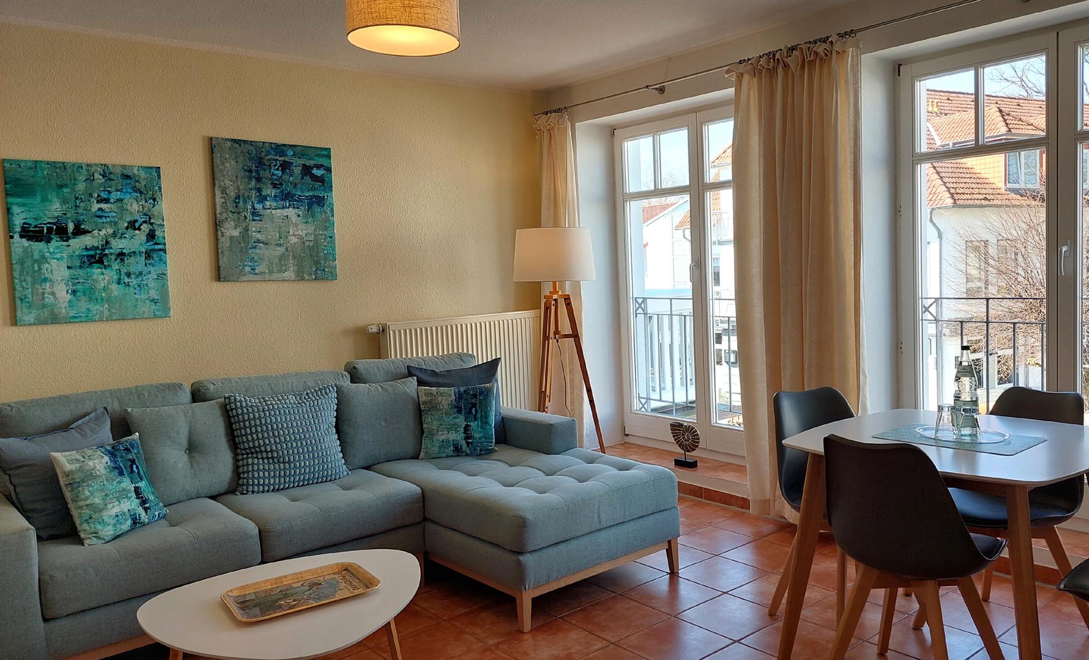 Ihre helle im skandinavischen Stil, 2022 neu eingerichtete Ferienwohnung 90030 befindet sich im 1. OG der Villa Saxonia, nur 150 m bis zum feinsandigen Ostseestrand. Die moderne 2 Zimmer-Wohnung hat eine Größe von ca. 50 qm. Das Badezimmer mit Vintage-Waschtisch, ebenerdiger Dusche und WC, hat ein Fenster. Der ruhige Südbalkon lädt zum Frühstücken ein. Im Schlafraum befindet sich ein Boxspringbett und ein großer Kleiderschrank. Im Wohnraum finden Sie mit dem Schlafsofa (Liegefläche 1,30m x 2.05 cm) 2 weitere Schlafmöglichkeiten. Außerdem finden Sie im Wohnraum neben der gemütlichen Sitzecke einen separaten Essplatz, Flach-TV mit Radio. Die integrierte Küche ist mit Geschirrspülmaschine, Kochgelegenheit, Kühl-Gefrier-Kombination, Mikrowelle Toaster, Kaffeemaschine und Geschirr ausgestattet. Der W-LAN Zugang ist für unsere Gäste gebührenfrei. Ein wohnungseigener kostenfreier Parkplatz (Nr.17) steht für Sie direkt am Haus zur Verfügung. Ihr Vierbeiner ist ebenfalls herzlich Willkommen.