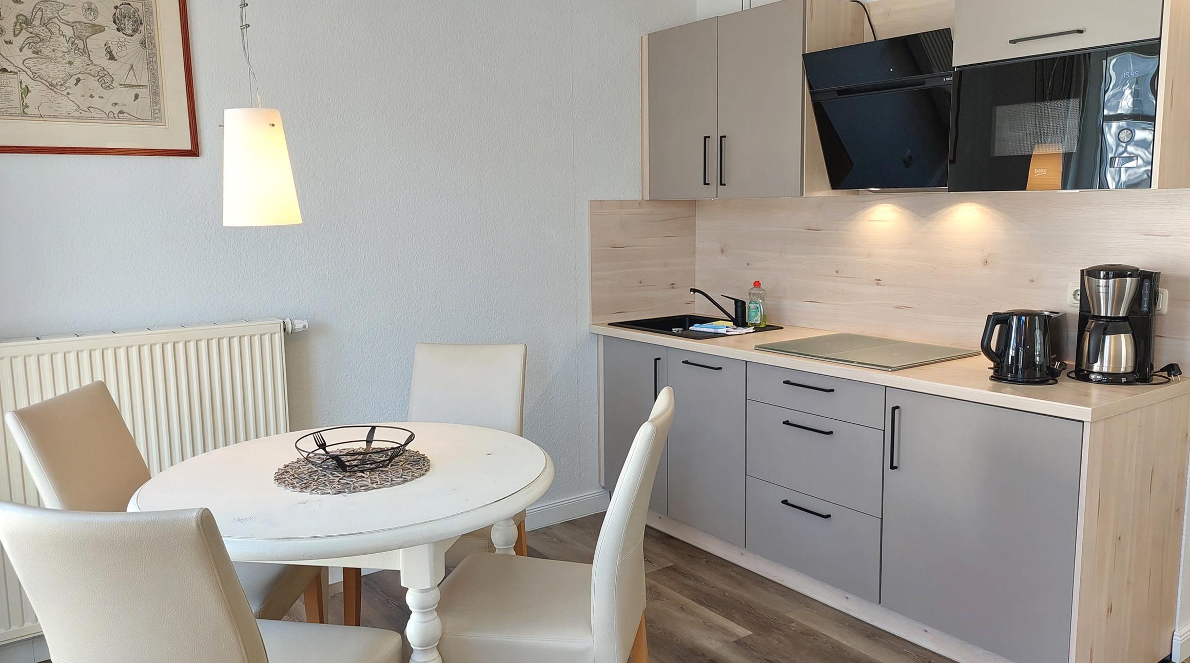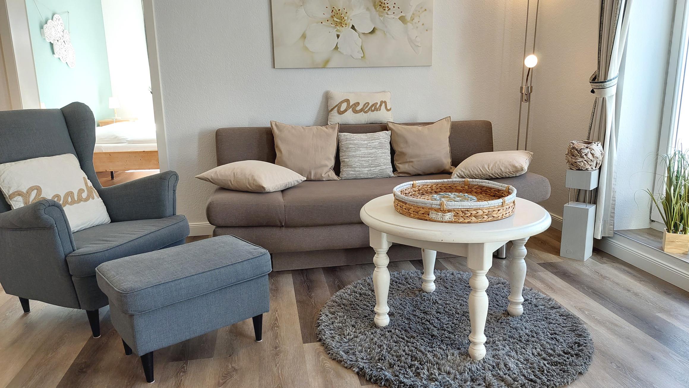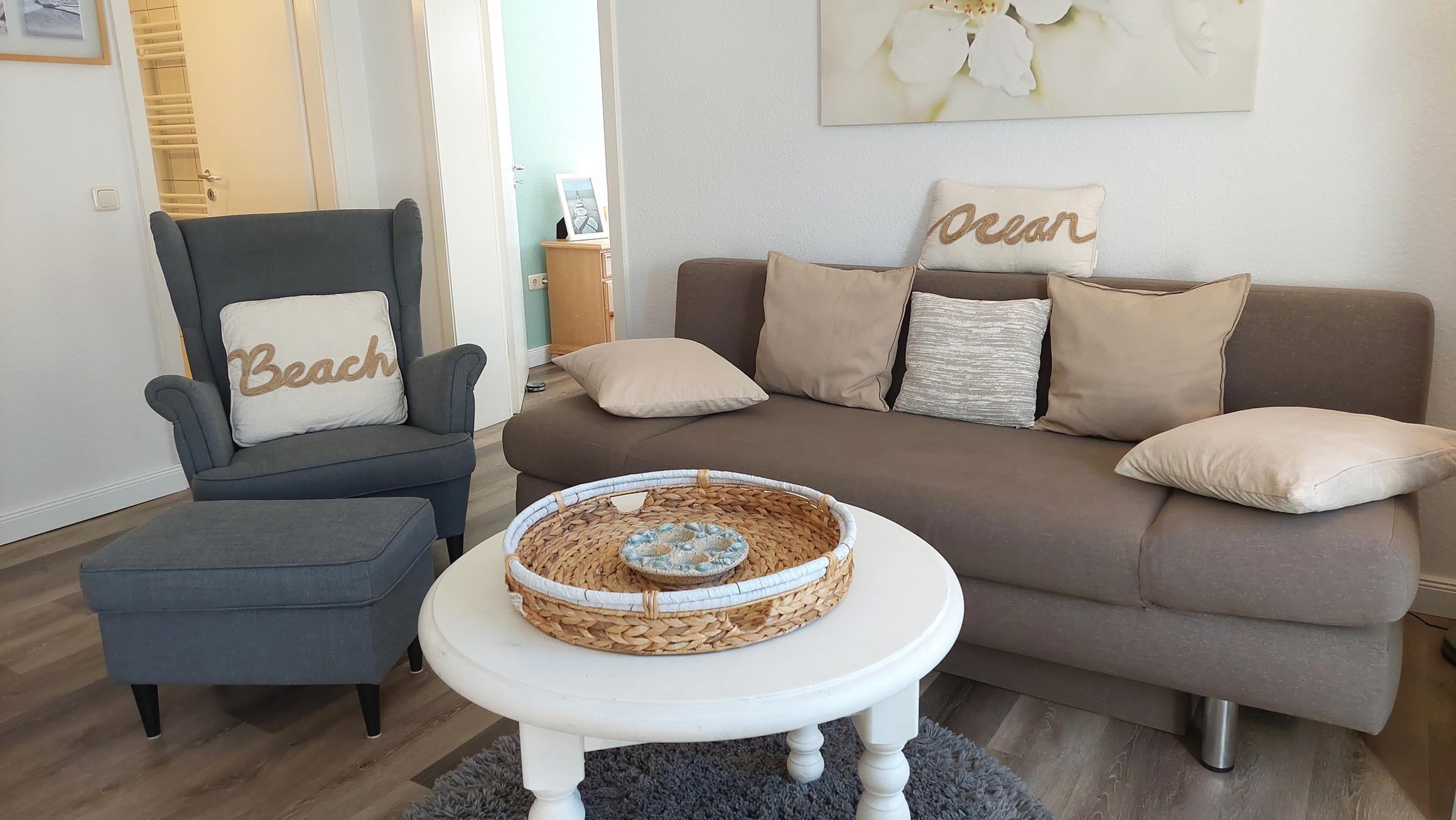 Im Wohnraum kann auf dem Schlafsofa eine weitere Person schlafen. Hier finden Sie neben der Sitzecke, einen separaten Essplatz, Flachbild-TV, Radio und einen kostenfreien WLAN-Zugang. Die Kochzeile ist mit Geschirrspülmaschine, Kochgelegenheit, Mikrowelle, Kühlschrank, diversen Kleingeräten und anderen Küchenhelfern perfekt ausgestattet. Highlights: Ein wohnungseigener Hochstuhl für die kleinen Besucher und wohnungseigener Parkplatz steht für Sie direkt am Haus zur Verfügung.