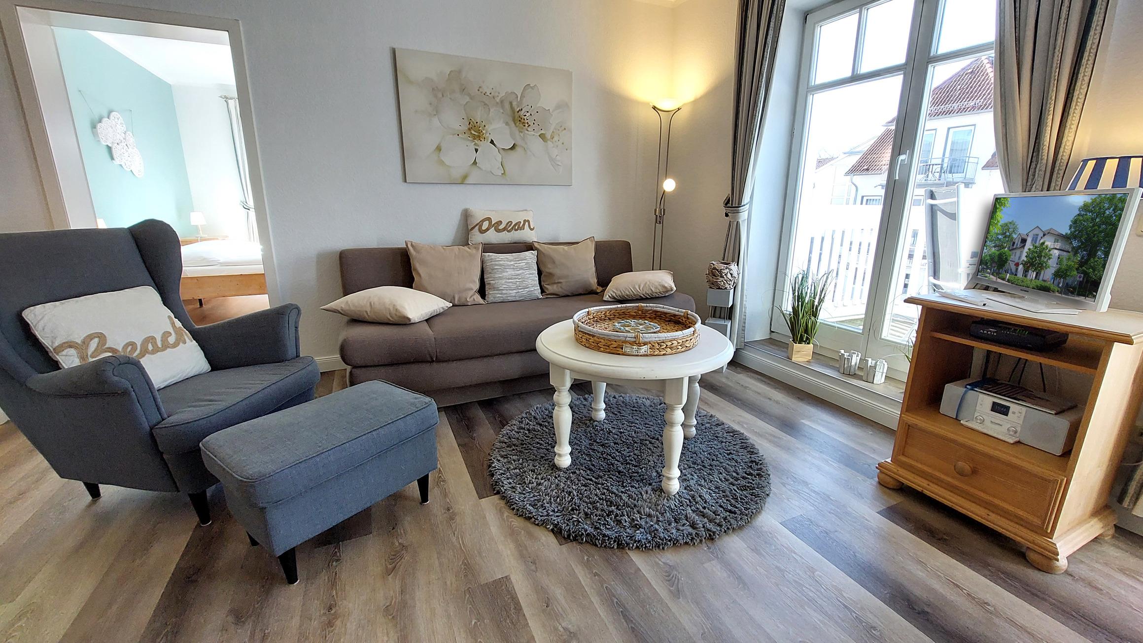 Ihre Ferienwohnung 90302 befindet sich im 1. Obergeschoss des Hauses. Die 2 Zimmer - Wohnung hat eine Größe von ca. 50 qm und verfügt über einen Nordwestbalkon auf dem Sie die Abendsonne genießen können. Neben dem Wohnraum mit integrierter Kochzeile gibt es einen separaten Schlafraum, Flur und ein Badezimmer mit Waschtisch, Dusche und WC. Im lichtdurchfluteten Schlafraum befindet sich ein Doppelbett, ein großer Kleiderschrank und mehrere "französische Balkone".