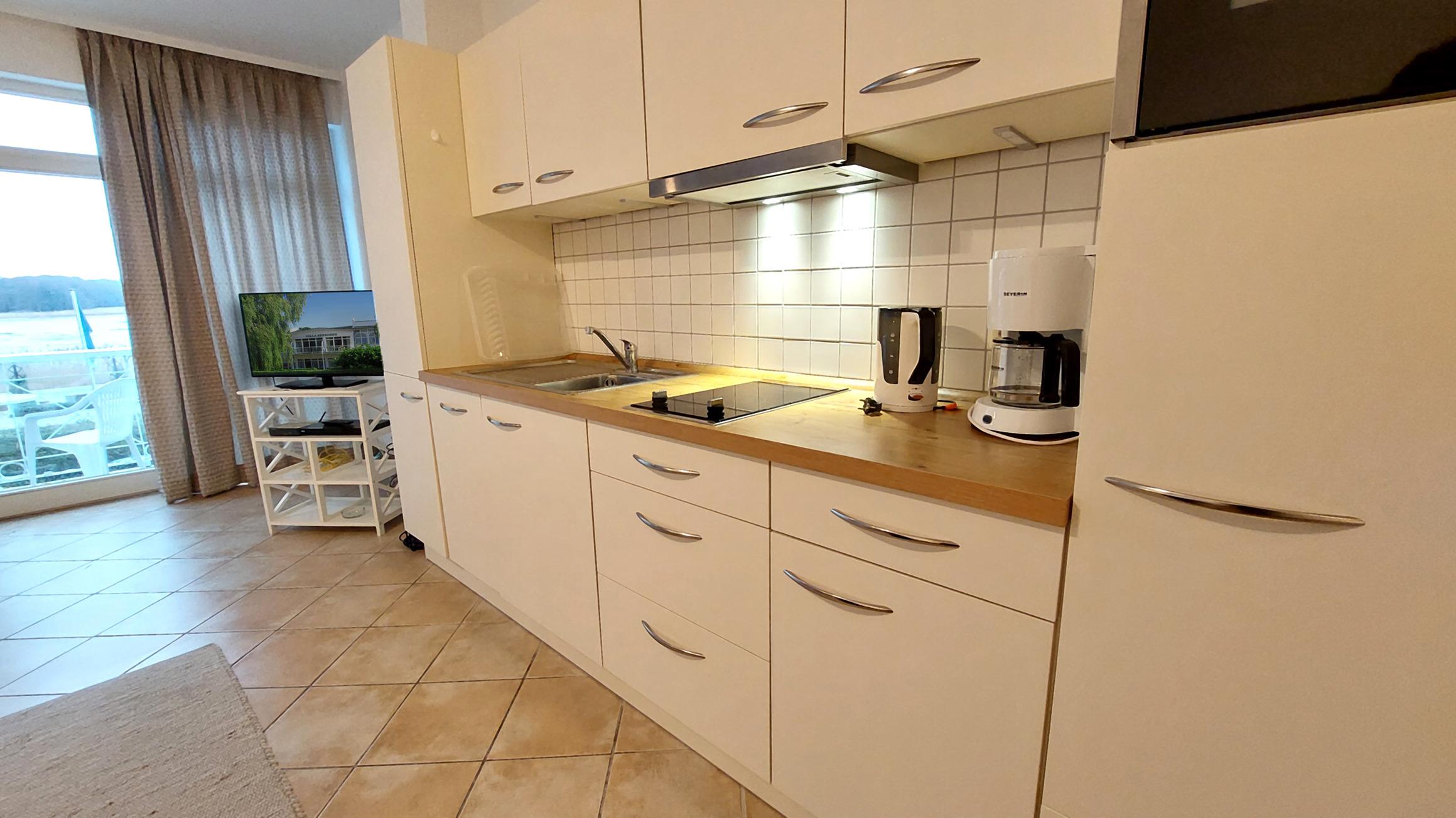 Im Wohnbereich gibt es zudem ein Schlafsofa, auf dem zwei weitere Personen übernachten können. Eine gemütliche Essecke und eine moderne Küchenzeile mit Geschirrspüler, Backofen, 2-Platten-Cerankochfeld und Kühlschrank mit Gefrierfach stehen zur Verfügung.