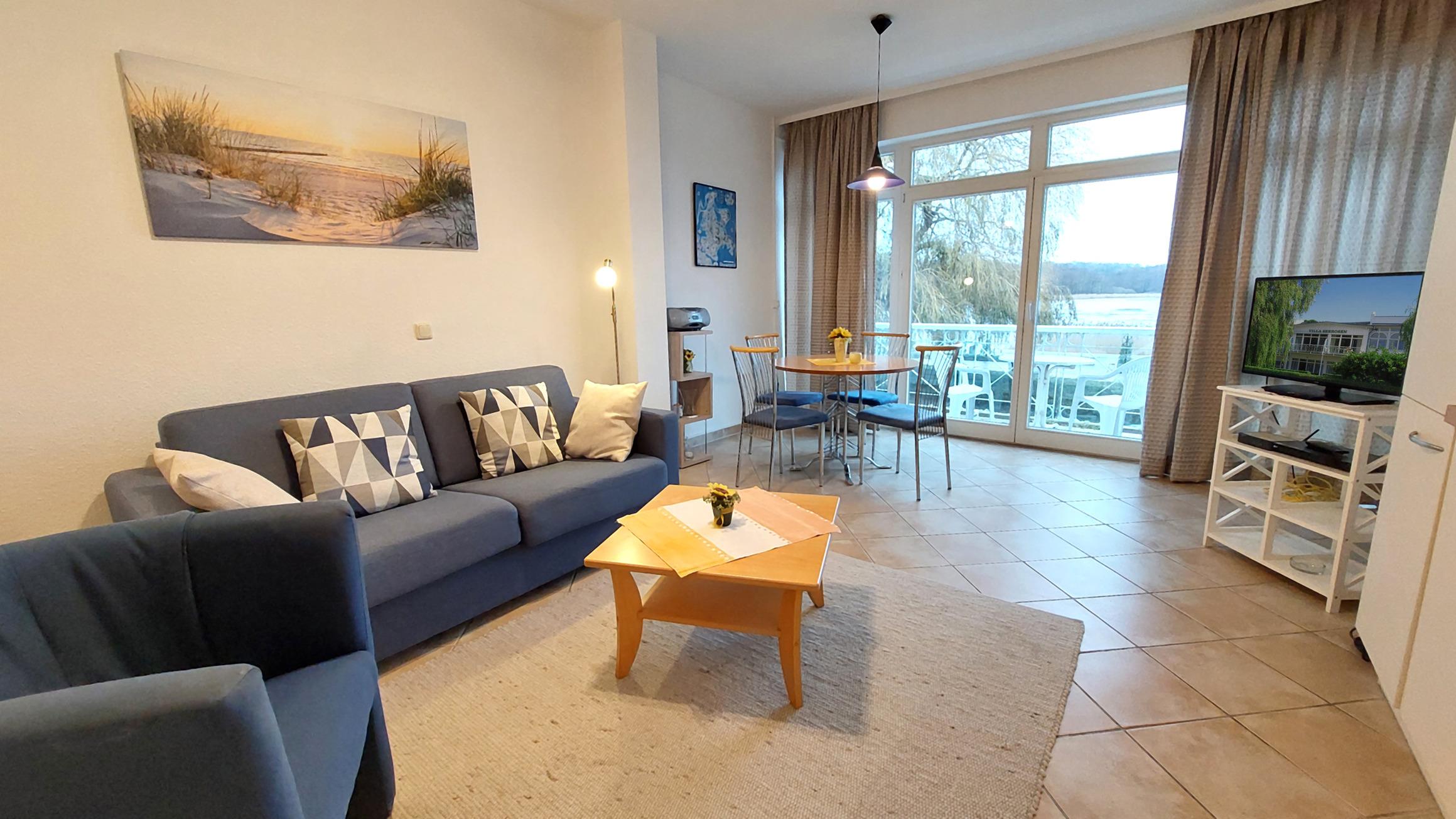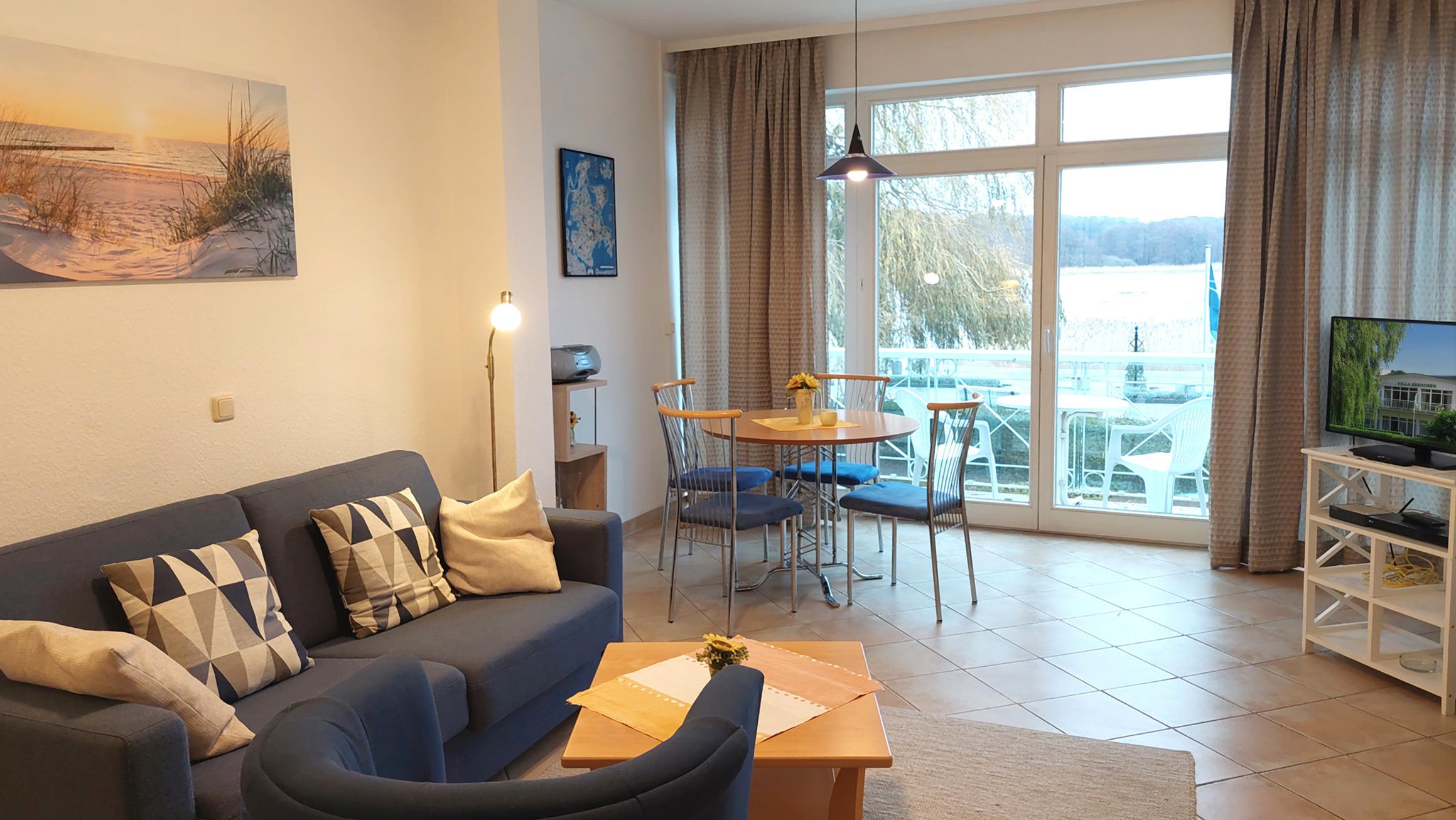 Die Ferienwohnung 37RB15 bietet auf einer Fläche von 42 m² Platz für bis zu 4 Personen. Sie befindet sich in der ersten Etage der "Villa Seerosen" und verfügt über einen Balkon mit direktem Blick auf den Schmachter See. Das Appartement ist ausschließlich für Nichtraucher geeignet und verfügt über ein Badezimmer mit Dusche sowie ein Schlafzimmer mit einem Doppelbett.
