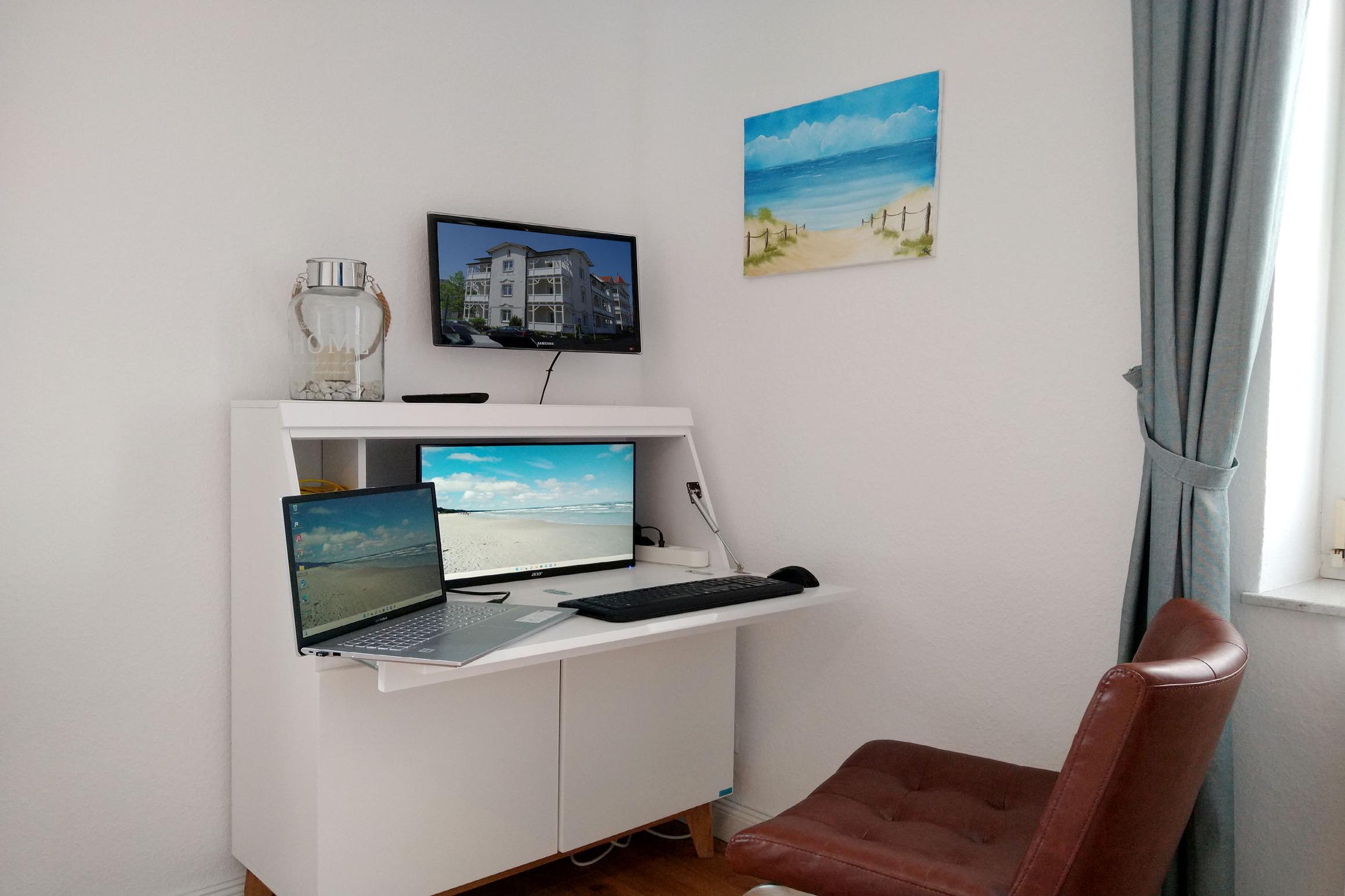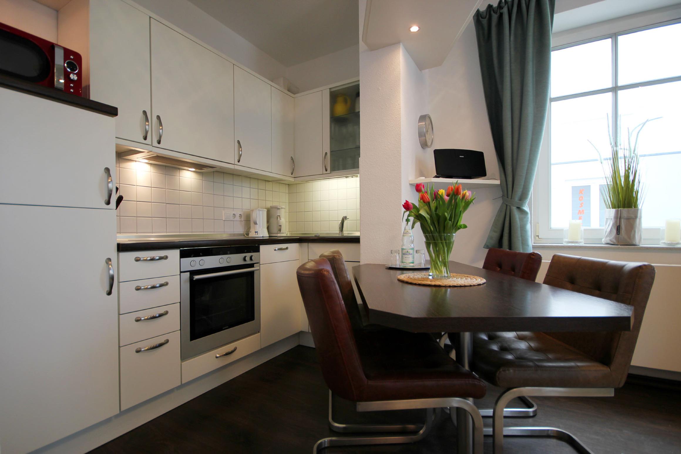Ihre modern eingerichtete Ferienwohnung 1RB4 liegt im Erdgeschoß der Villa und hat eine große überdachte Terrasse. Das geräumige 2-Raum-Appartement bietet bis 4 Personen Platz für einen angenehmen Aufenthalt. Die Wohnung verfügt über einen Wohnraum mit halboffener Küche und integriertem Essplatz. Die gemütliche Sitzgruppe kann zur Doppelbettcouch umgebaut werden, TV und Radio finden Sie ebenfalls im Wohnbereich. Weiterhin gibt es im Appartement ein großes Schlafzimmer mit Doppelbett, TV und Kleiderschrank sowie ein Badezimmer mit Waschtisch, Dusche und WC. Alle unsere Gäste können einen kostenfreien W-LAN-Zugang nutzen. Ein weiteres Highlight ist der Sekretär mit integriertem 24 Zoll Monitor und Netzwerk-Anschluss im Schlafbereich. Wenn es doch einmal heißt, schnell noch was für die Arbeit erledigen, haben Sie damit die beste Möglichkeit. Ein Münz-Waschtrockner steht Ihnen im Keller des Nachbarhauses zur Verfügung. Den Fahrradabstellraum des Nachbarhauses können Sie ebenfalls nutzen. Ein Kfz-Stellplatz gehört auf dem Parkplatz "Zentrum" zur Wohnung.