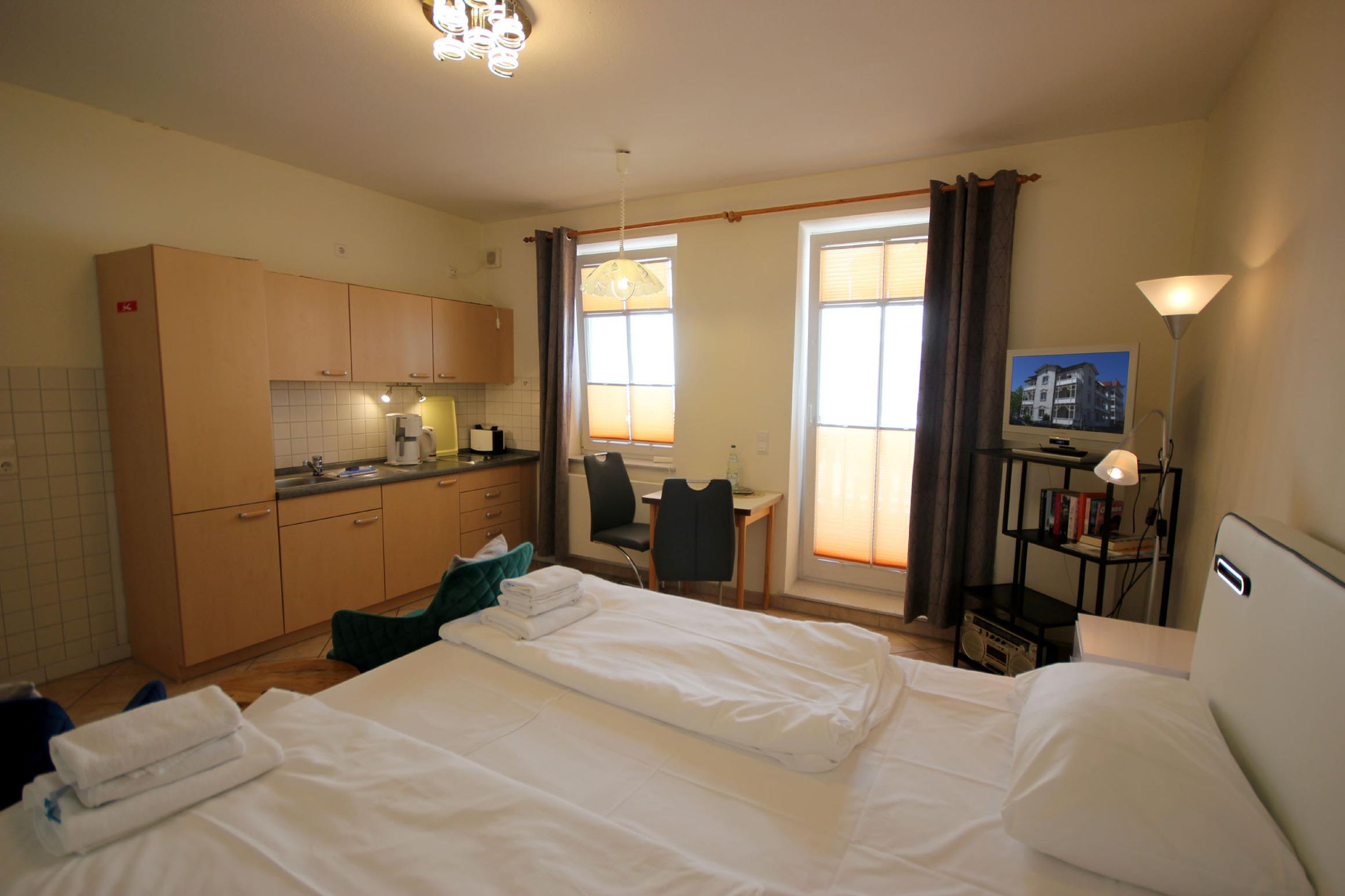 Ihre Ferienwohnung 1RB5 liegt im 1. Obergeschoss der Villa und hat einen schönen Balkon. Mit einer Größe von 35 qm ist die Wohnung ideal für zwei Personen geeignet. Das Appartement hat neben dem Wohn-/Schlafraum mit integrierter Kochzeile, einen separaten Vorraum und ein Badezimmer mit Waschtisch, Dusche und WC. Im Wohn-/Schlafraum finden Sie ein bequemes Doppelbett, eine Sitzecke, Flachbild-TV, Radio sowie einen separaten Essplatz. Die Kochzeile ist mit Kühlschrank, 2-Plattenherd, Kaffeemaschine, Toaster, Wasserkocher und anderen Küchenhelfern komplett ausgestattet.