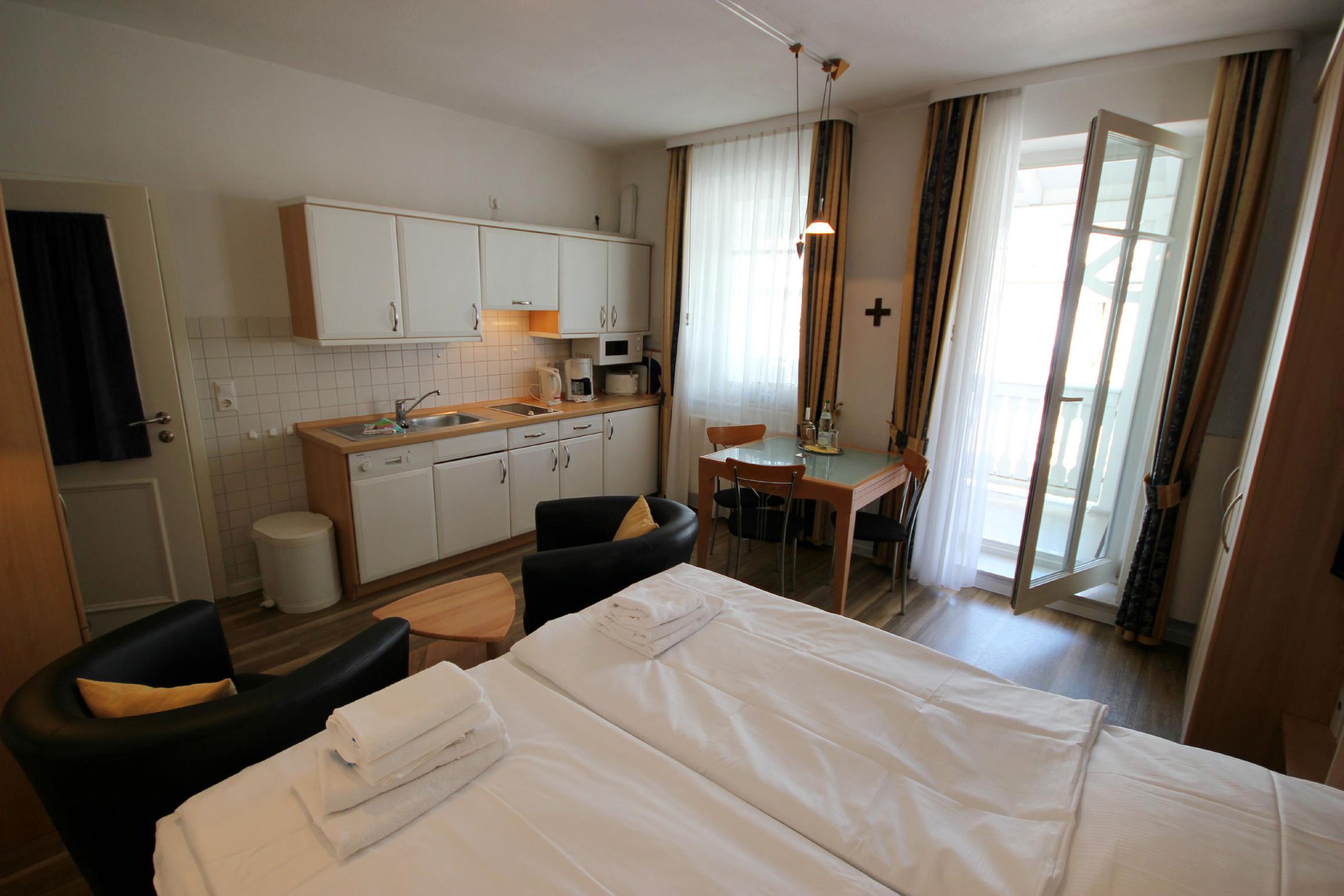 Ihre Ferienwohnung 1RB9 liegt im 2. Obergeschoss der Villa und hat einen schönen Balkon. Bis zu 3 Personen finden in dieser Wohnung mit einer Größe von 35 qm Ihren Platz. Die Wohnung hat neben dem Wohn-/Schlafraum mit integrierter Kochzeile einen separaten Vorraum mit ausklappbares Schrankbett und ein Badezimmer mit Waschtisch, Dusche und WC. Neben dem modernen Boxspringbrett (160x200) finden Sie auch eine kleine Sitzecke, einen separaten Essplatz, Flachbild-TV, Radio sowie einen kostenfreien WLAN-Zugang. Die Kochzeile ist mit Geschirrspüler, Mikrowelle, Kaffeemaschine und diversen Küchenhelfern komplett ausgestattet. Ein wohnungseigener Parkplatz steht für Sie direkt am Haus zur Verfügung. Ein Münz-Waschtrockner steht Ihnen im Keller des Nachbarhauses zur Verfügung. Den Fahrradabstellraum des Nachbarhauses können Sie ebenfalls nutzen.