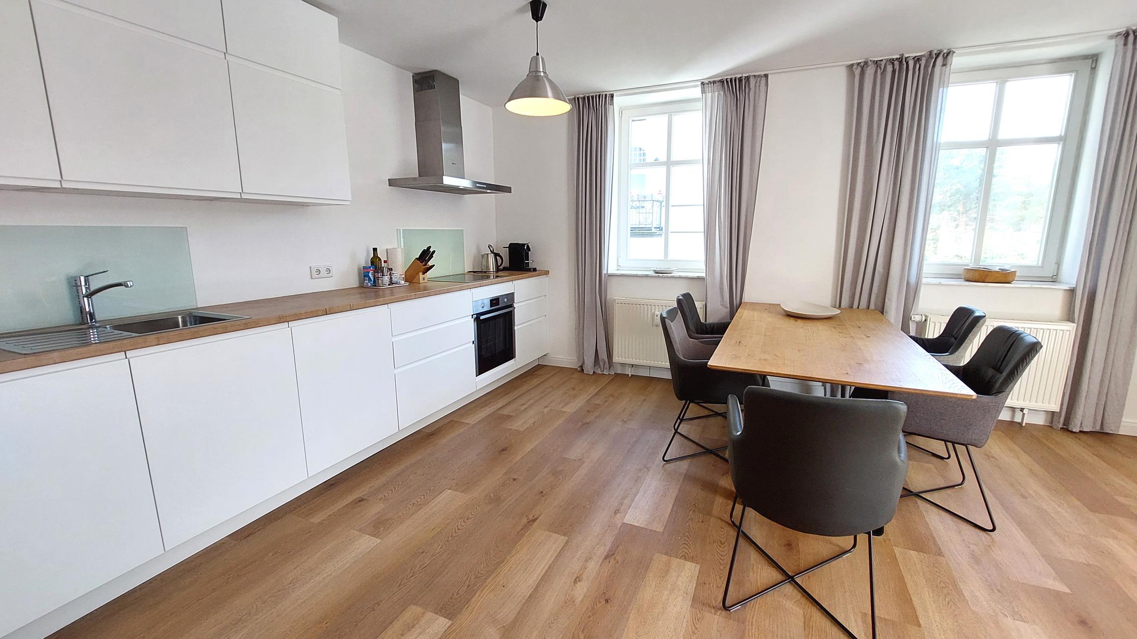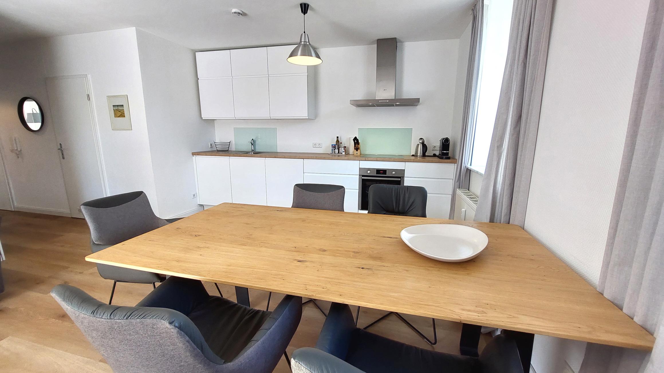 Im großzügigem Wohnbereich befindet sich eine moderne, offene Küchenzeile samt Esstisch für bis zu 5 Personen. Mit Backofen, Ceranfeld, Kühlschrank (samt Gefrierfach) und Geschirrspüler steht alles zur Verfügung um sich auch im Urlaub selbst zu verpflegen.