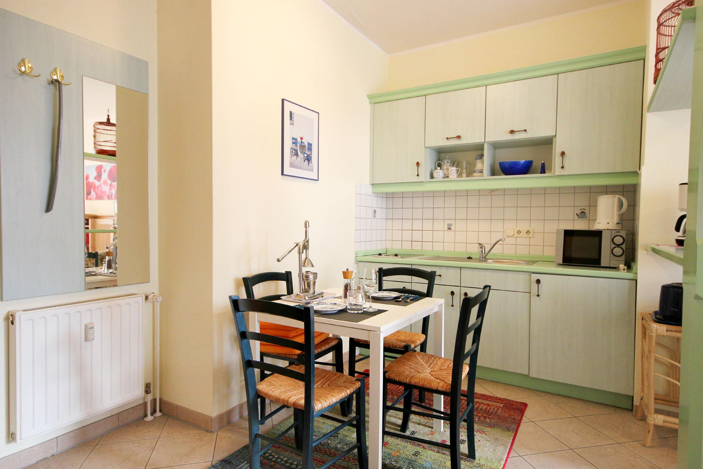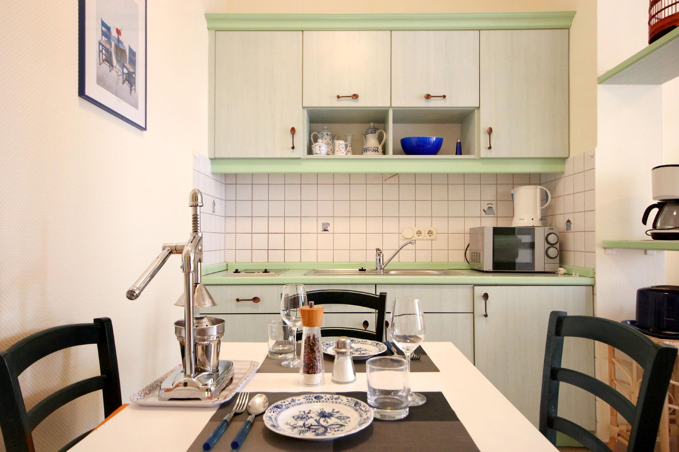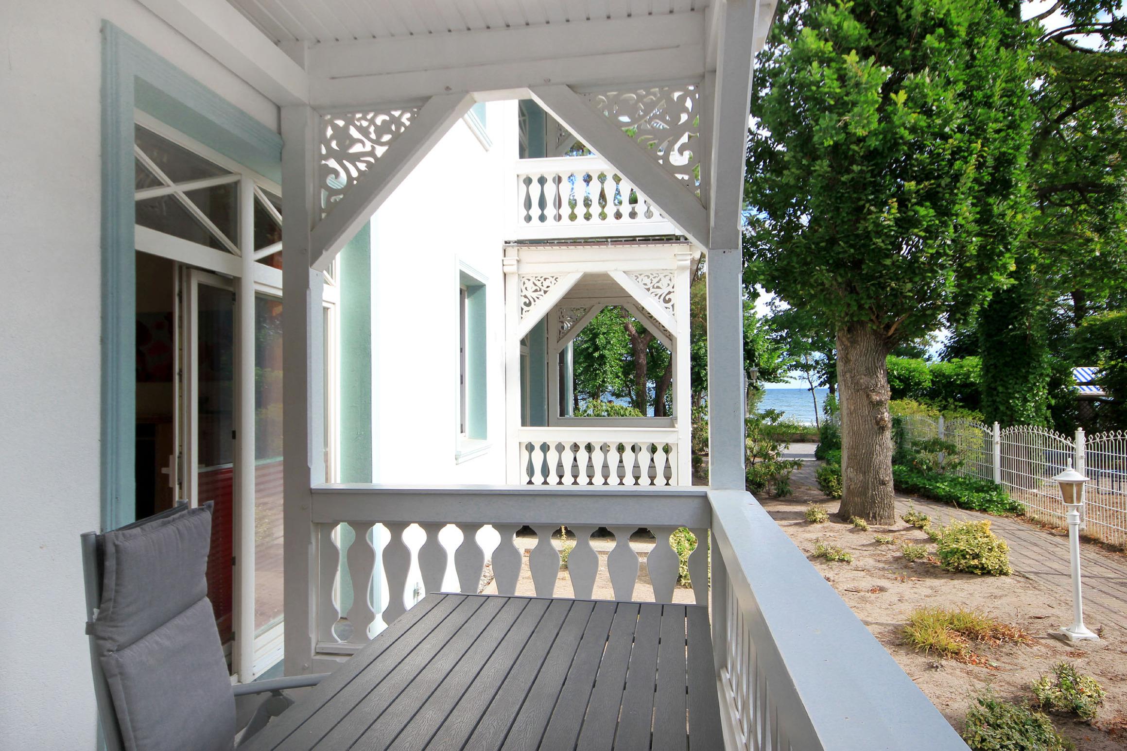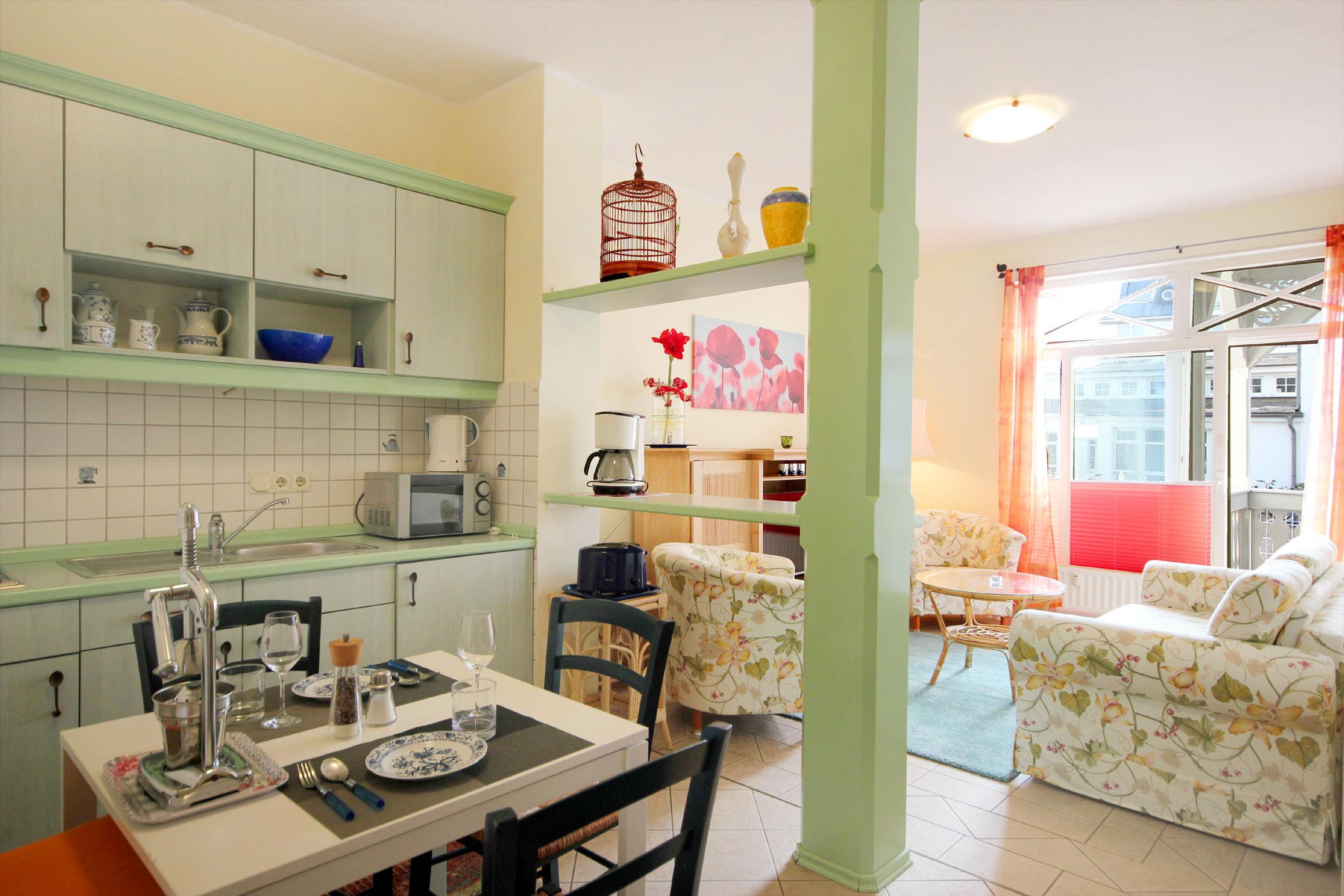 Ihre gemütliche Ferienwohnung 2RB5 befindet sich im Erdgeschoss der Villa und verfügt über einen überdachten Balkon, von welchem Sie einen seitlichen Meerblick und die Morgensonne genießen können. Die schöne 2 - Raumwohnung hat eine Größe von ca. 45 qm und bietet für 2 Personen ausreichend Platz. Neben dem Wohnraum mit integrierter Küchenzeile und Essplatz gibt es einen separaten Schlafraum und ein Badezimmer mit Doppelwaschbecken, Dusche und WC. Im Schlafraum befindet sich ein bequemes Doppelbett und ein Kleiderschrank. Die Küchenzeile ist mit Kühlschrank, kleinem Gefrierfach, 2-Platten Cerankochfeld, Mikrowelle, Kaffeemaschine, Toaster, Wasserkocher und weiteren Küchenhelfern ausgestattet. Neben dem gemütlichen Sofa finden Sie im Wohnraum zwei Sessel und einen Flachbild-TV und einen kostenfreien WLAN-Netz.