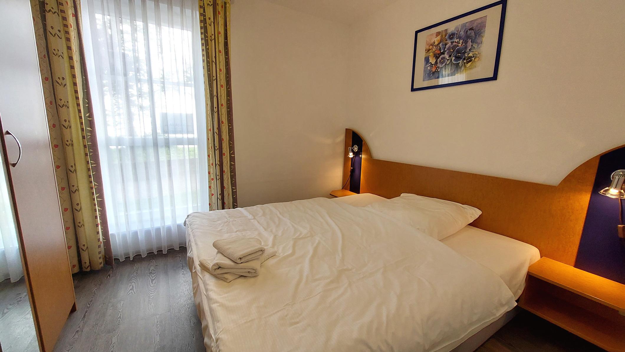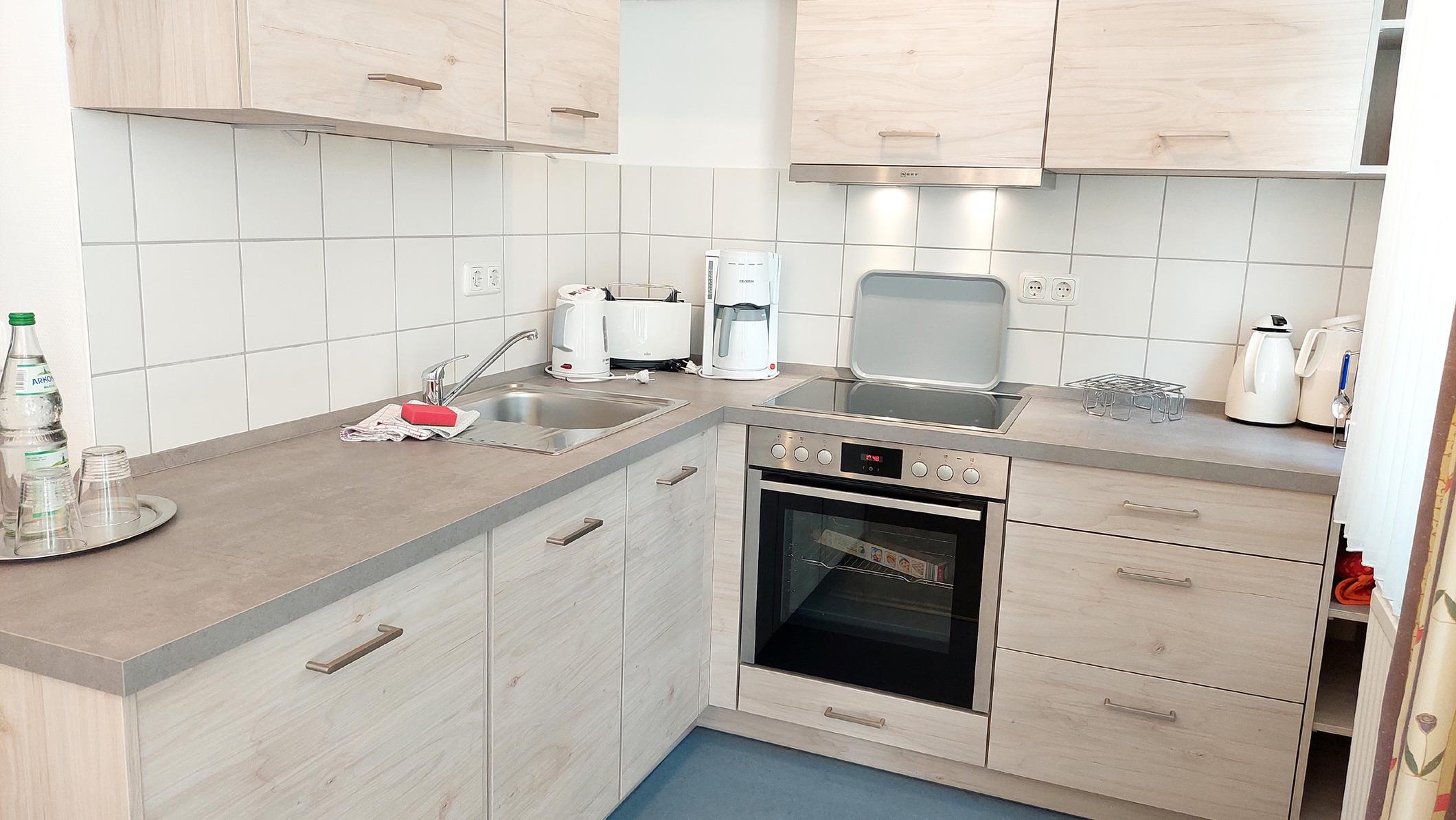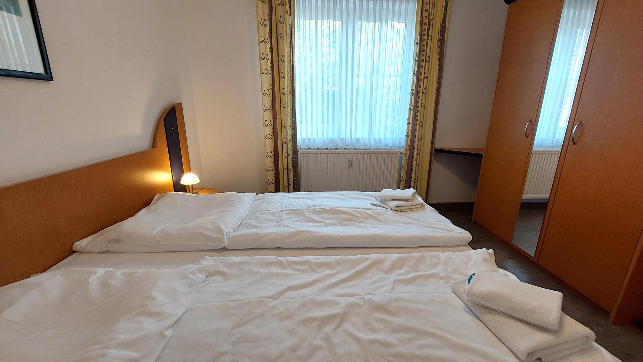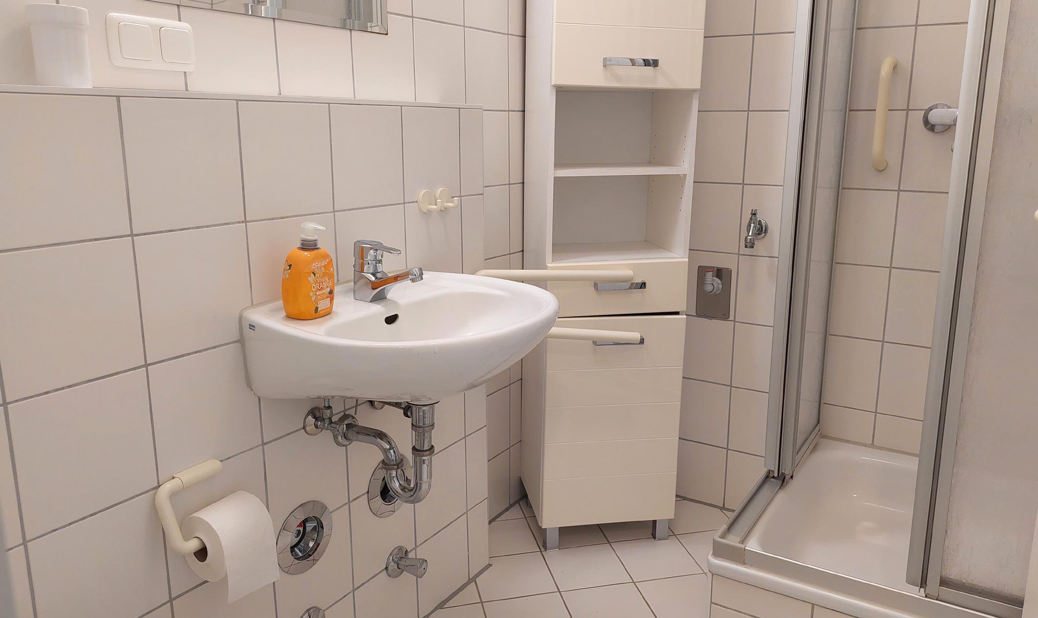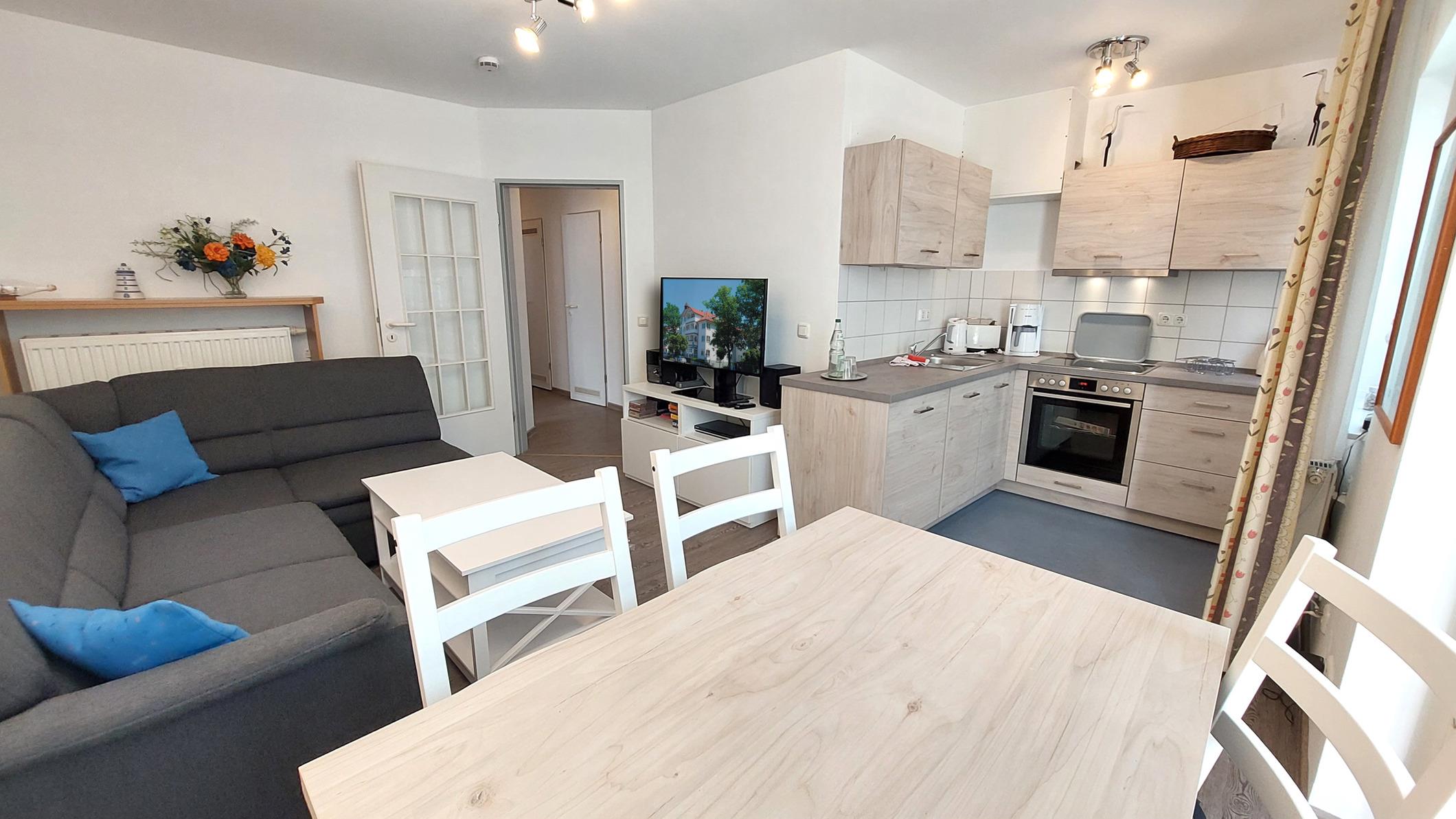 Die Wohnung teilt sich auf in Wohnraum mit kompletter Küche, ein Badezimmer, eine Gästetoilette, zwei Schlafräume, Flur und Abstellkammer. Im Wohnraum finden Sie neben der Sitzgruppe mit Sofa noch einen separaten Essplatz. Ein Fernseher und ein Radio gehören zur Ausstattung. Die beiden Schlafräume sind jeweils mit einem Doppelbett und einem Kleiderschrank ausgestattet. Im Badezimmer finden Sie Waschtisch, Duschbad und WC. Die Küche ist ausgestattet mit 2 Platten-Herd, Geschirrspüler, Kaffeemaschine, Wasserkocher und Toaster. Alle unsere Gäste haben einen kostenfreien Internetzugang in dieser Wohnung. Für Ihren PKW ist ein Einstellplatz im nur 80 m entfernten Parkhaus vorhanden.