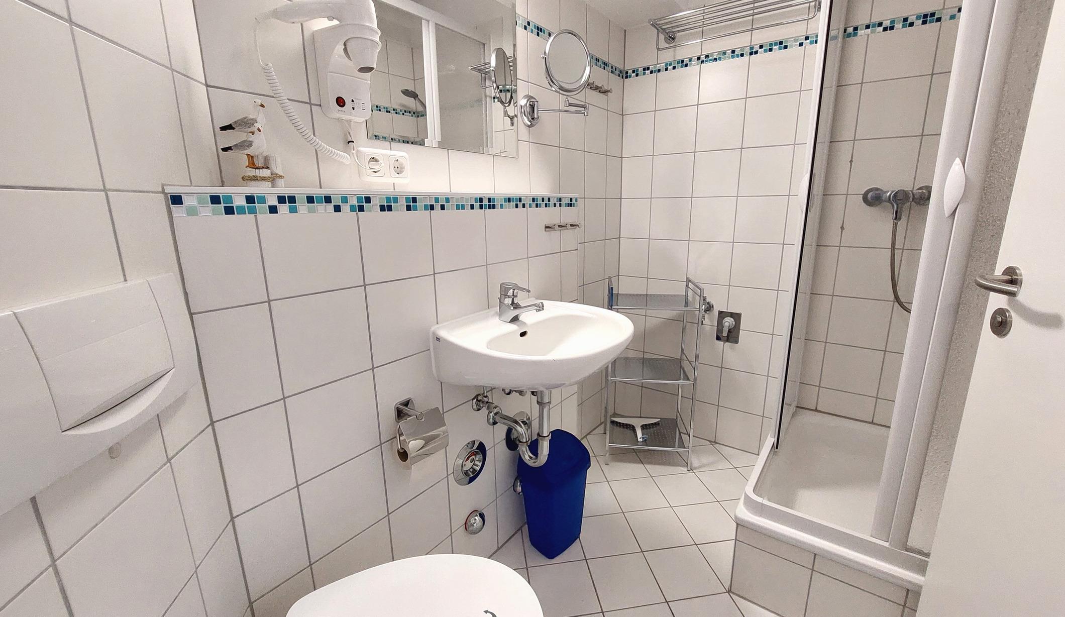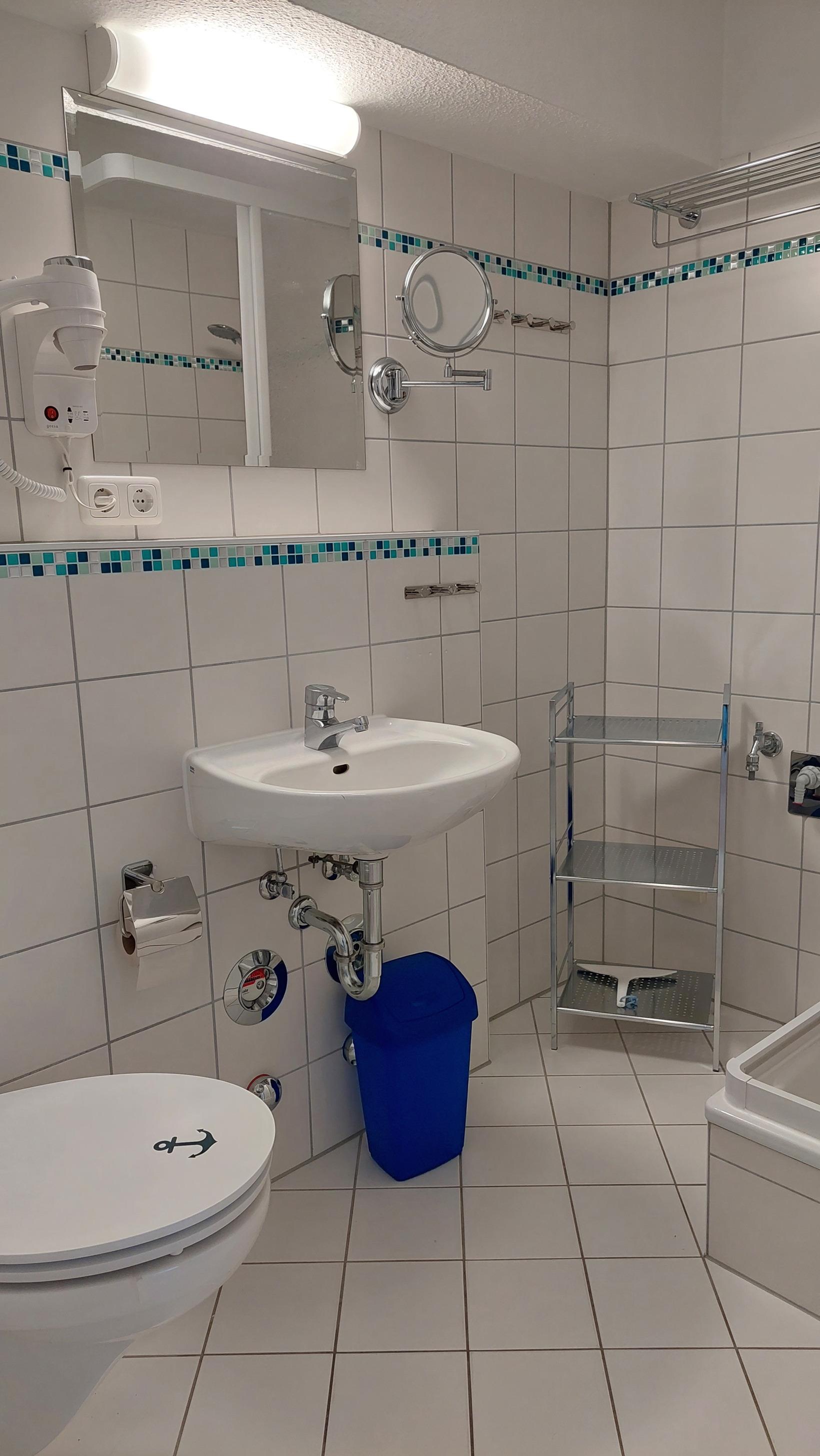 Das Badezimmer ist ausgestattet mit WC, Waschtisch, Dusche, Kosmetikspiegel, Föhn und Handtuchheizung.