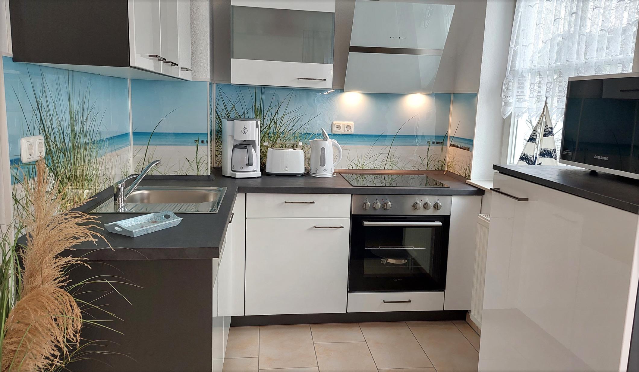 Es gibt eine moderne Küchenzeile mit Backofen, Cerankochfeld, Geschirrspüler, Kühlschrank (mit Gefrierfach), Mikrowelle und vielen weiteren Küchenutensilien.