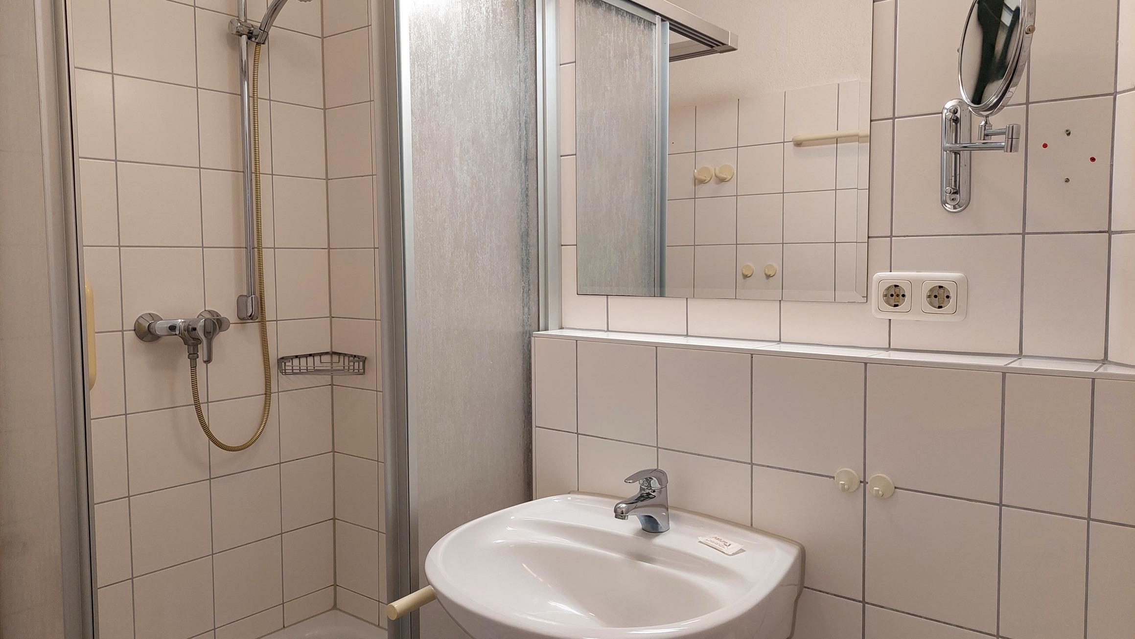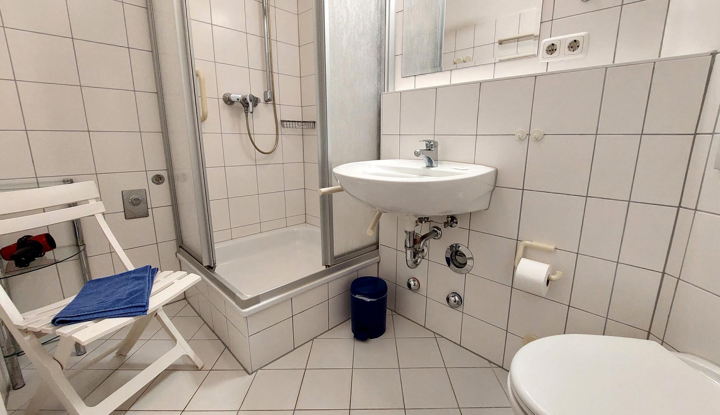 Das Badezimmer ist mit Dusche, WC, Fön und Kosmetikspiegel ausgestattet.