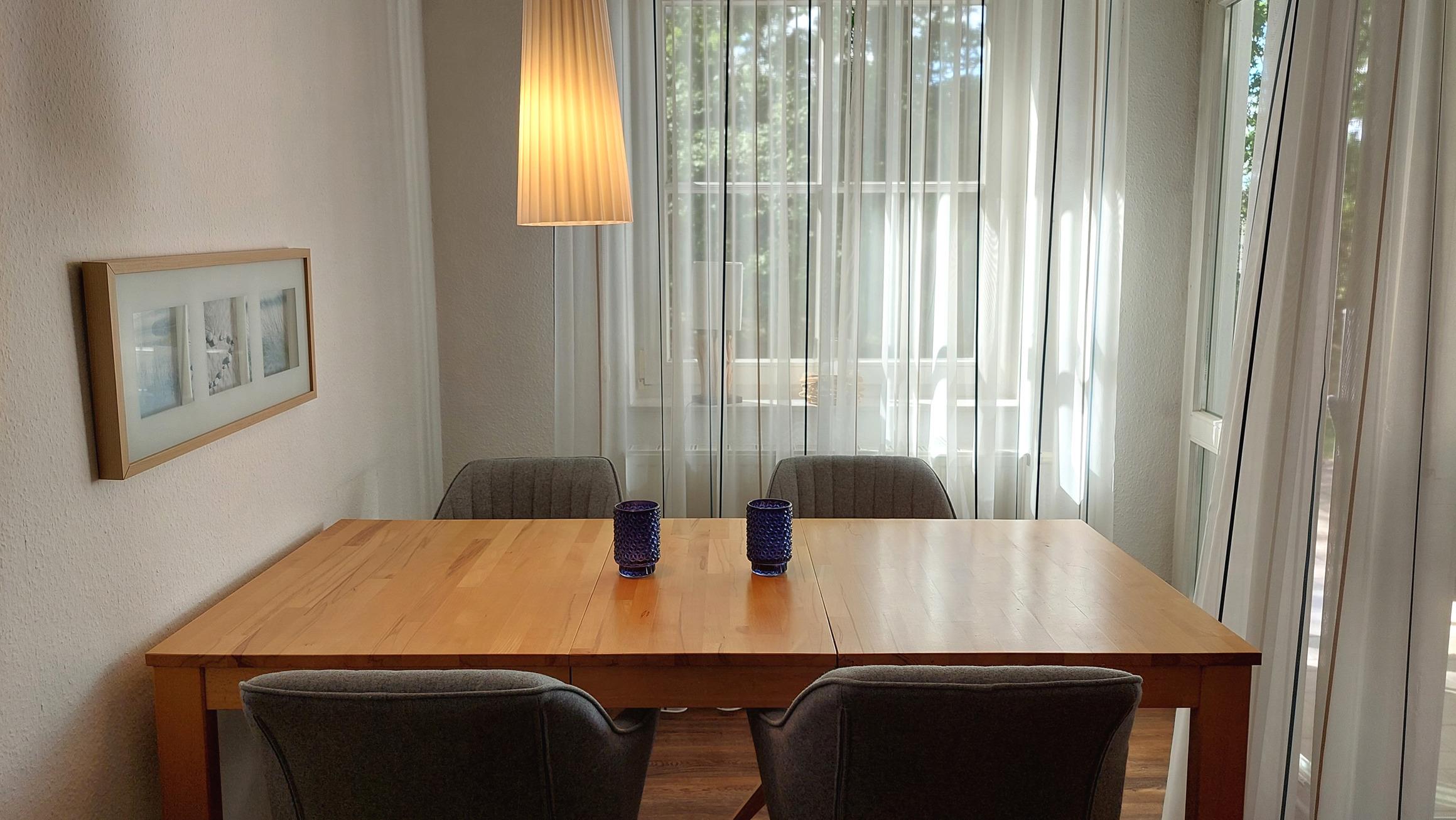 Im hellen Wohnbereich befindet sich ein Essbereich für 4 Personen sowie eine moderne Küchenzeile.