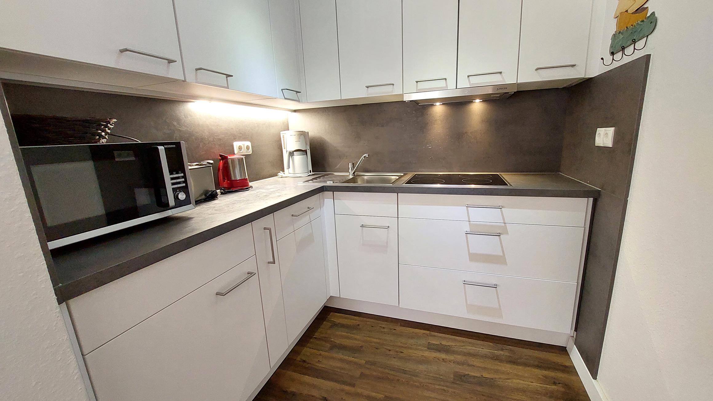 Diese verfügt über einen Geschirrspüler, Kühlschrank (mit Gefrierfach), Kaffeemaschine, Wasserkocher, Toaster und eine Microwelle mit Aufbackfunktion.