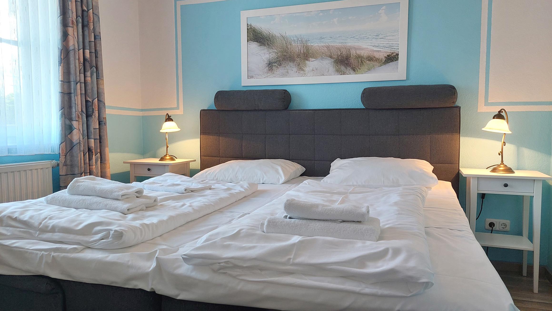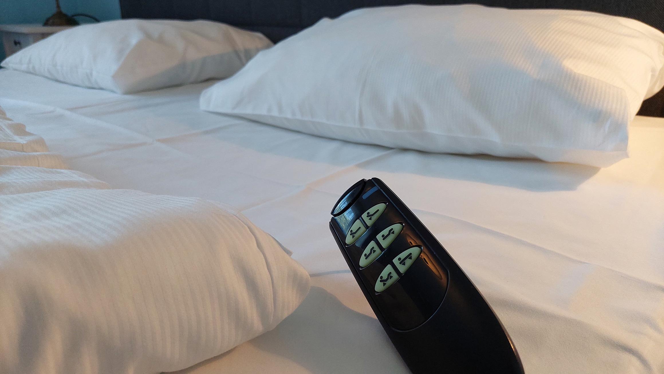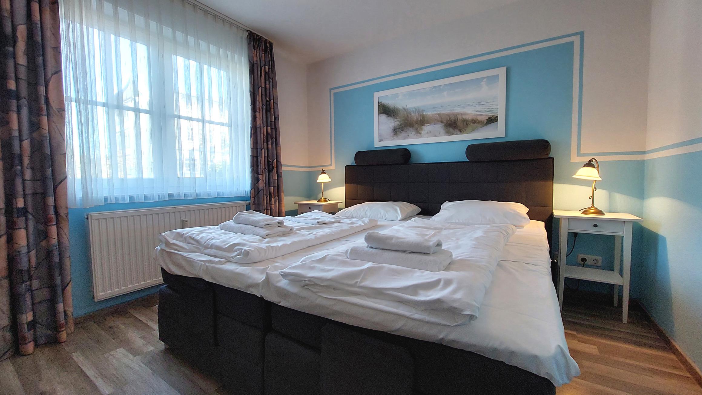 Im Schlafzimmer befindet sich ein großes Boxspringbett (mit elektrischer Sitz-und Liegefunktion), ein geräumiger Kleiderschrank sowie Nachtische mit einem Radiowecker.