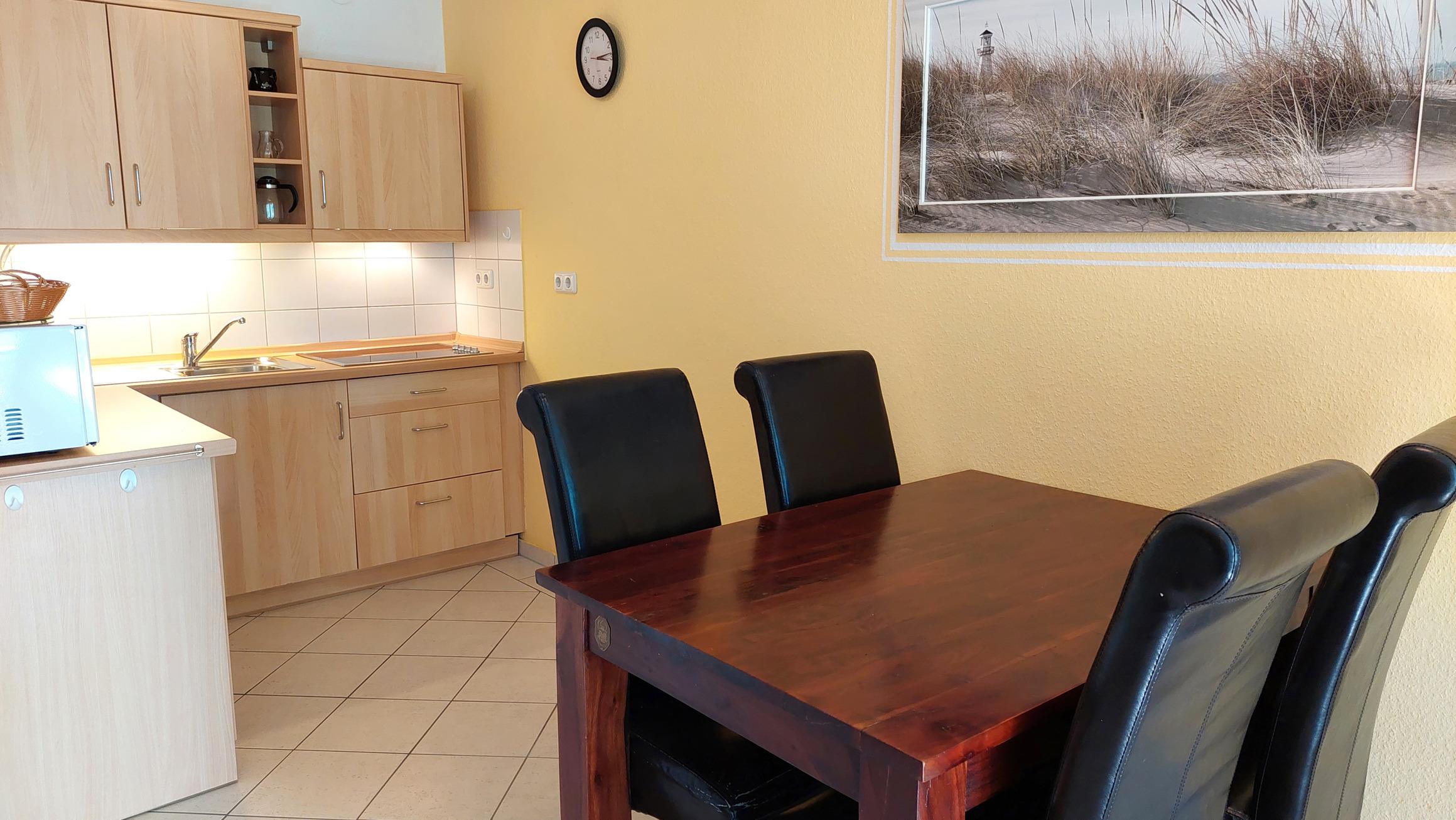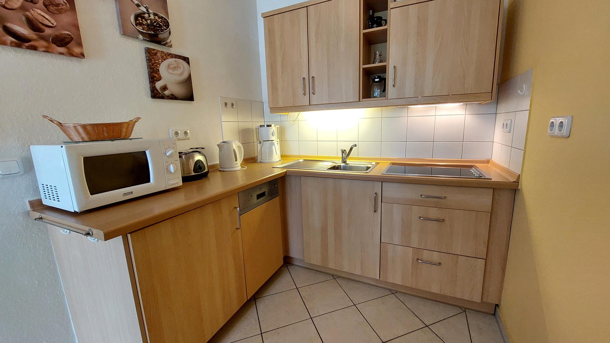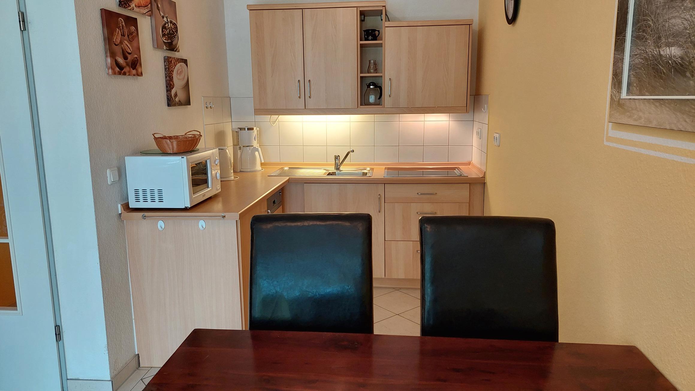 Der offene Ess- und Kochbereich umfasst einen Esstisch mit 4 Sitzgelegenheiten und eine Kochzeile samt Cerankochfeld, Geschirrspüler, Kühlschrank, Mikrowelle und vielen weiteren Küchenhelfern.