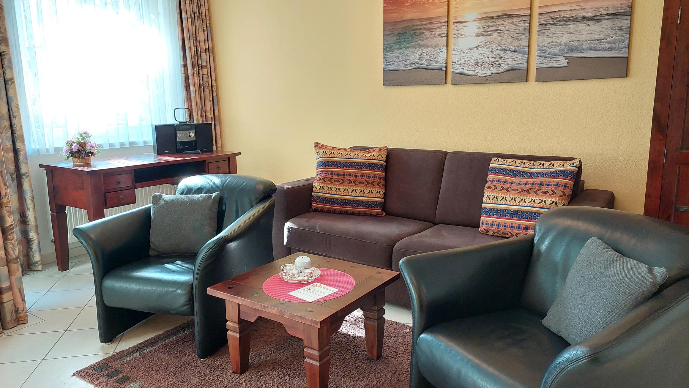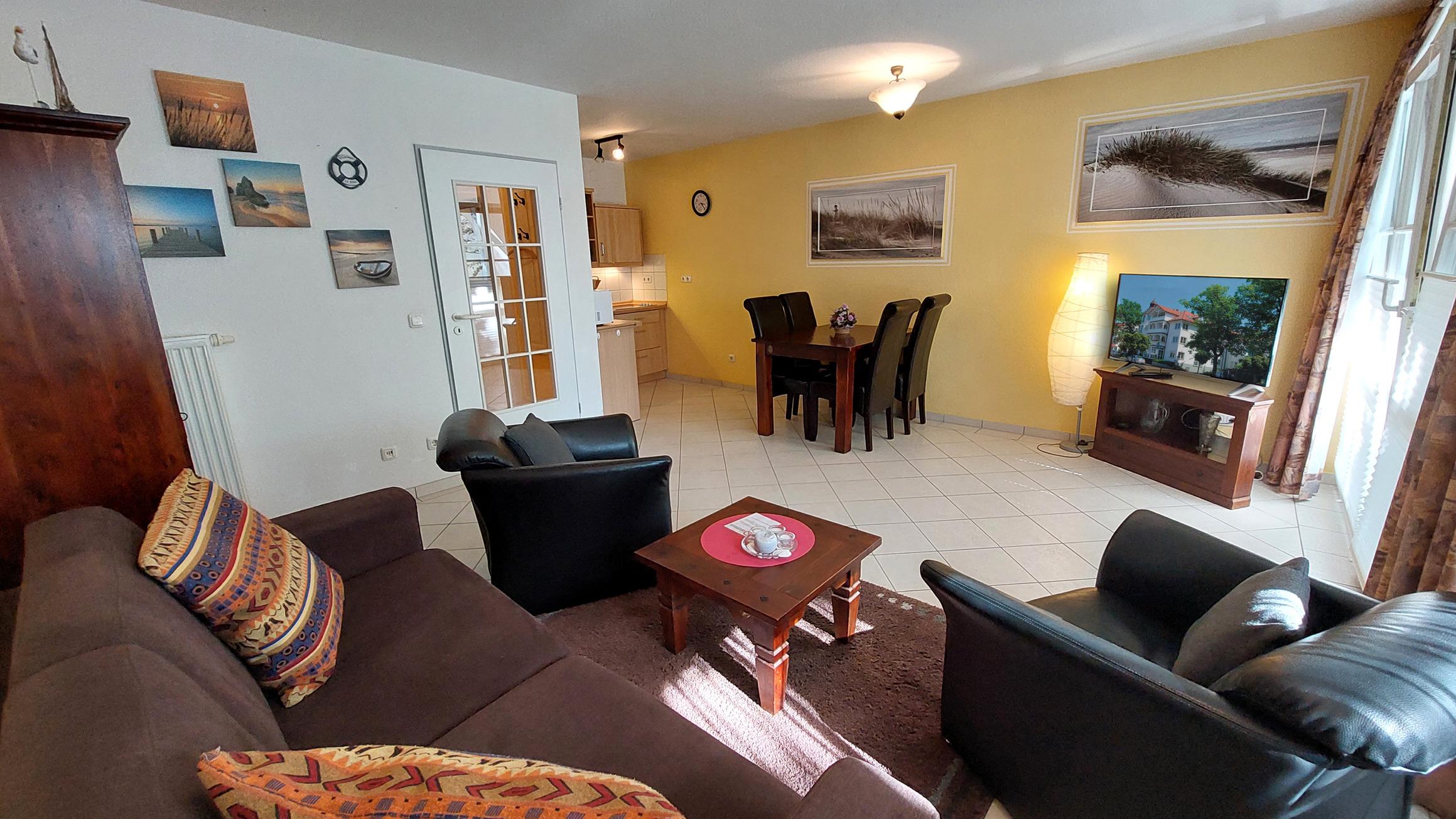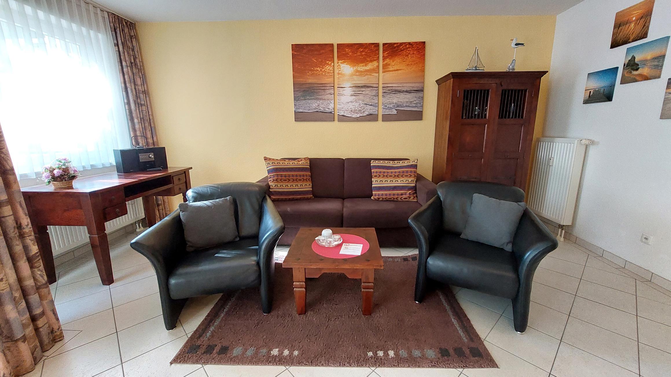 Im hellen Wohnbereich gibt eins eine gemütliche Sitzlandschaft mit 2 Sessel und einem Sofa (mit Schlaffunktion). Zu technischen Ausstattung gehört ein moderner Smart-TV und eine Stereoanlage.
