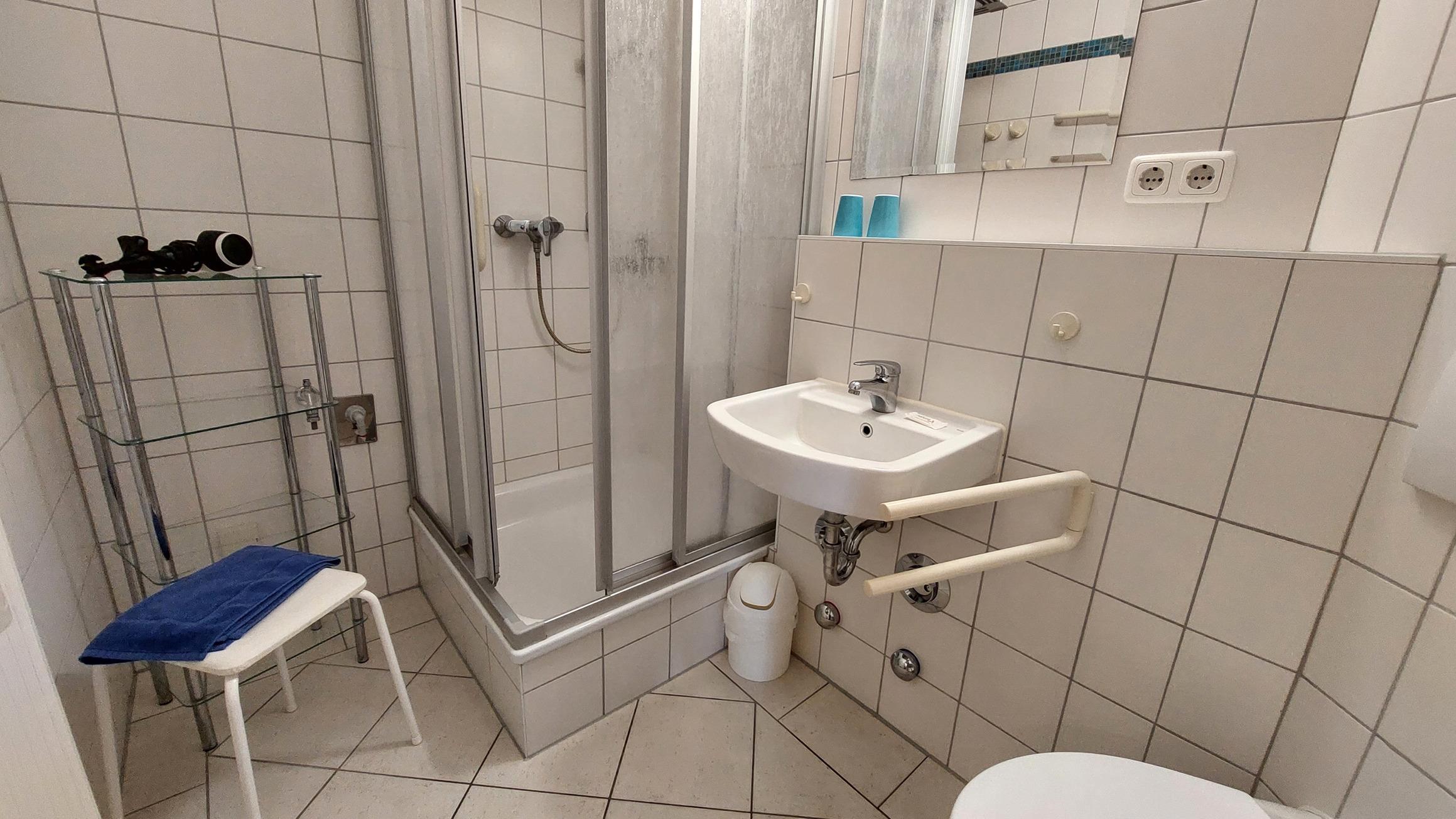 Das Badezimmer bietet ein WC, Waschtisch, Dusche sowie einen Fön.