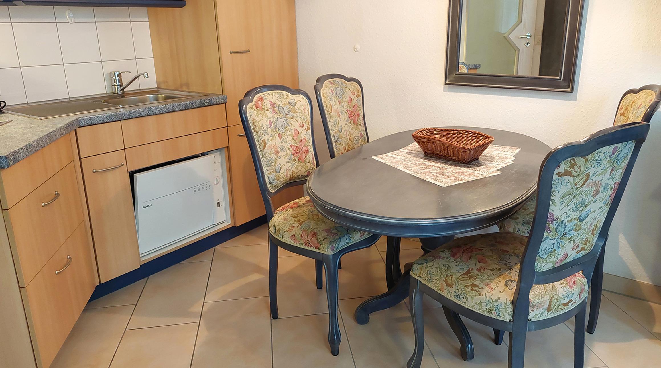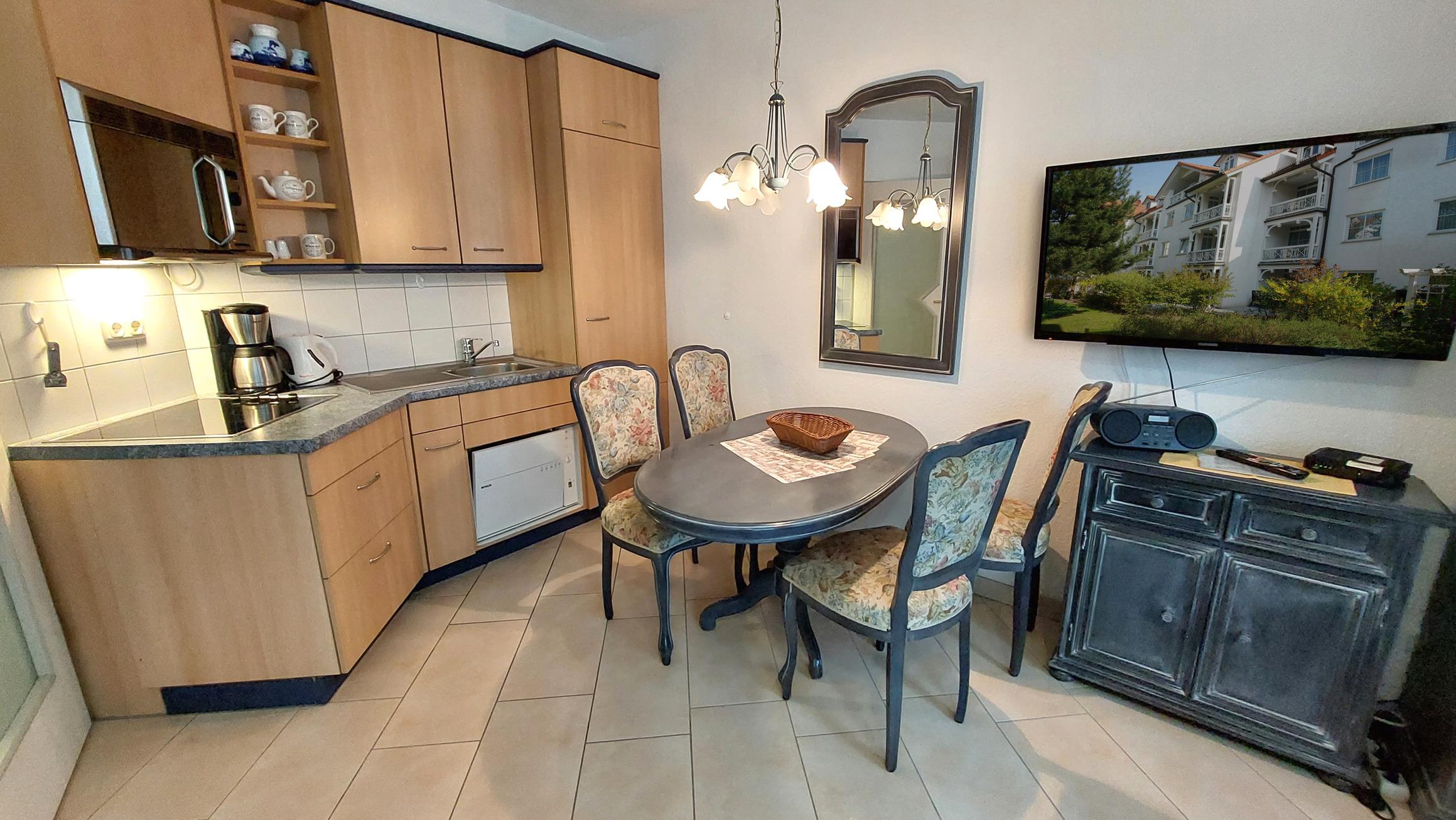 Die Ausstattung der Ferienwohnung umfasst eine Kaffeemaschine, eine Mikrowelle (samt Aufbackfunktion) sowie einen kleinen Geschirrspüler. Die offene Küche ist komplett ausgestattet und bietet alles, was Sie für die Zubereitung von Mahlzeiten benötigen.