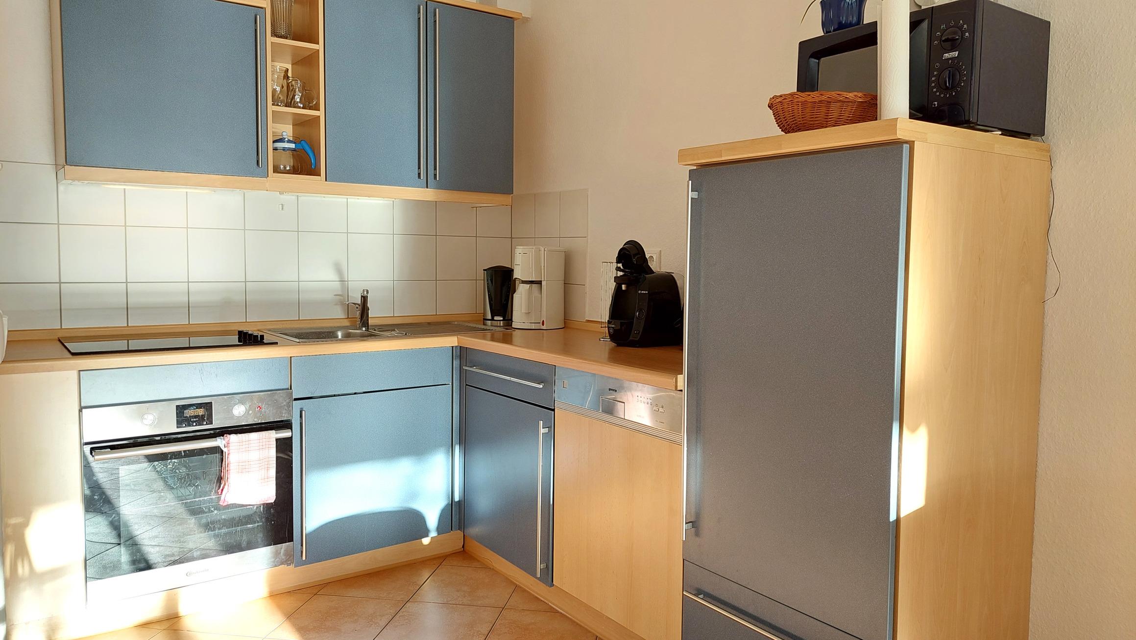 Der Esstisch bietet Platz für 4 Personen und die Küchenzeile mit Backofen, Ceranfeld, Mikrowelle, Geschirrspüler, Kühlschrank (mit Gefrierfach) läd auch im Urlaub zum Kochen ein.