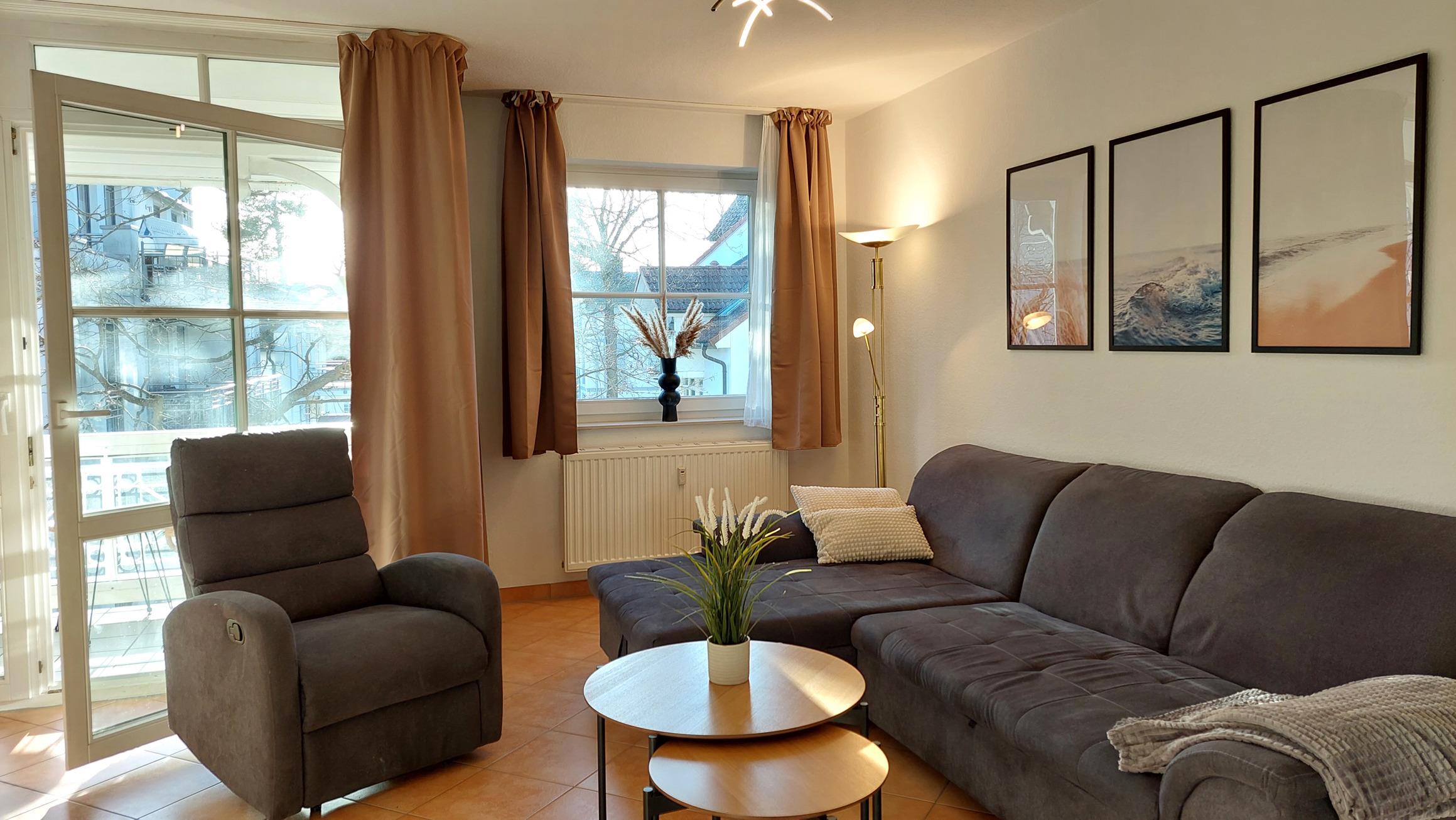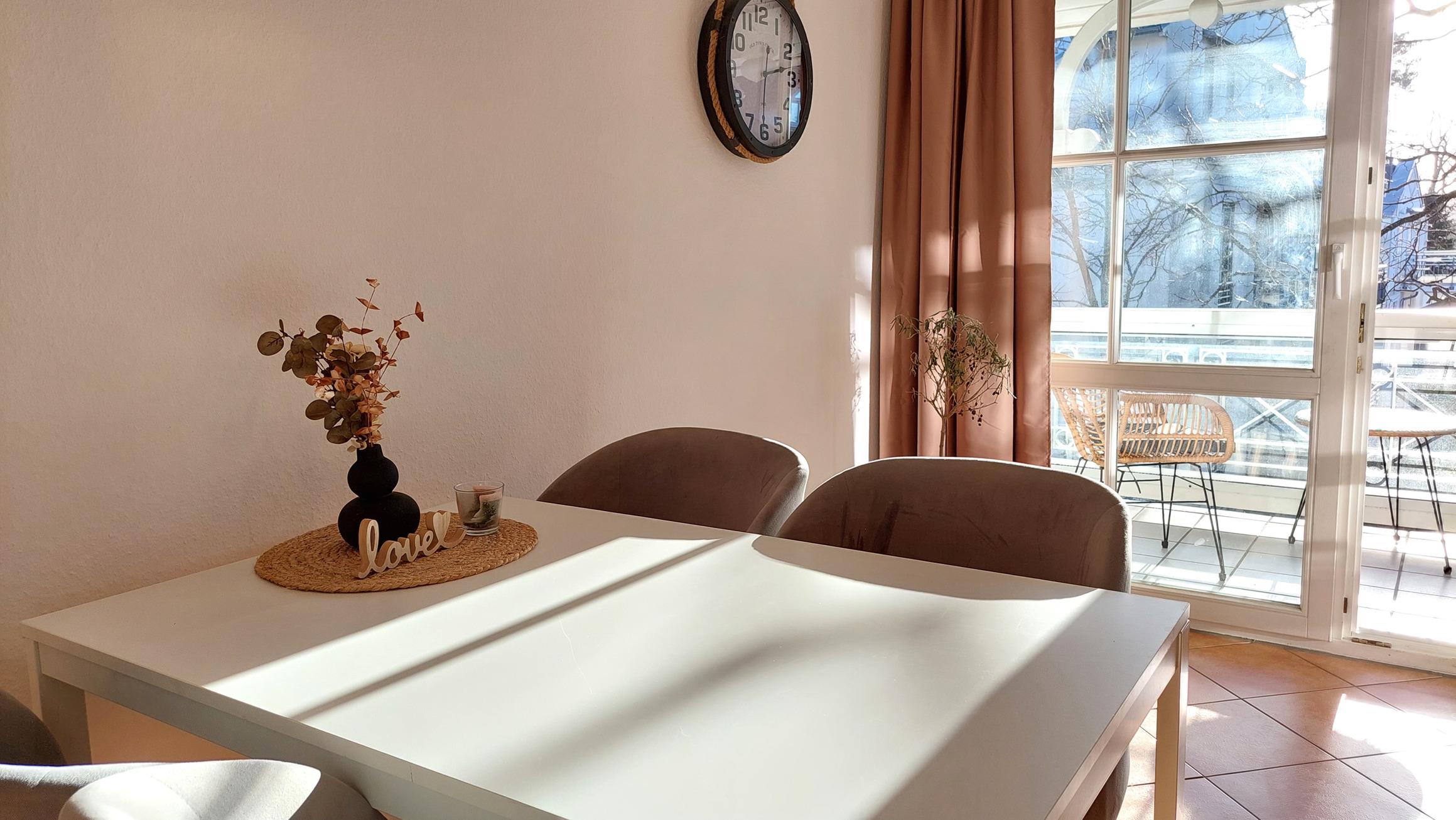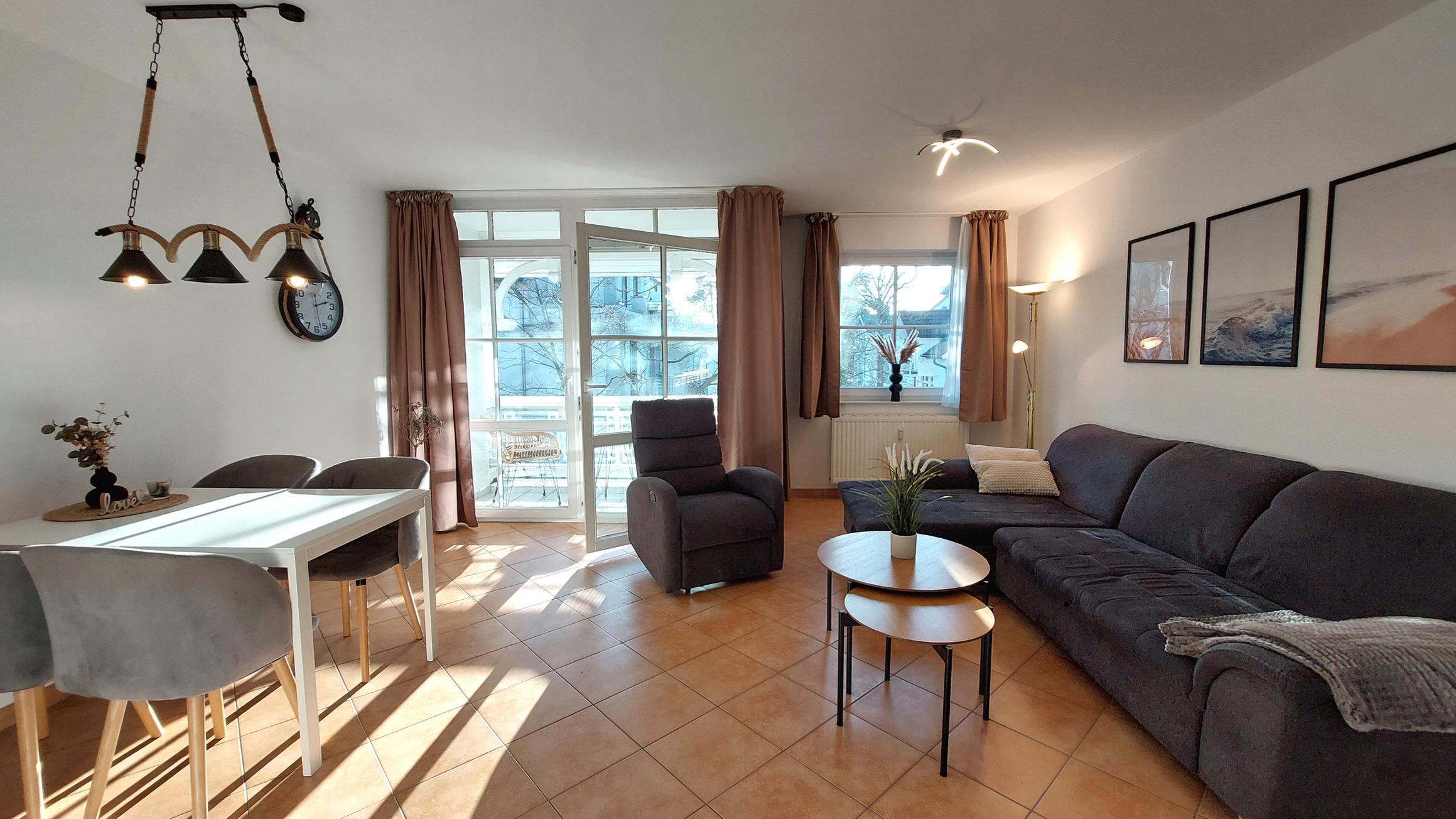 Highlight ist der große und lichtdurchflutete Wohn- und Essbereich mit Zugang auf den möblierten Südbalkon.