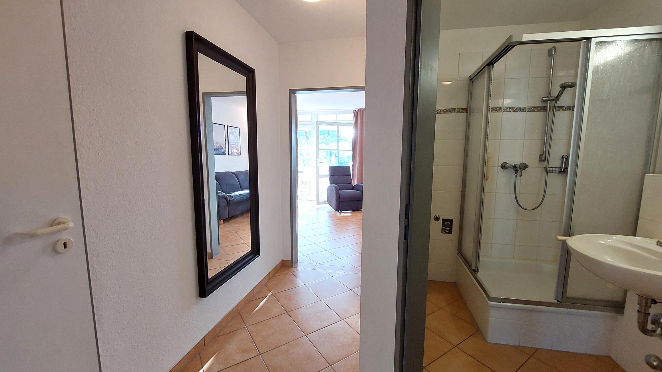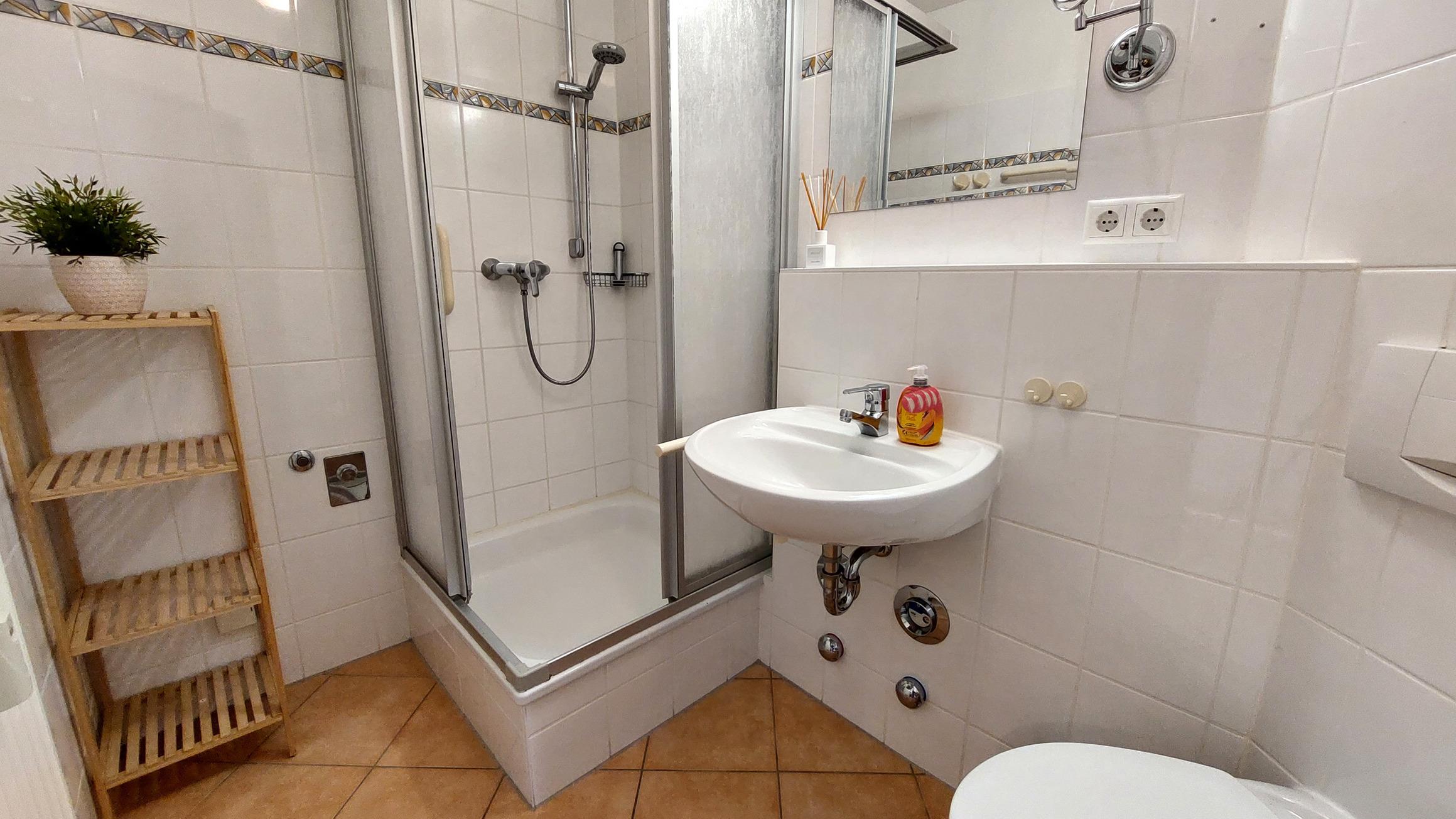 Das Badezimmer verfügt über WC, Waschbecken und Dusche,