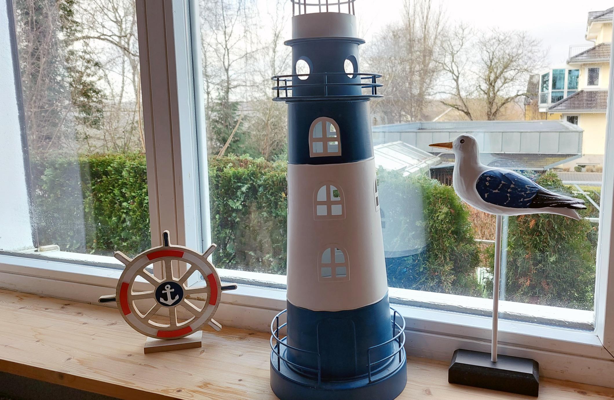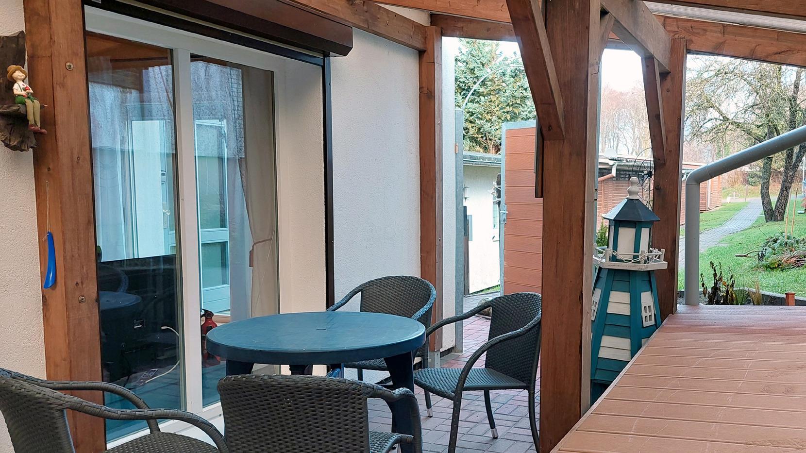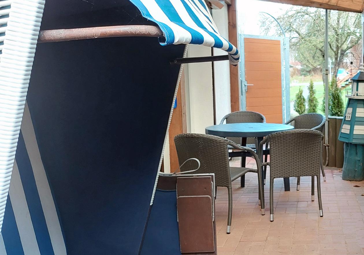 Von der Küche gelangt man direkt auf die große Terrasse in Holzoptik. Diese verfügt über einen Sitzbereich samt eigenen Strandkorb, der zum Verweilen einlädt.