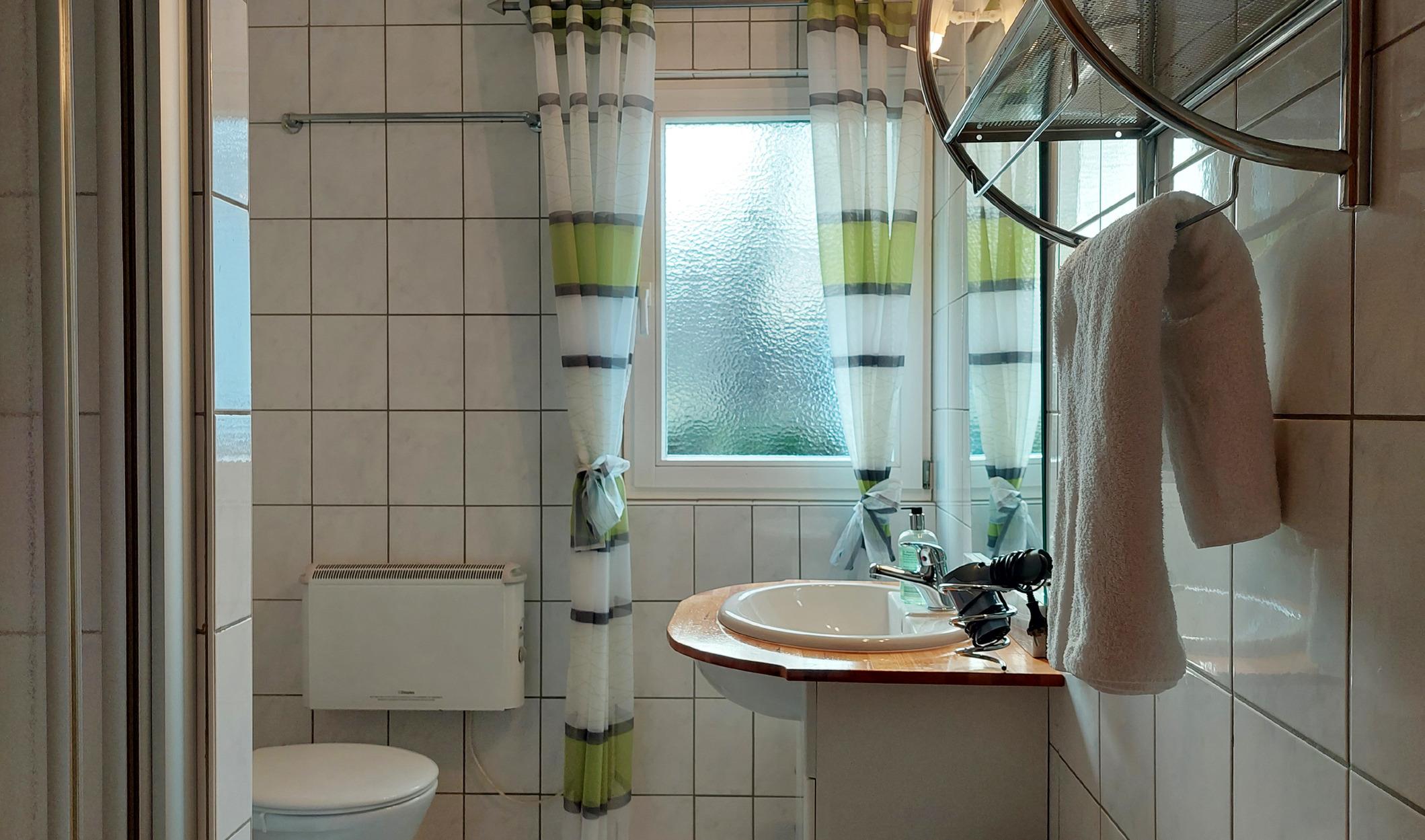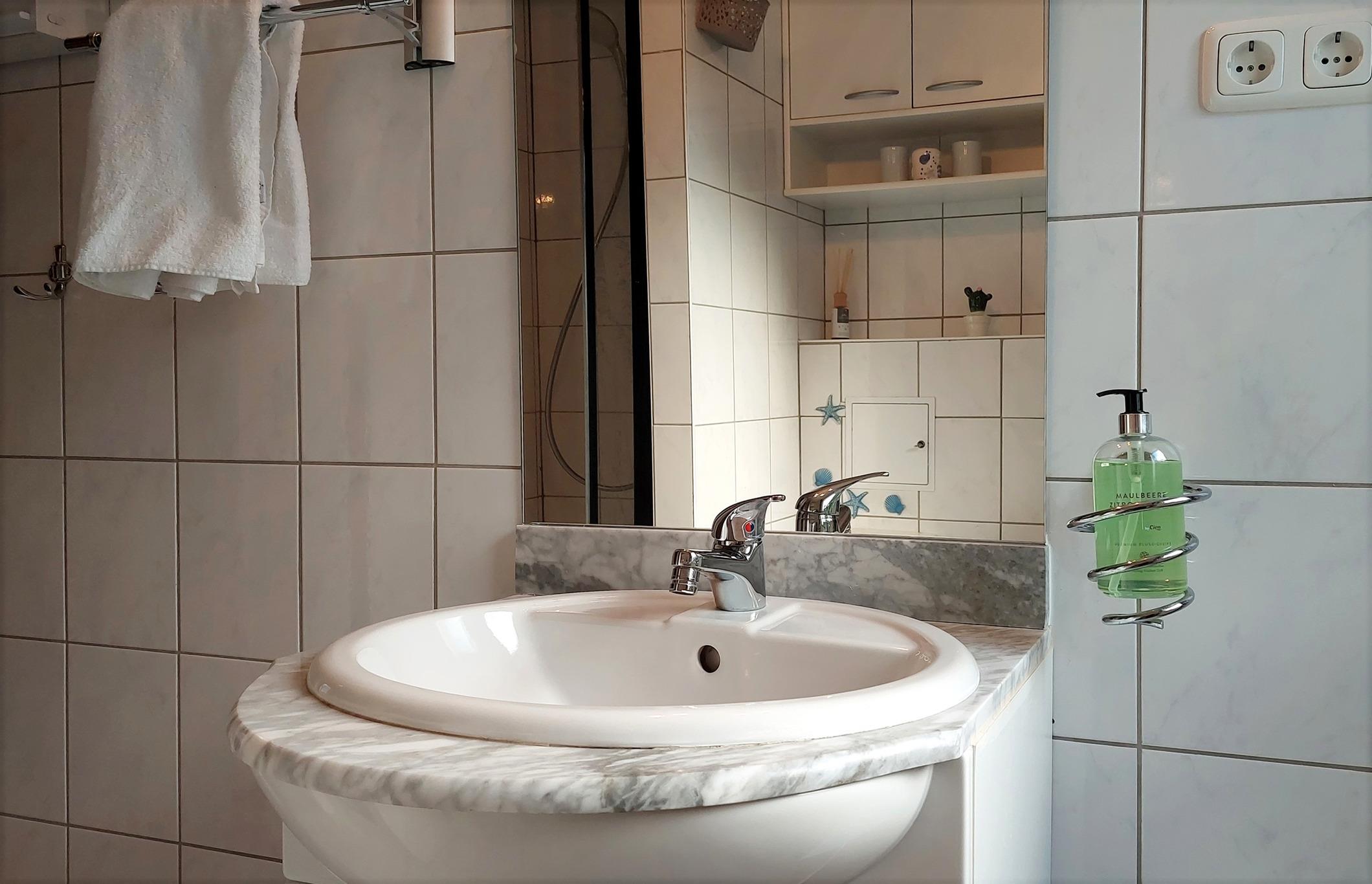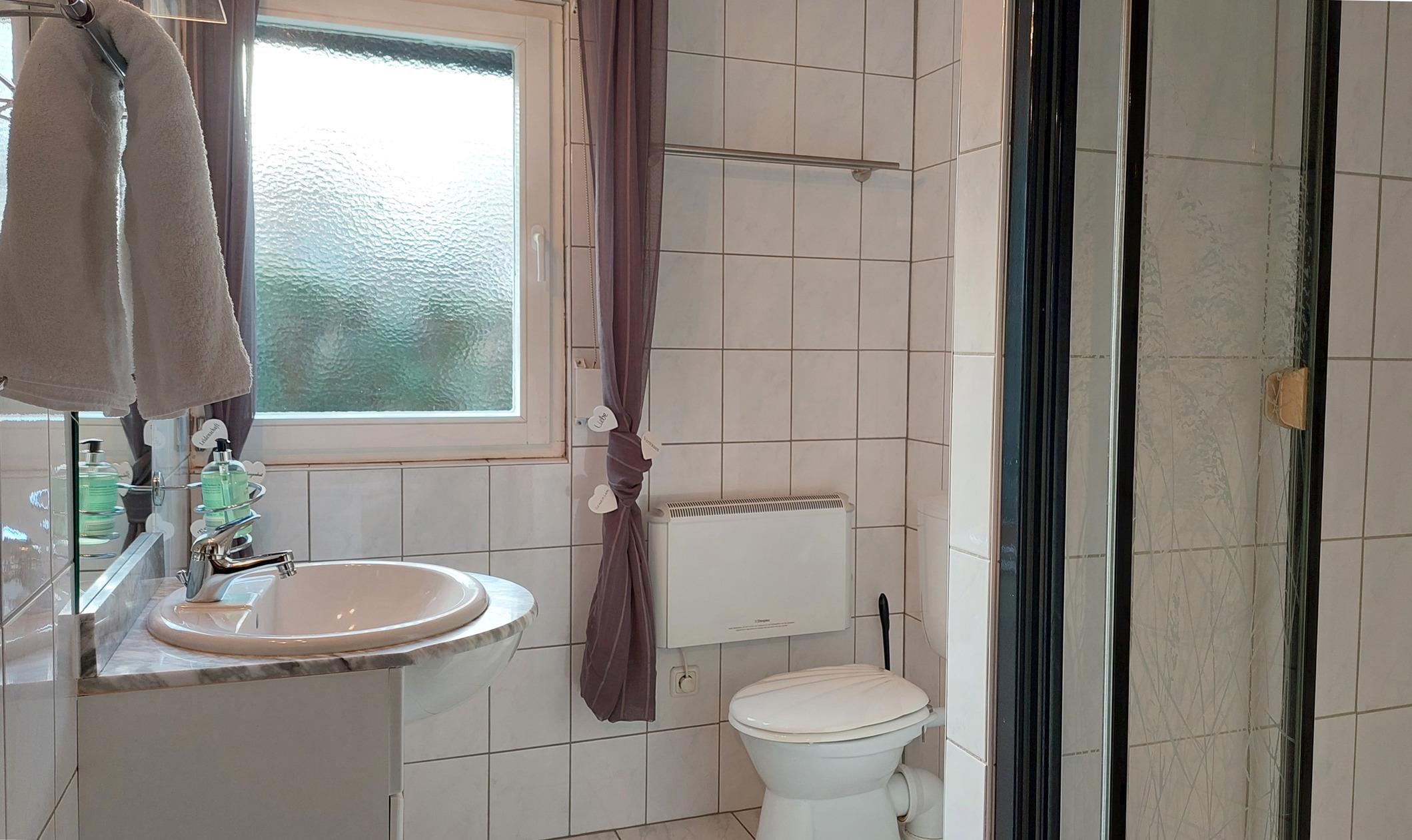 Angrenzend an beide Schlafräume befindet sich jeweils ein Badezimmer mit Dusche, WC und Waschbecken.