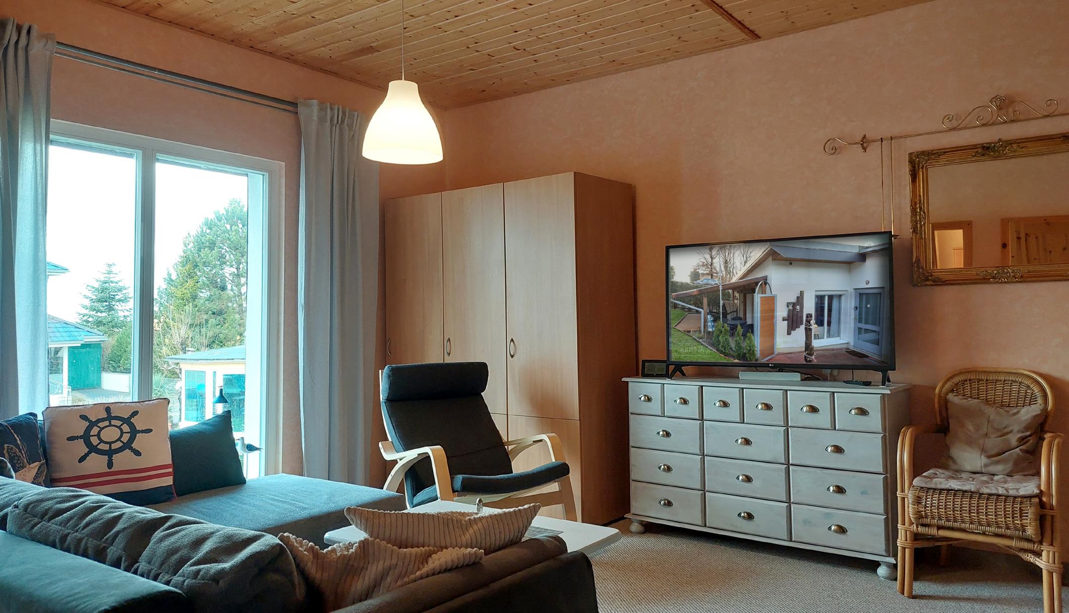 Das helle Wohnzimmer bietet Ihnen ein neues Sofa (mit Schlaffunktion), einen großen Flachbild-TV und einen tollen Ausblick ins Grüne durch die bodenhohe Fensterfront.