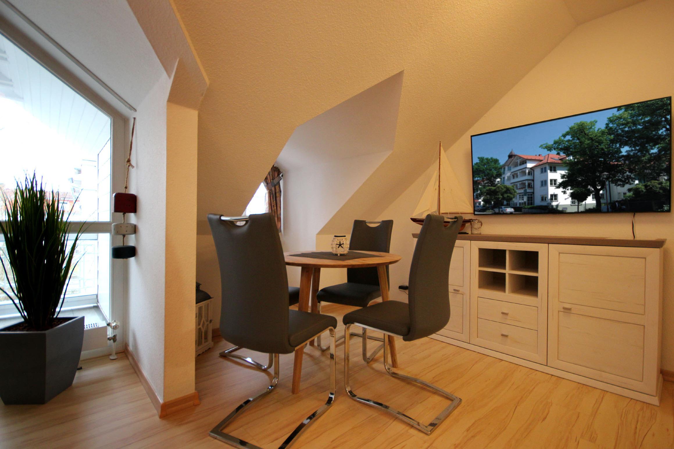 Ihre moderne 2-Zimmer-Nichtraucherwohnung 90805 Steuerbord hat eine Größe von ca. 40 qm und ist für bis zu 4 Personen eingerichtet. Sie befindet sich in der in der 2. Etage des Hauses und verfügt über einen überdachten Balkon nach Südosten sowie einen Stellplatz im nahegelegenen Parkhaus Granitz. Die helle und gemütliche Wohnung teilt sich auf in einen Wohnraum mit direktem Zugang zum möblierten Balkon sowie eine komplette Küchenzeile, ein Badezimmer, ein Schlafraum und Flur mit Garderobe. Im Wohnraum finden Sie neben der Sitzgruppe mit Schlaffunktion noch einen separaten Essplatz. Ein Flachbildfernseher mit SMART-Funktion sowie WLAN gehören zur technischen Ausstattung. Der Schlafraum ist mit einem Doppelbett und einem großzügigen Kleiderschrank ausgestattet. Das Badezimmer erwartet Sie mit einem Waschbecken, Dusche, Haartrockner und WC. Die Küchenzeile beinhaltet u.a. ein Cerankochfeld, Kühlschrank mit kleinem Gefrierfach, Backofen, Geschirrspüler, Kaffeemaschine, Wasserkocher, Toaster sowie umfangreiches Kücheninventar. Ein Kinderhochstuhl ist auf Anfrage und je nach Verfügbarkeit bereitstellbar.