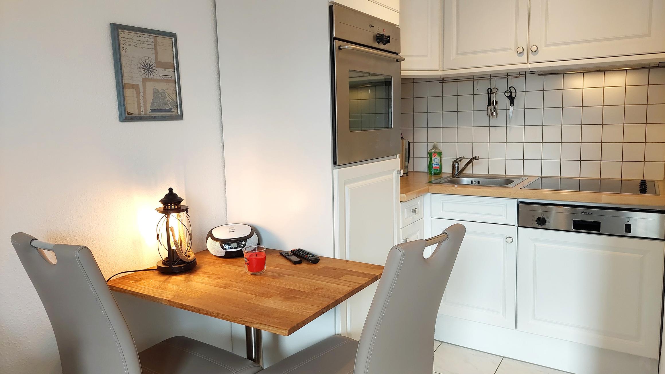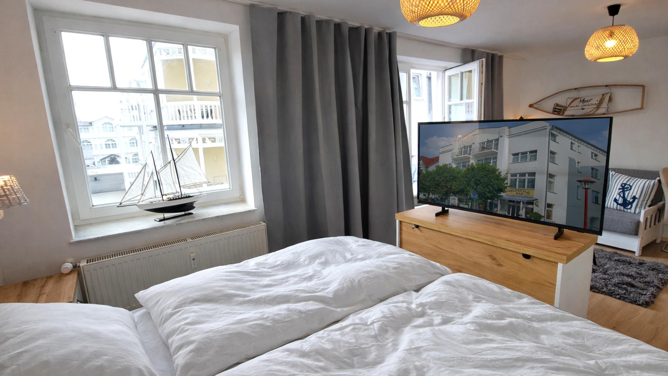 Das moderne Studio 23RB18 befindet sich im 2. Obergeschoss des Hauses Jahreszeiten und ist bequem per Aufzug erreichbar. Es wurde Anfang 2026 renoviert und neu möbliert. Im Flur befinden sich ein Kleiderschrank, eine Garderobe und ein Spiegel. Von dort aus gelangt man auch zum Badezimmer, das mit einer Dusche, einem WC und einem großen Waschtisch ausgestattet ist. Der kombinierte Wohn- und Schlafraum verfügt außerdem über einen Essbereich mit voll ausgestatteter Küchenzeile, bestehend aus einem Cerankochfeld, einem Backofen, einer Mikrowelle, einem Geschirrspüler und einem Kühlschrank mit Gefrierfach.