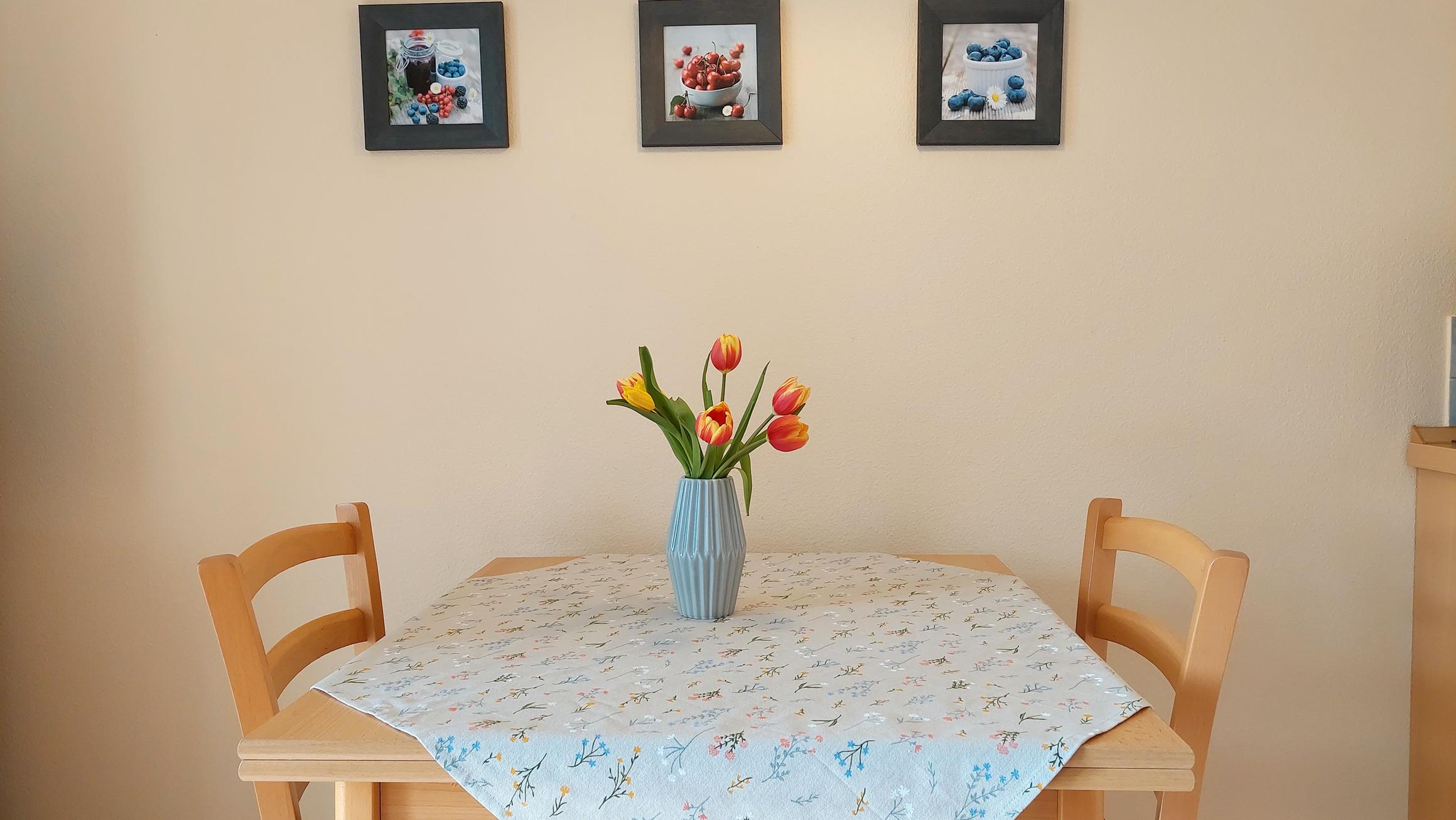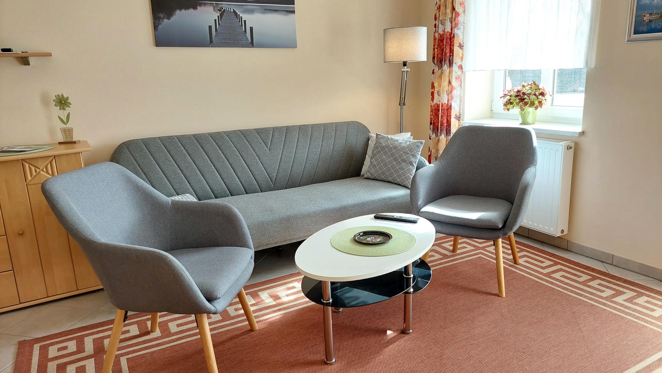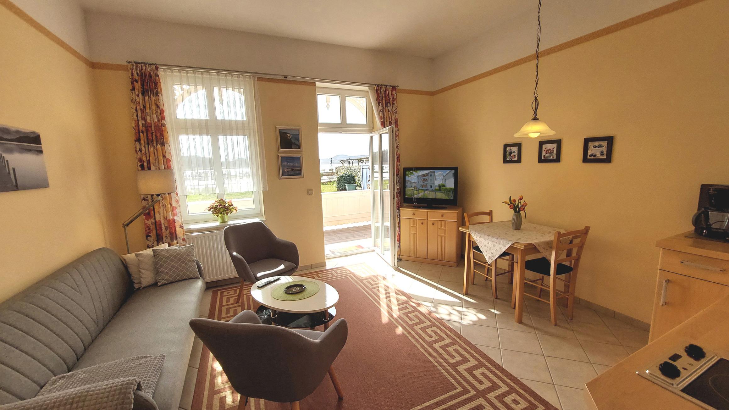 Die Ferienwohnung 90963 befindet sich im Erdgeschoss eines Hauses und ist für Nichtraucher geeignet. Sie verfügt über 2 Terrassen und einen Parkplatz direkt vor dem Eingang. Im Vorflur gibt es eine Garderobe sowie genug Platz für zwei Fahrräder. Die Wohnung besteht aus einem großen Durchgangsschlafzimmer, das durch einen Raumteiler getrennt ist. Es gibt ein Doppelbett, Nachttische und Zugang zur Terrasse Richtung Pestalozzistraße, perfekt für ein sonniges Frühstück. Der Flurbereich bietet außerdem einen Einbaukleiderschrank und Zugang zum Badezimmer und zum Wohn- und Esszimmer. Das Badezimmer hat Tageslicht und ist ausgestattet mit einer Dusche, WC, Waschtisch, Kosmetikspiegel, Handtuchhalterung und Fußbodenheizung. Es gibt auch eine praktische Abstellecke für Gepäckstücke. Der Wohnbereich verfügt über eine gemütliche Sitzlandschaft mit Sofa und zwei Sesseln. Zur technischen Ausstattung gehören WLAN, ein CD-Player und ein Flachbild-TV. Der Essbereich ist mit einer Küchenzeile ausgestattet, die aus einem 2-Platten-Cerankochfeld, einer Mikrowelle und einem Kühlschrank mit Gefrierfach besteht. Die zweite Terrasse ist ebenfalls möbliert, umfriedet und überdacht, und bietet dazu einen schönen Blick auf den Schmachter See.