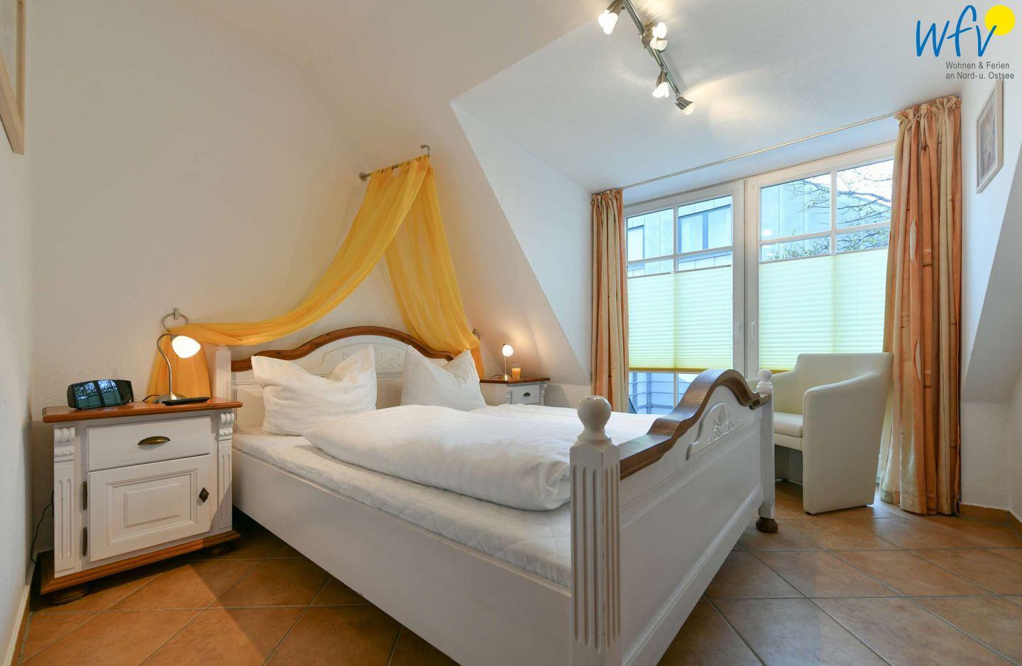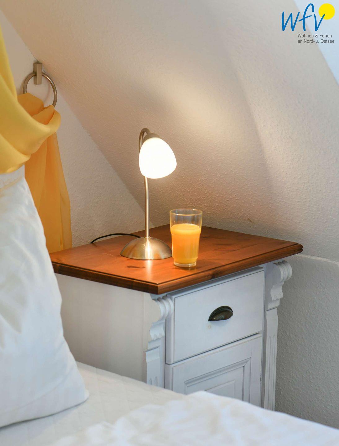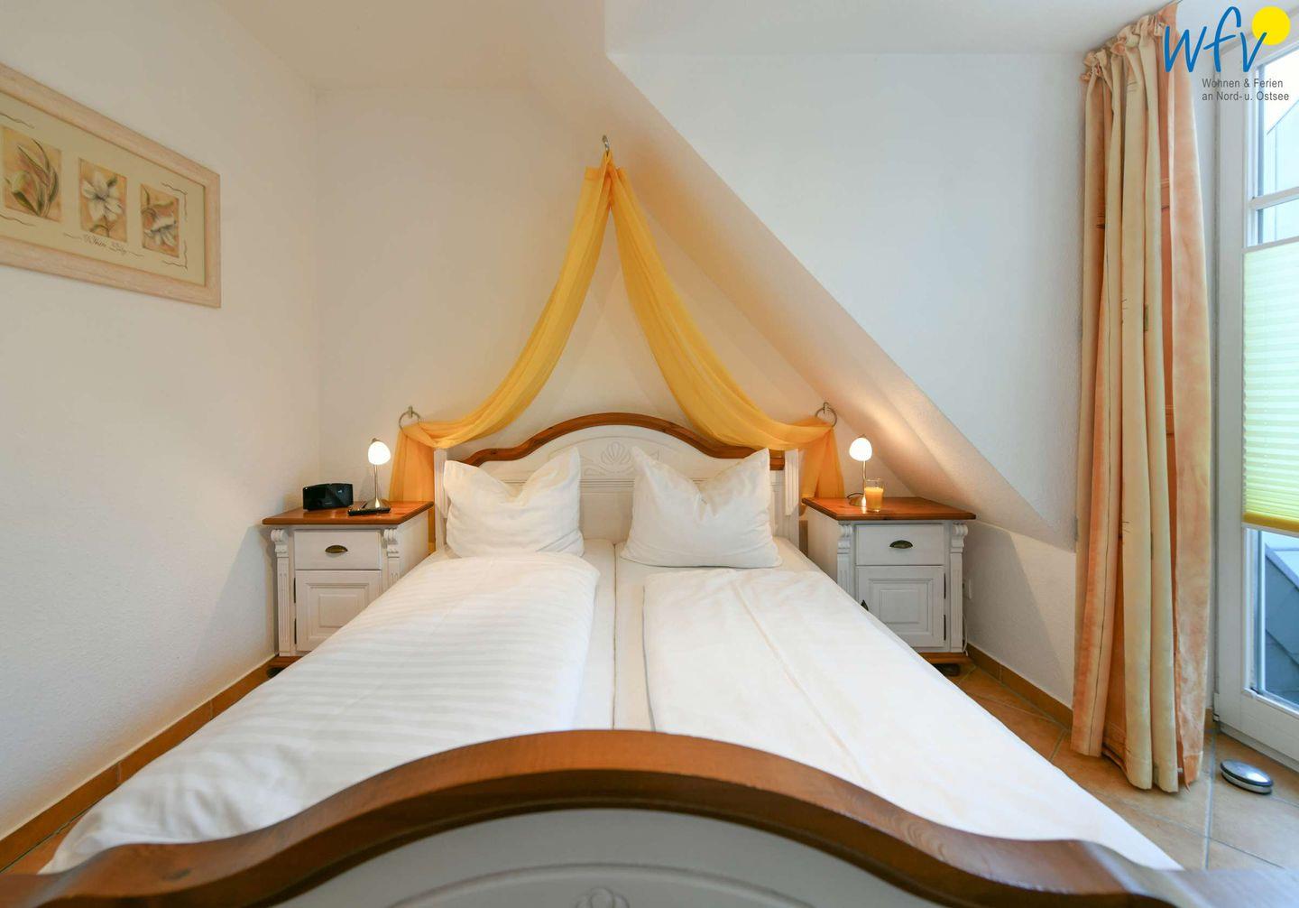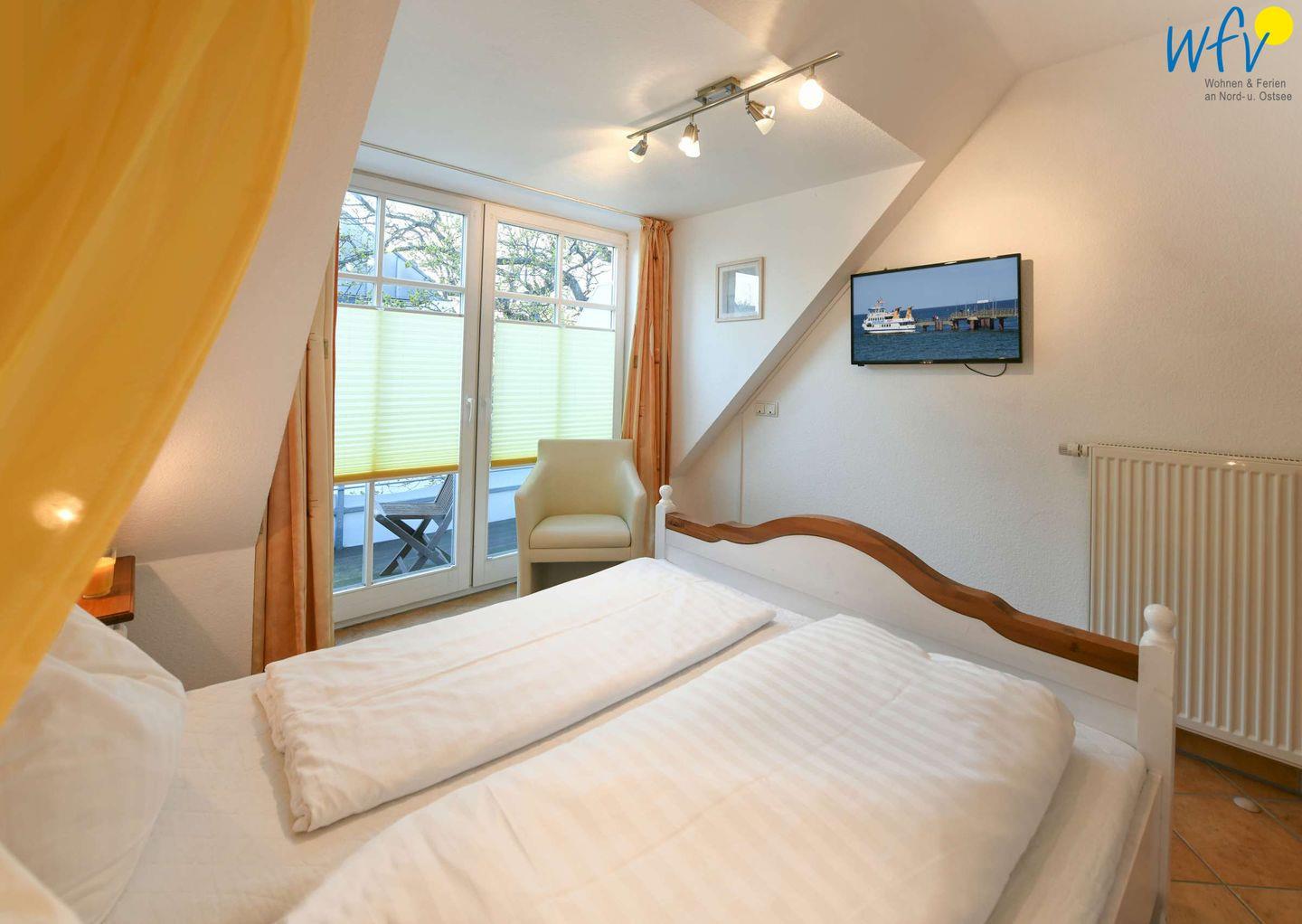 Wenn die Sonne auf Rügen untergeht und es Zeit zum Ruhen wird, wartet in dem separaten Schlafzimmer ein bequemes Doppelbett (180 cm x 200 cm) auf Sie. Auch hier können Sie fernsehen. Zwei weitere Personen finden Platz auf der Schlafcouch im Wohnraum. Für unsere kleinen Gäste ist ein Babybett vorhanden.