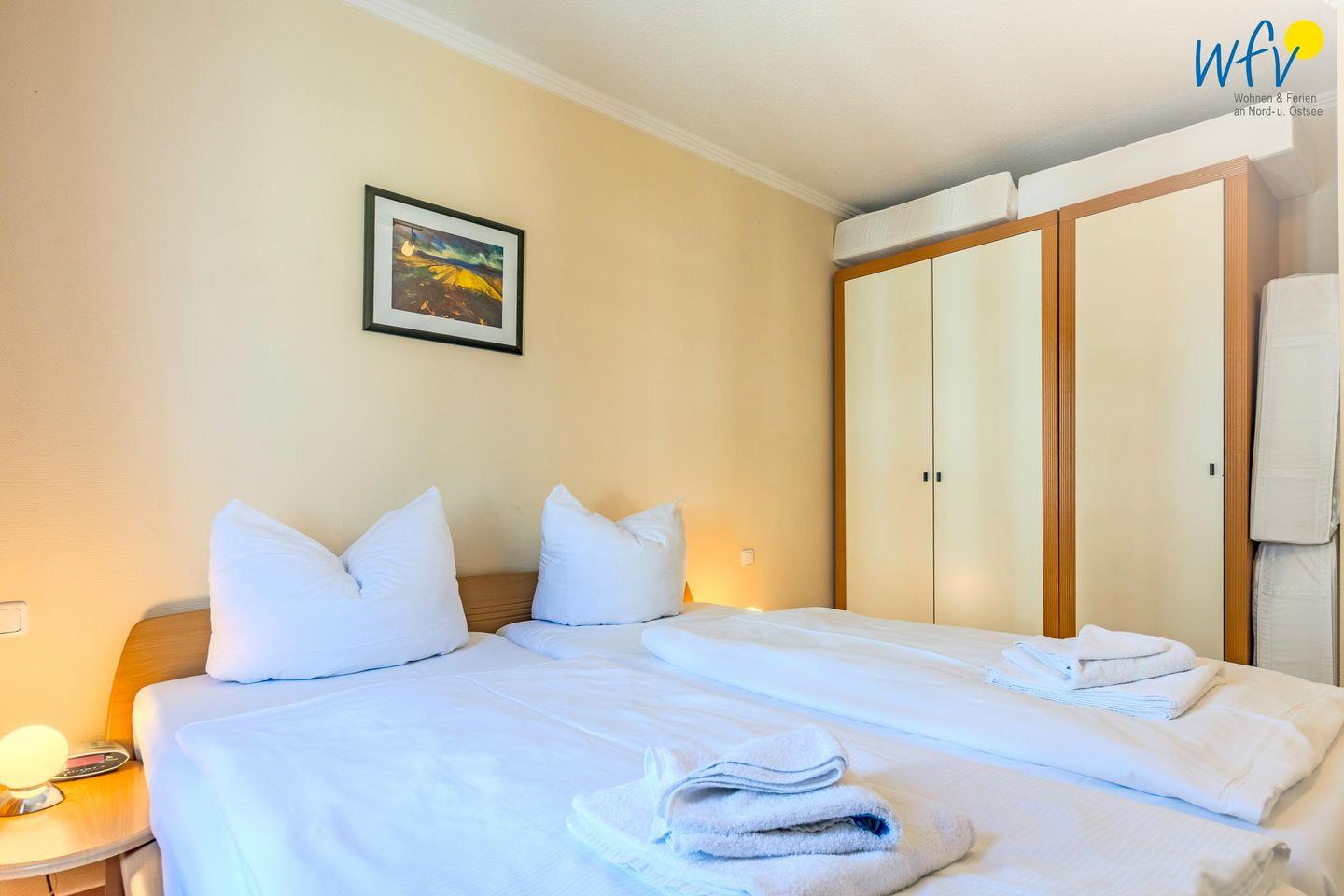Das separate Schlafzimmer ist mit einem komfortablen Doppelbett (1,80 x 2 m) ausgestattet. Das Sofa im Wohnraum kann in ein gemütliches Bett für zwei weitere Personen umfunktioniert werden (1,40 m x 2m).
