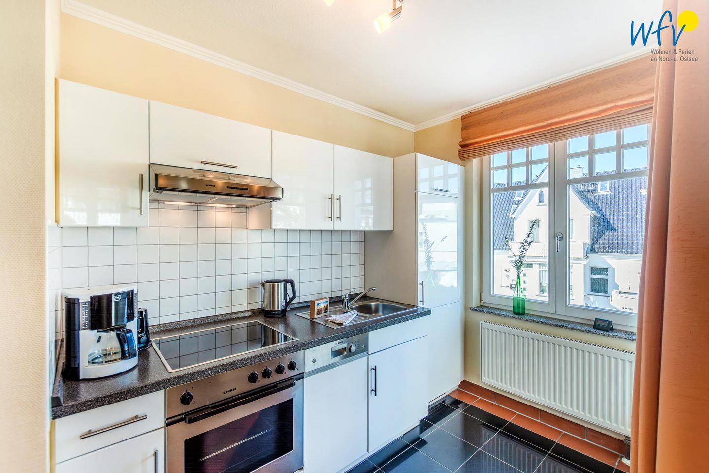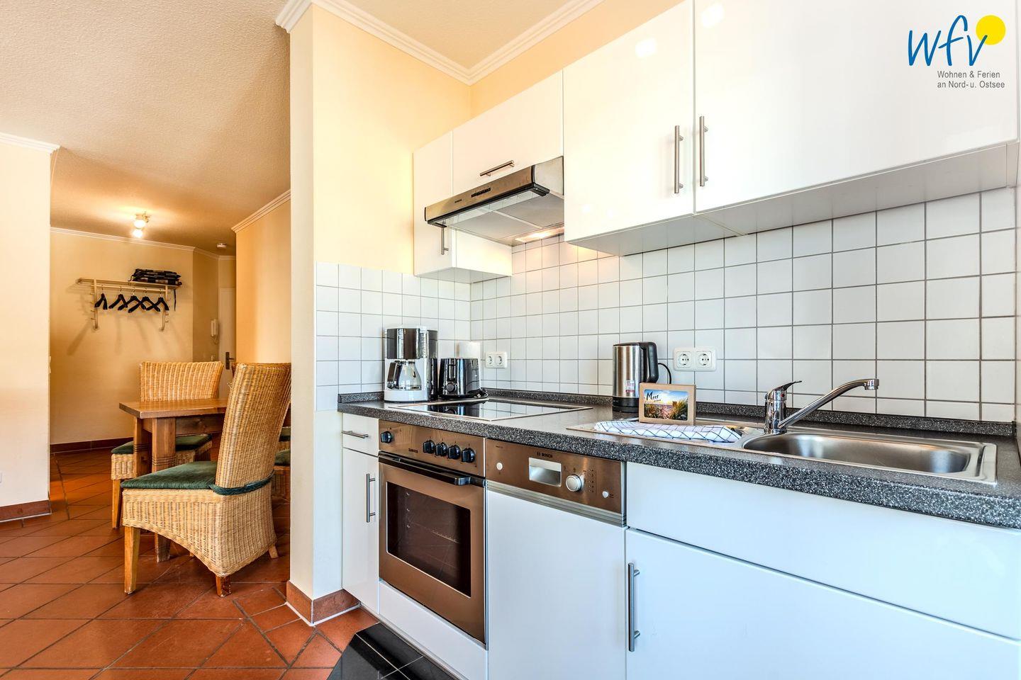 Für die bequeme Selbstverpflegung verfügt die moderne Küchenzeile u.a. über ein Cerankochfeld mit Backofen sowie über diverse Kleingeräte. Den Abwasch erledigt die Spülmaschine für Sie.