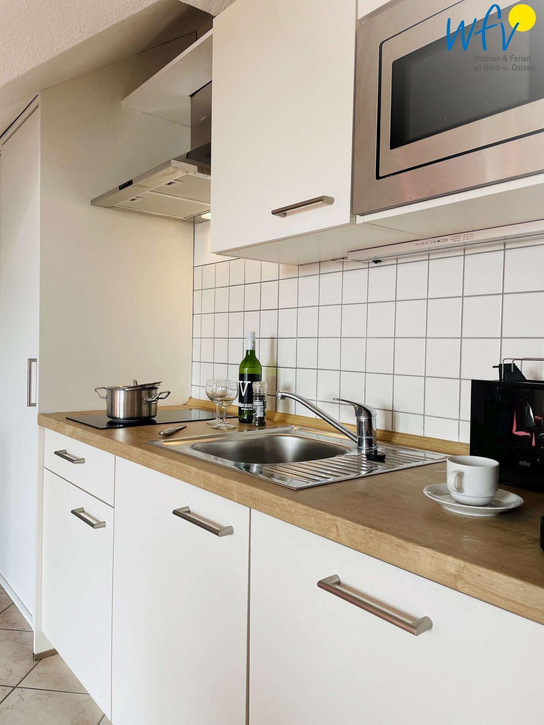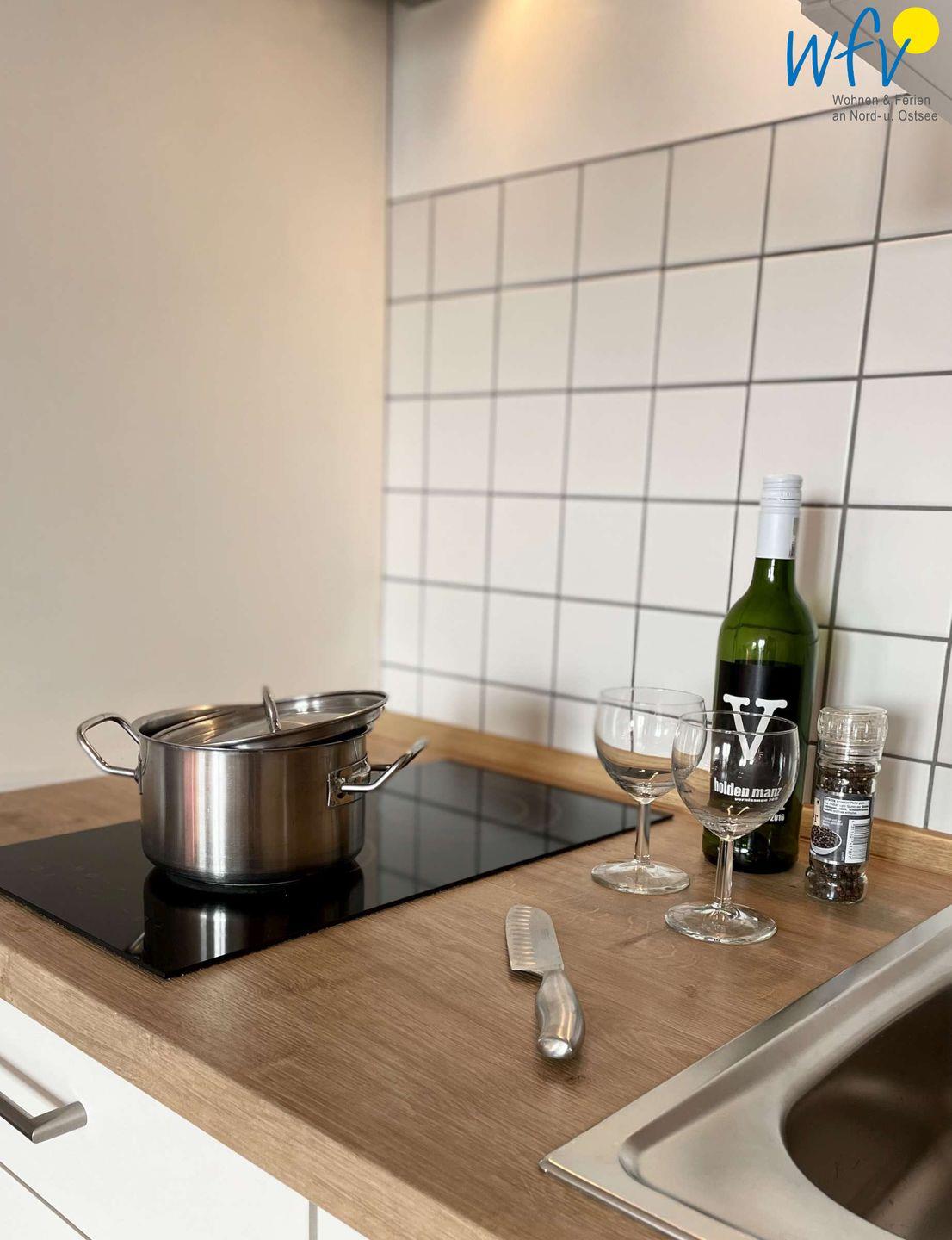 Für warme Frühstückseier, den Snack zwischendurch oder das leckere Abendessen ist die offene Küchenzeile der Ferienwohnung bestens ausgestattet. Sie verfügt u.a. über einen 2-Platten-Ceranherd, eine Mikrowelle und eine Spülmaschine. Kaffeeliebhaber können zwischen einer klassischen Kaffeemaschine und einem Vollautomaten mit Kapseln wählen.