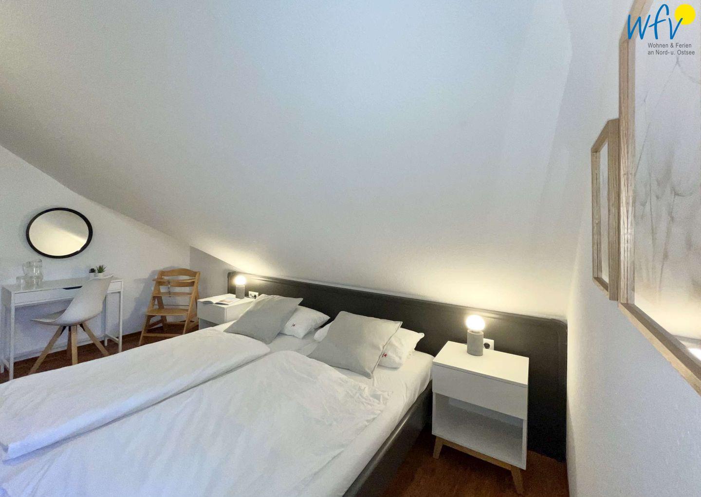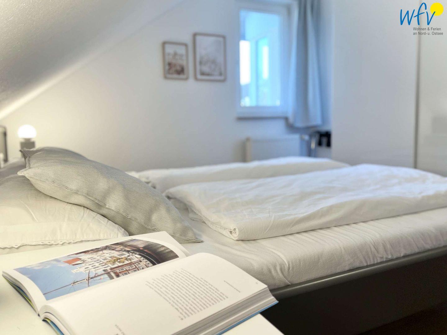 Wenn auf Rügen die Sonne untergeht, wartet in dem separaten Schlafzimmer ein komfortables Doppelbett auf Sie (2 m x 1,80 m). Für eine angenehme Nachtruhe bestehen selbstverständlich Verdunkelungsmöglichkeiten.