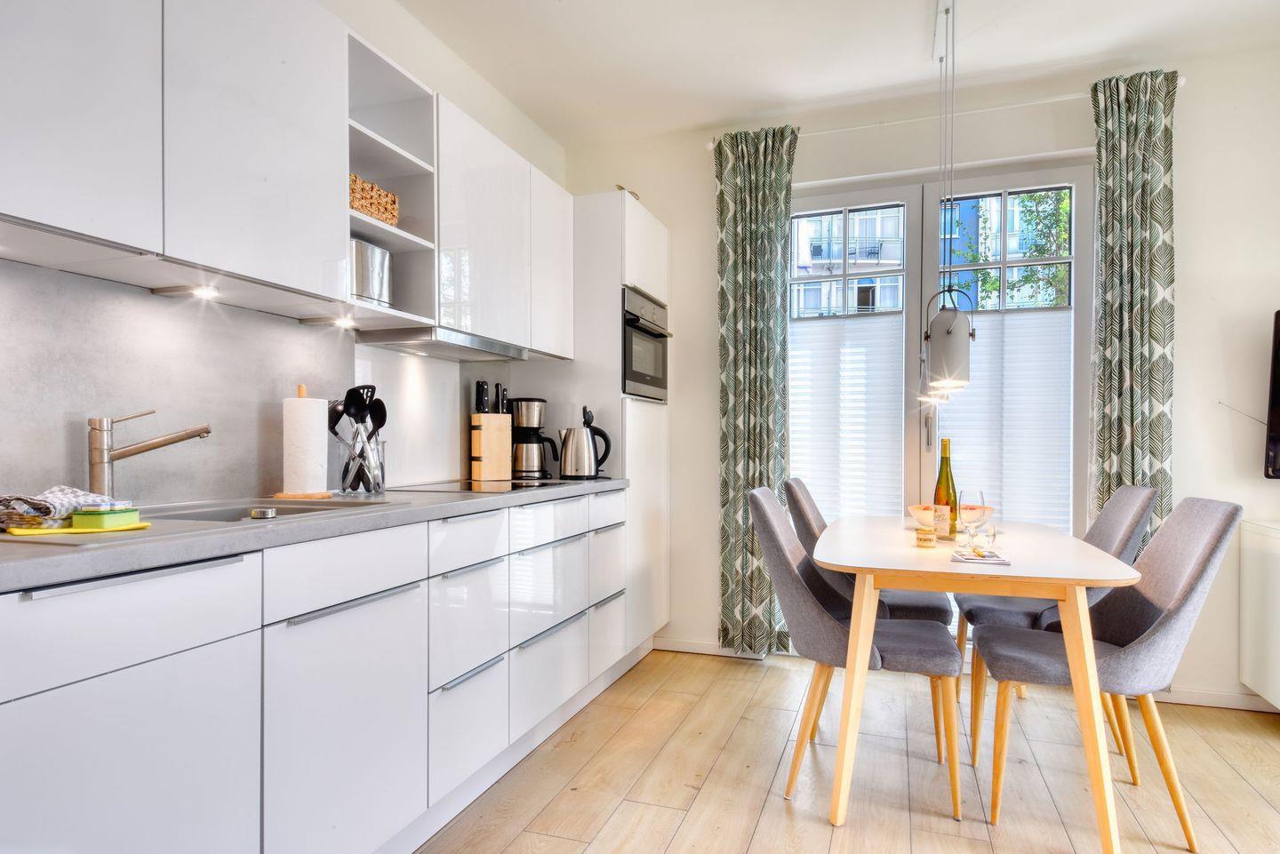 am Holztisch. Die Wohnung ist im elegant-skandinavischen Stil eingerichtet. Das