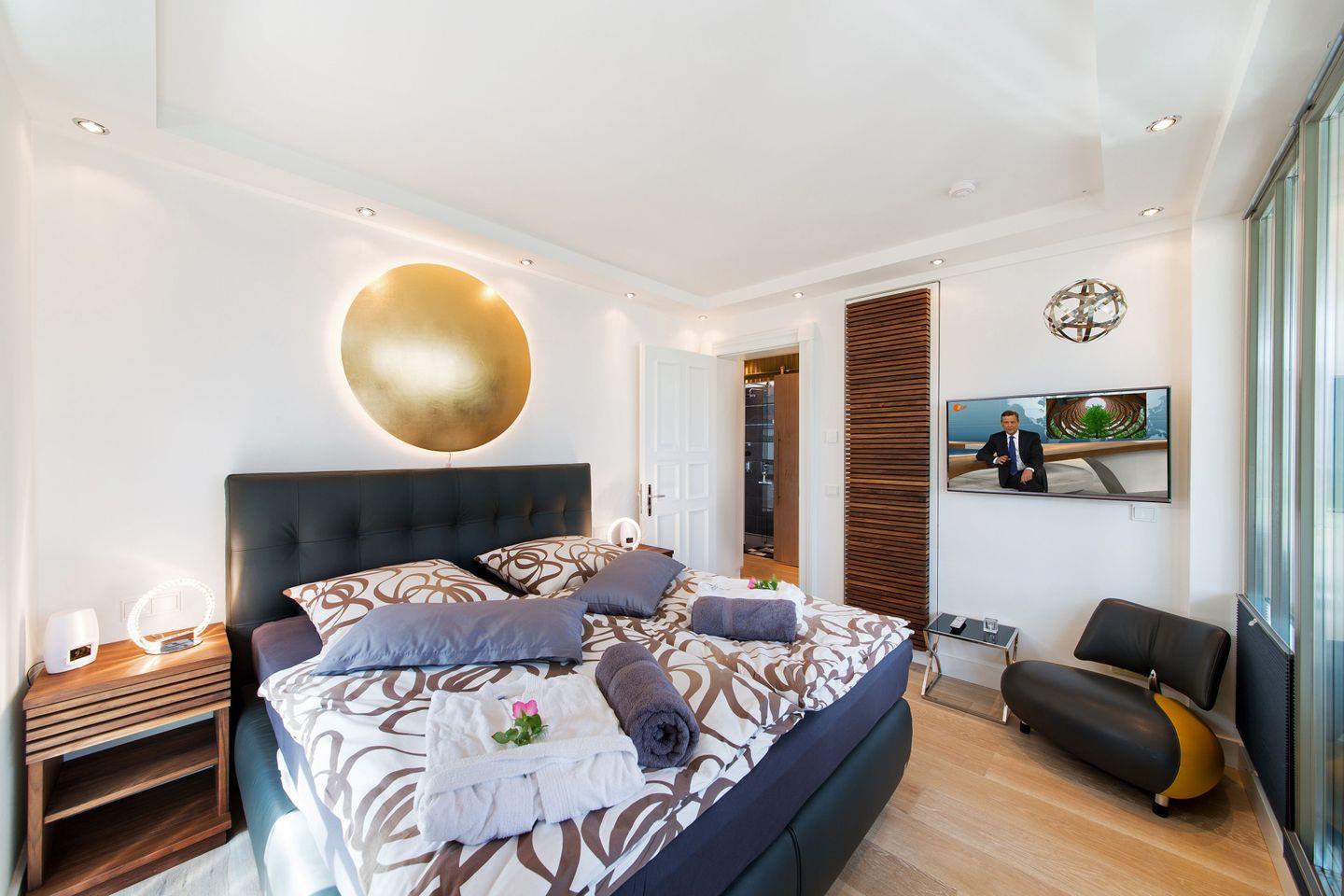 Beide Schlafzimmer haben Zugang zum Balkon und verfügen über ein bequemes Doppelboxspringbett mit hohem Schlafkomfort. Ein Sessel, Smart-TV und Ablagemöglichkeiten für Kleidung sind in beiden Räumen vorhanden. Beide Schlafzimmer sind verdunkelbar. Es gibt 2 Badezimmer mit ebenerdiger Regendusche, Waschtisch und WC. Die Sauna ist in das Masterschlafzimmer mit großer Glasfläche integriert. Die Intrarotkabine befindet sich in dem größeren Badezimmer.