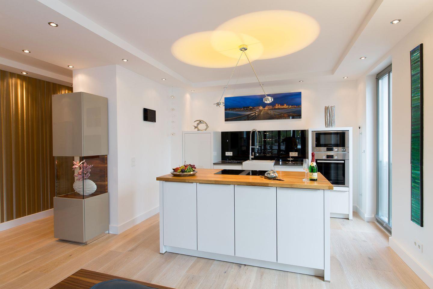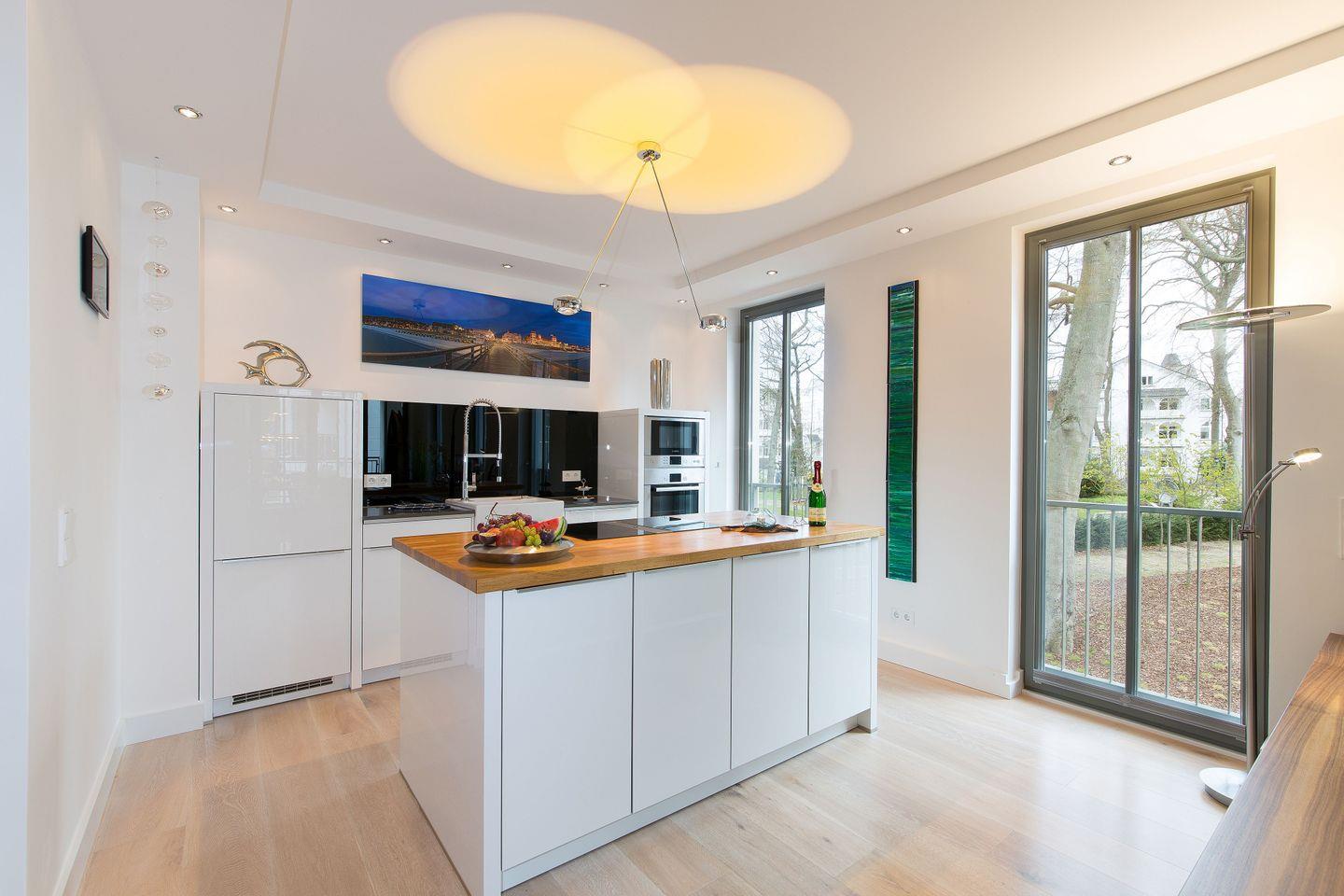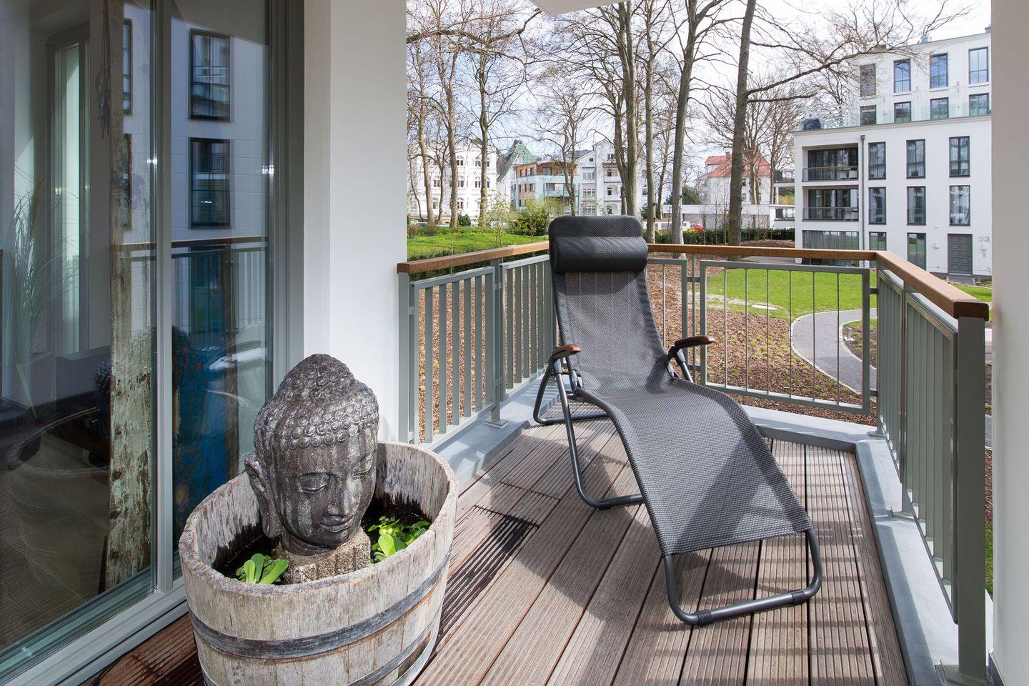 Die lichtdurchflutete Wellness-Suite beeindruckt mit 120m² Wohnfläche, eigener Sauna und Infrarotkabine. Das Appartement hat bodentiefe Balkonfenster in allen Räumen und man kann von den beiden Schlafzimmern und vom Wohnraum aus auf die zur Wohnung gehörenden Balkone gehen. Die Ferienwohnung "Meine Auszeit" ist mit edlen Möbeln von beispielsweise Rolf Benz, Joop!, Leicht und Hülsta ausgestattet. Die Badarmaturen sind von der Marke Dornbracht. Der Eingangsbereich ist mit Garderobenschrank und Schuhschrank ausgestattet und bietet einen ersten Blick in den offenen und stylisch eingerichteten Wohn- und Essbereich. Die Küche ist voll ausgestattet, auch ein Weinkühlschrank mit zwei Kühlzonen steht unseren Gästen zur Verfügung. Eine große Kücheninsel ist ideal, um einen geselligen Kochabend zu veranstalten. WLAN ist in allen Räumen kostenfrei verfügbar.
