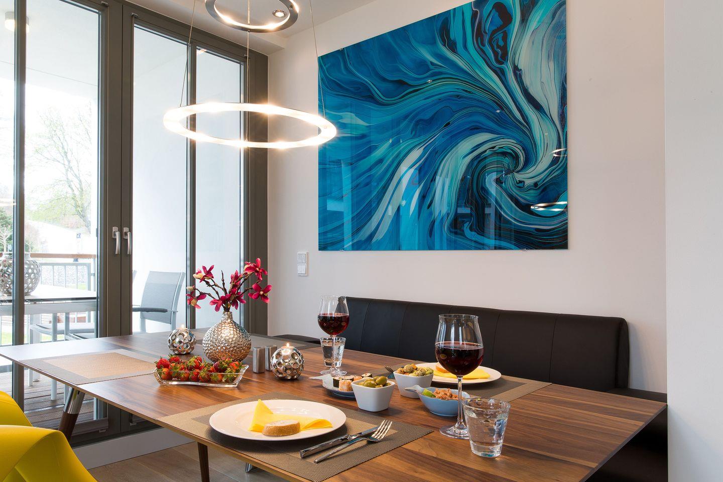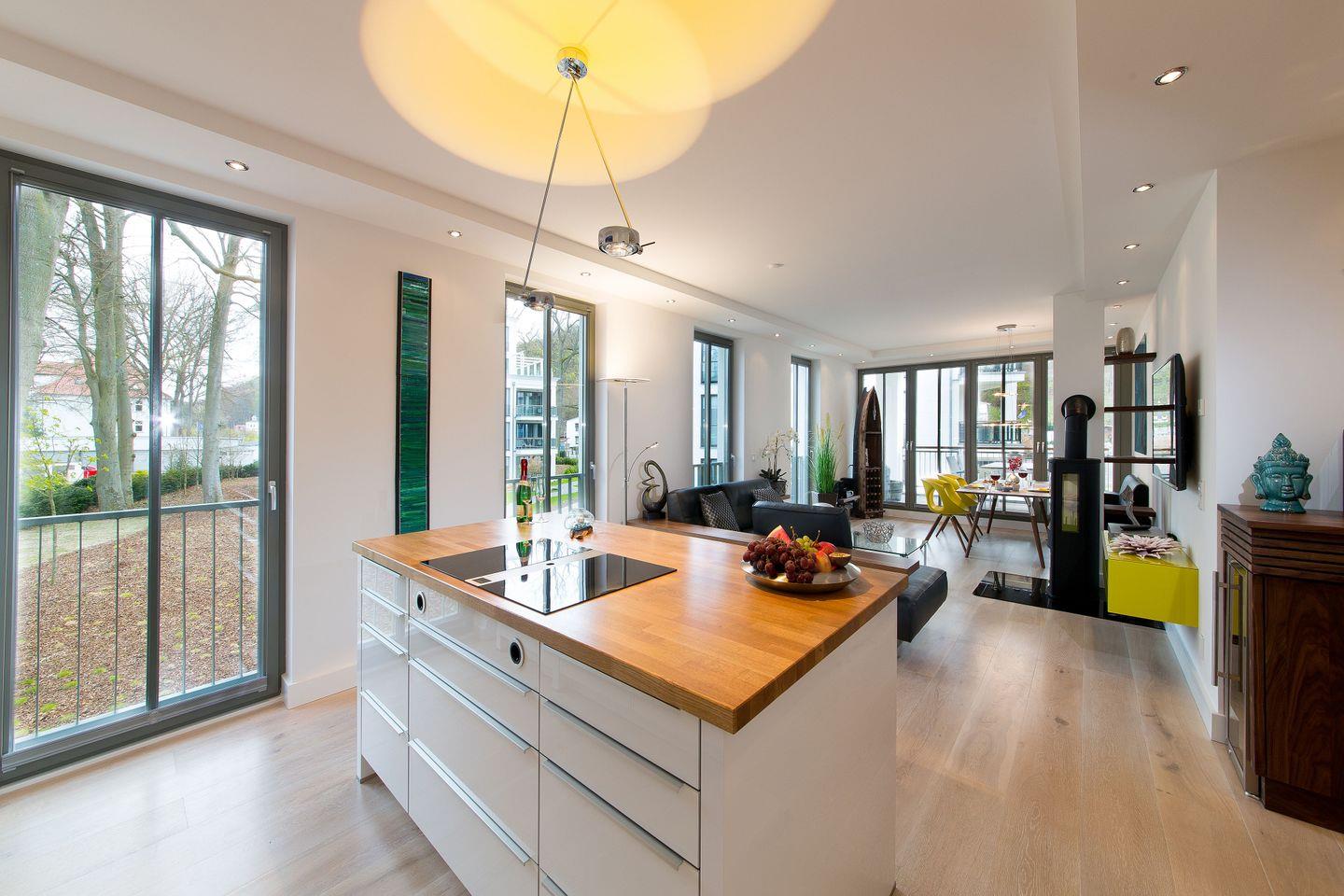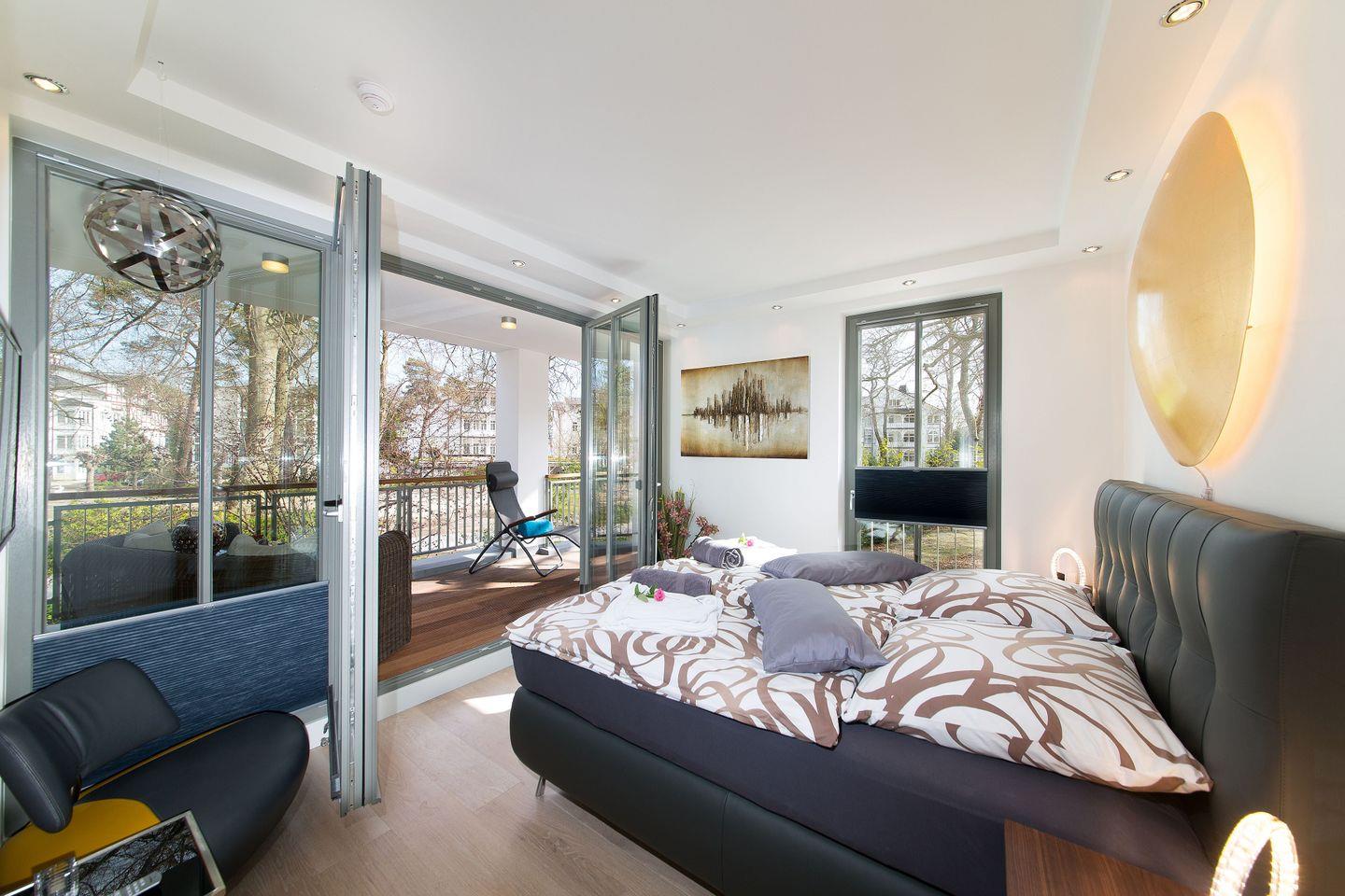 Die lichtdurchflutete Wellness-Suite beeindruckt mit 120m² Wohnfläche, eigener Sauna und Infrarotkabine. Das Appartement hat bodentiefe Balkonfenster in allen Räumen und man kann von den beiden Schlafzimmern und vom Wohnraum aus auf die zur Wohnung gehörenden Balkone gehen. Die Ferienwohnung "Meine Auszeit" ist mit edlen Möbeln von beispielsweise Rolf Benz, Joop!, Leicht und Hülsta ausgestattet. Die Badarmaturen sind von der Marke Dornbracht. Der Eingangsbereich ist mit Garderobenschrank und Schuhschrank ausgestattet und bietet einen ersten Blick in den offenen und stylisch eingerichteten Wohn- und Essbereich. Die Küche ist voll ausgestattet, auch ein Weinkühlschrank mit zwei Kühlzonen steht unseren Gästen zur Verfügung. Eine große Kücheninsel ist ideal, um einen geselligen Kochabend zu veranstalten. WLAN ist in allen Räumen kostenfrei verfügbar.