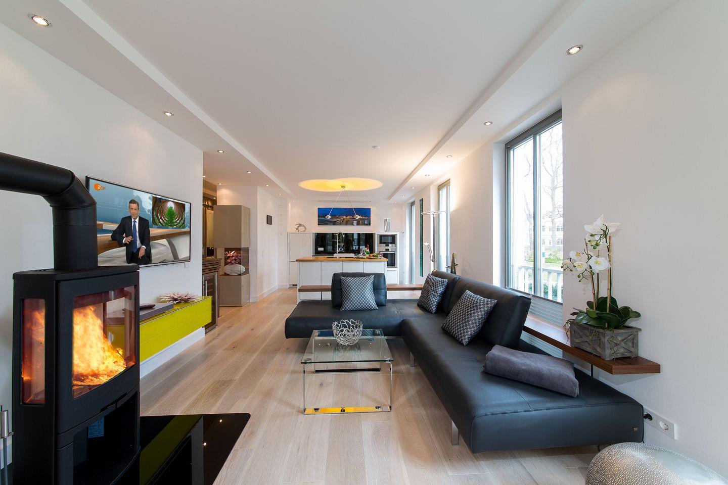 Der Kamin im Wohnraum sorgt besonders in der Nebensaison für schöne Stunden nach wundervollen Strandspaziergängen.