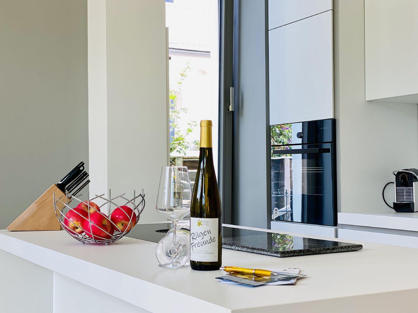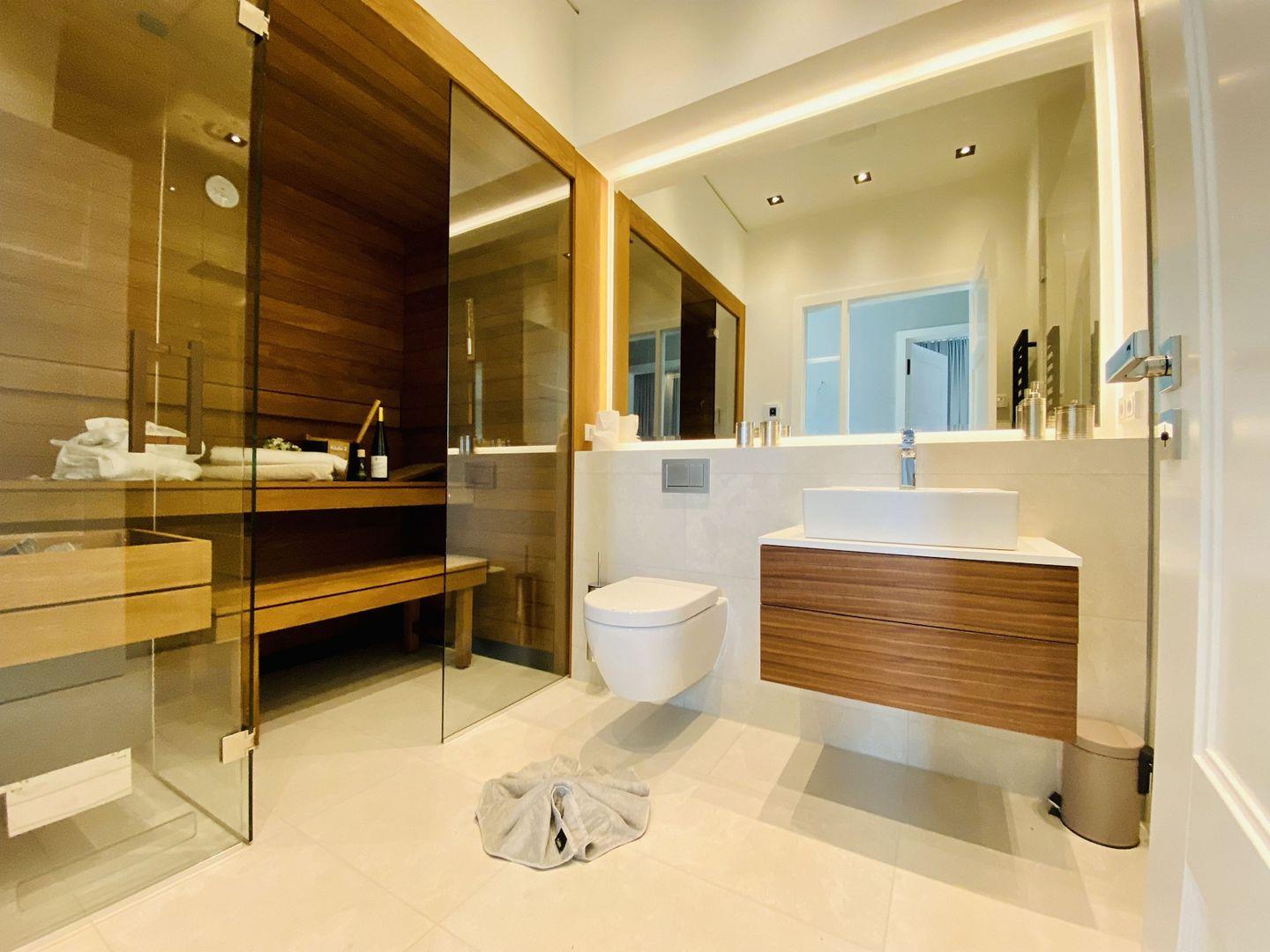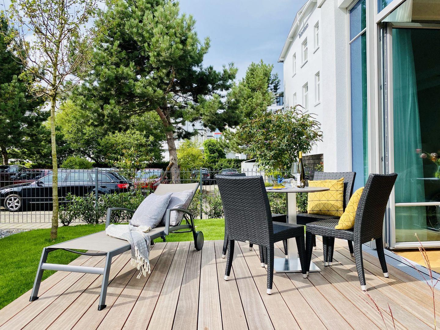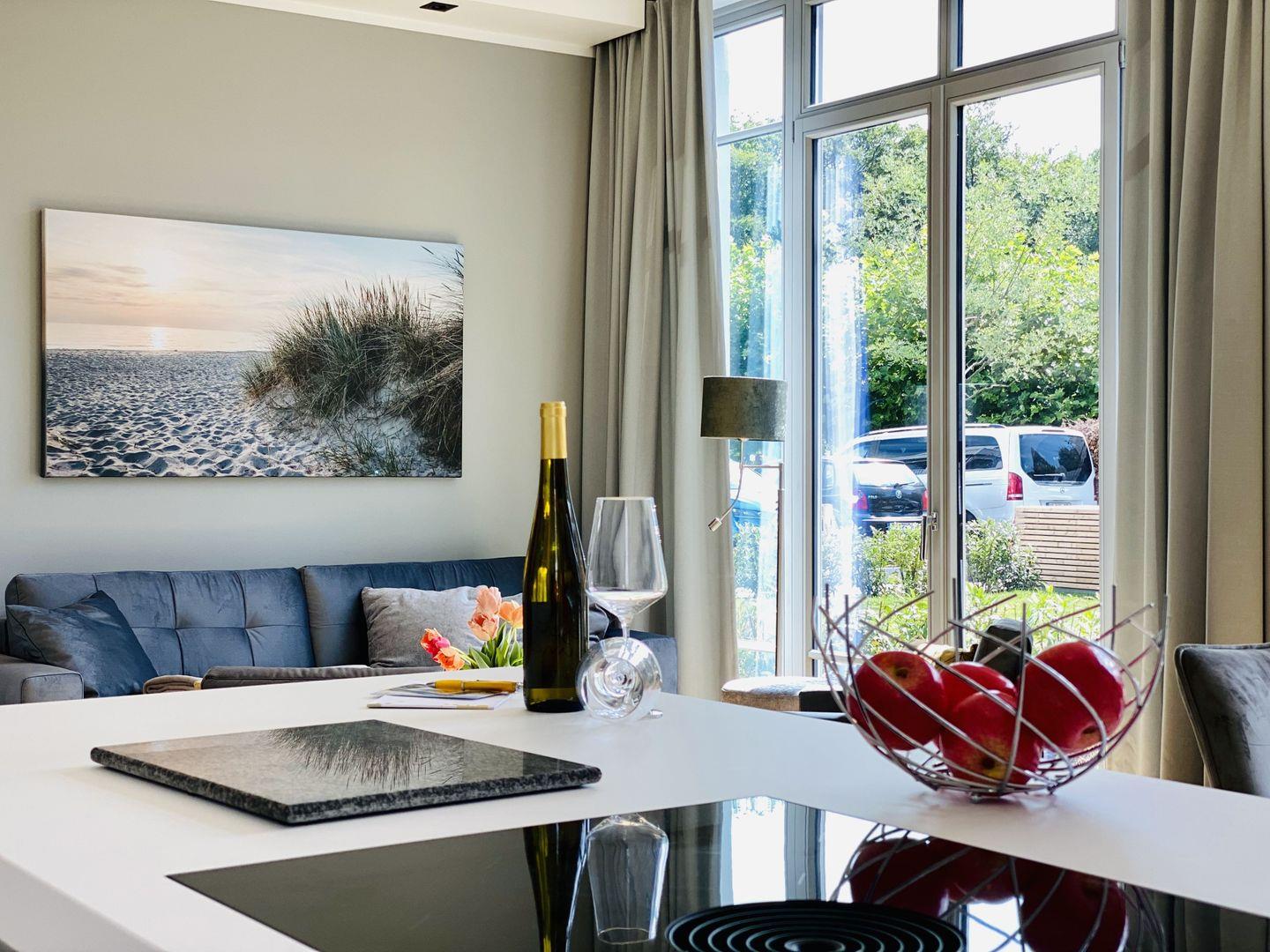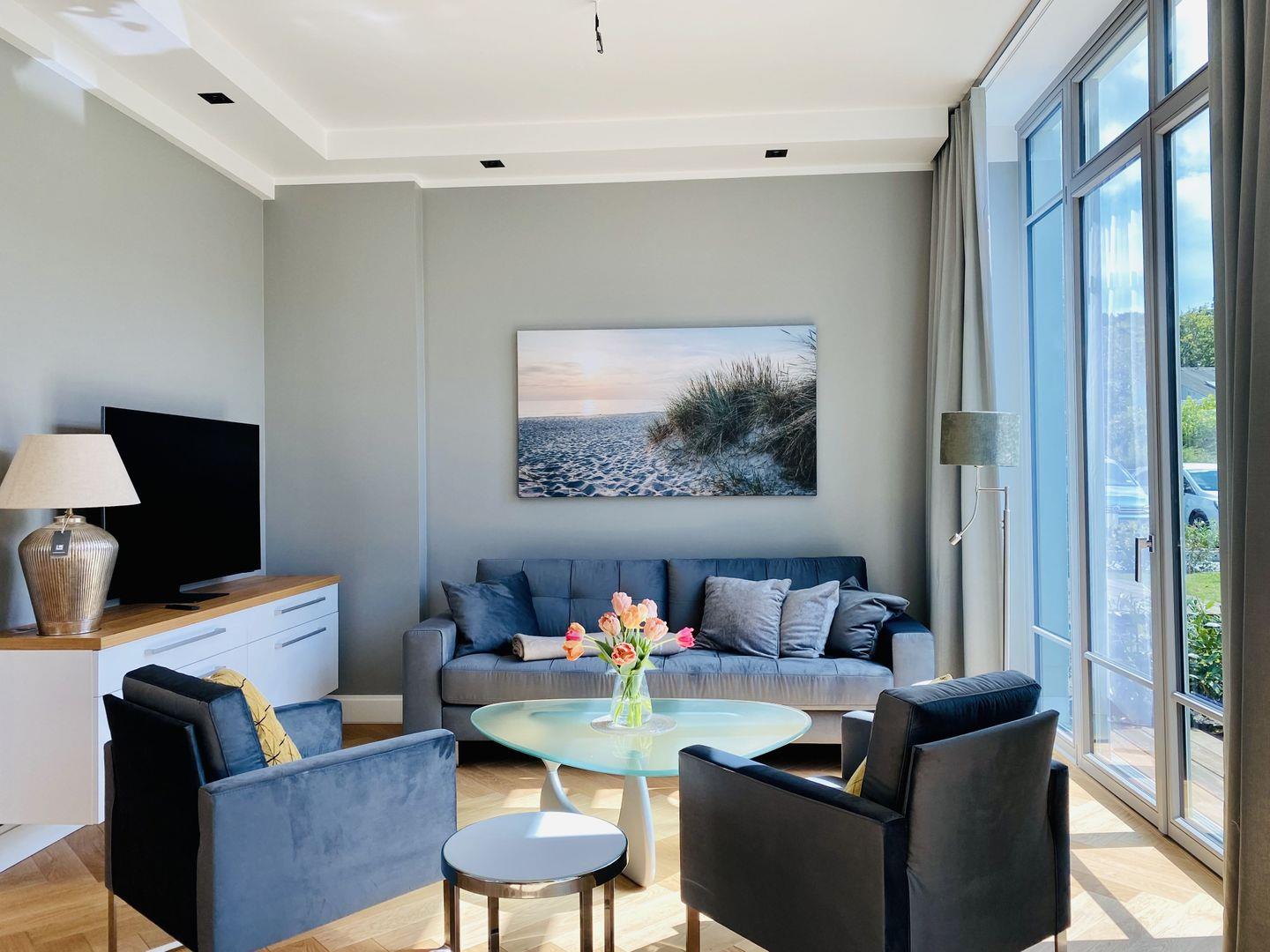 Die großzügige 90 m² große 3-Raum-Ferienwohnung bietet Platz für 4 Personen. Die charmant und hochwertig eingerichtete „lichtdurchflutete-Ferienwohnung“ mit Eichenholzboden befindet sich im Erdgeschoss der luxuriösen und neuen Villa Charlotte in Binz und ist mit allem Komfort ausgestattet. Versierte Innenarchitekten haben hier ein charmantes Urlaubsdomizil geschaffen. Der Wohnbereich mit großer Fensterfront Richtung Süden, Terrasse im kleinen Garten und bequemen Außensitzmöbeln, ergänzt durch die exklusive offene Küche ausgestattet mit High-End-Geräten und dazu ein großer Essplatz. 2 Schlafzimmer mit Boxspring-Doppelbetten, Ambiente-Nachtbeleuchtung und jeweils eigenem Smart-TV bieten besten Schlafkomfort. Beleuchtete „große Kleiderschränke“ in beiden Schlafzimmern lassen die Suche nach dem passenden Urlaubsoutfit ganz einfach werden. Das Bad mit großer, ebenerdiger Regendusche, Panorama-Kristall-Spiegel, WC, Waschtisch und Handtuchtrockner, ist mit wohnungseigener Sauna integriert, ein Highlight, nicht nur in der kalten Jahreszeit. Zum Lieblingsplatz werden sicher schnell die Terrasse mit Blick auf das schicke Villenensemble von Binz und der Weg Richtung Strand direkt am Haus entlang.