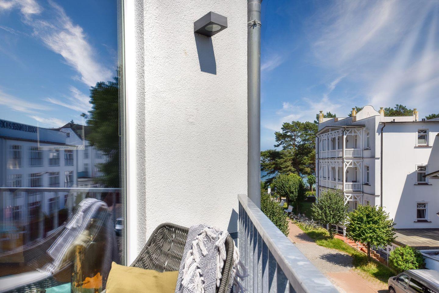 Moderne Ferienwohnung Strandgold mit Balkon und seitlichem Seeblick auf die Ostsee in Binz.