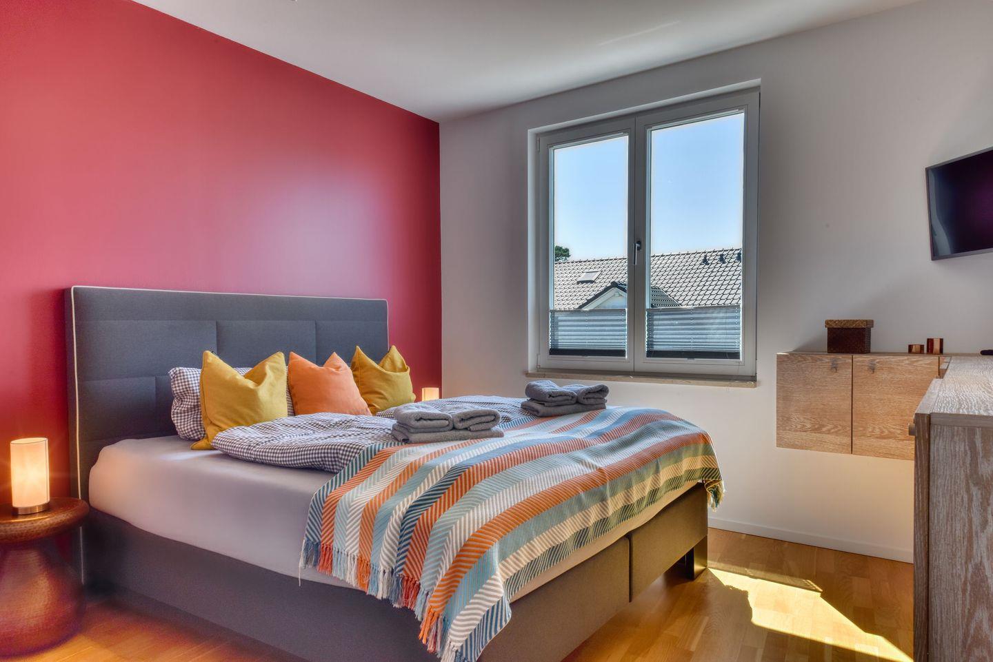 Unsere Ferienwohnung bietet zudem eine Fülle an Annehmlichkeiten für Ihren Komfort, darunter jeweils ein luxuriöses Boxspringbett und einen Flachbild TV in den beiden Schlafzimmern, ein Gäste-WC, eine Fußbodenheizung in der gesamten Wohnung und ein eigener Parkplatz. Außerdem stellen wir Ihnen Handtücher, Bettwäsche sowie Reinigungs- und Hygieneprodukte zur Verfügung, um Ihren Aufenthalt noch angenehmer zu gestalten.