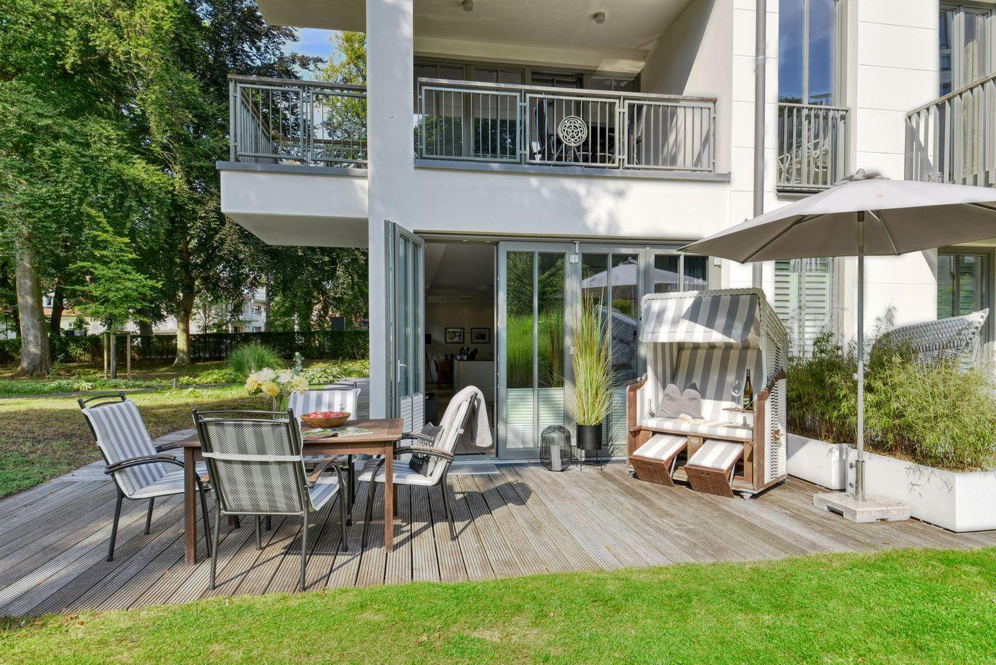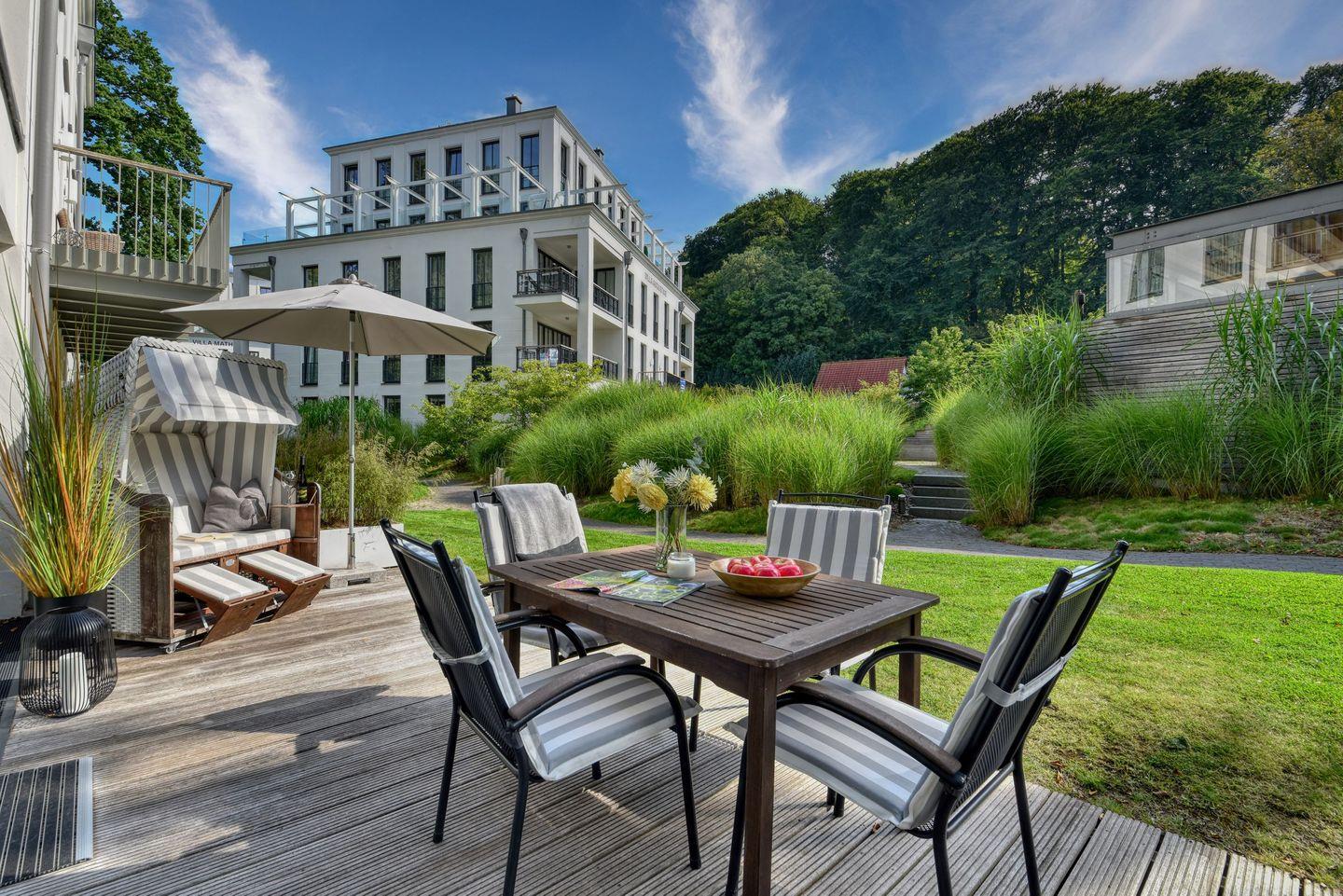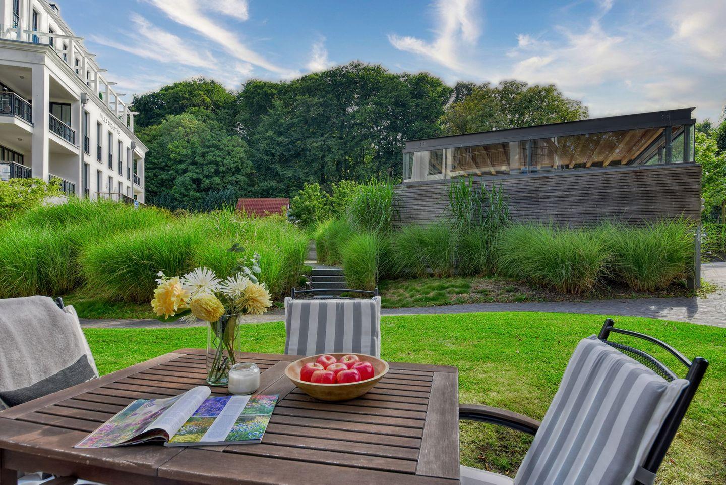 Luxuriöse Ferienwohnung Baltic Lounge in Binz mit Parkanlage und Außenpool für erholsamen Ostseeurlaub.