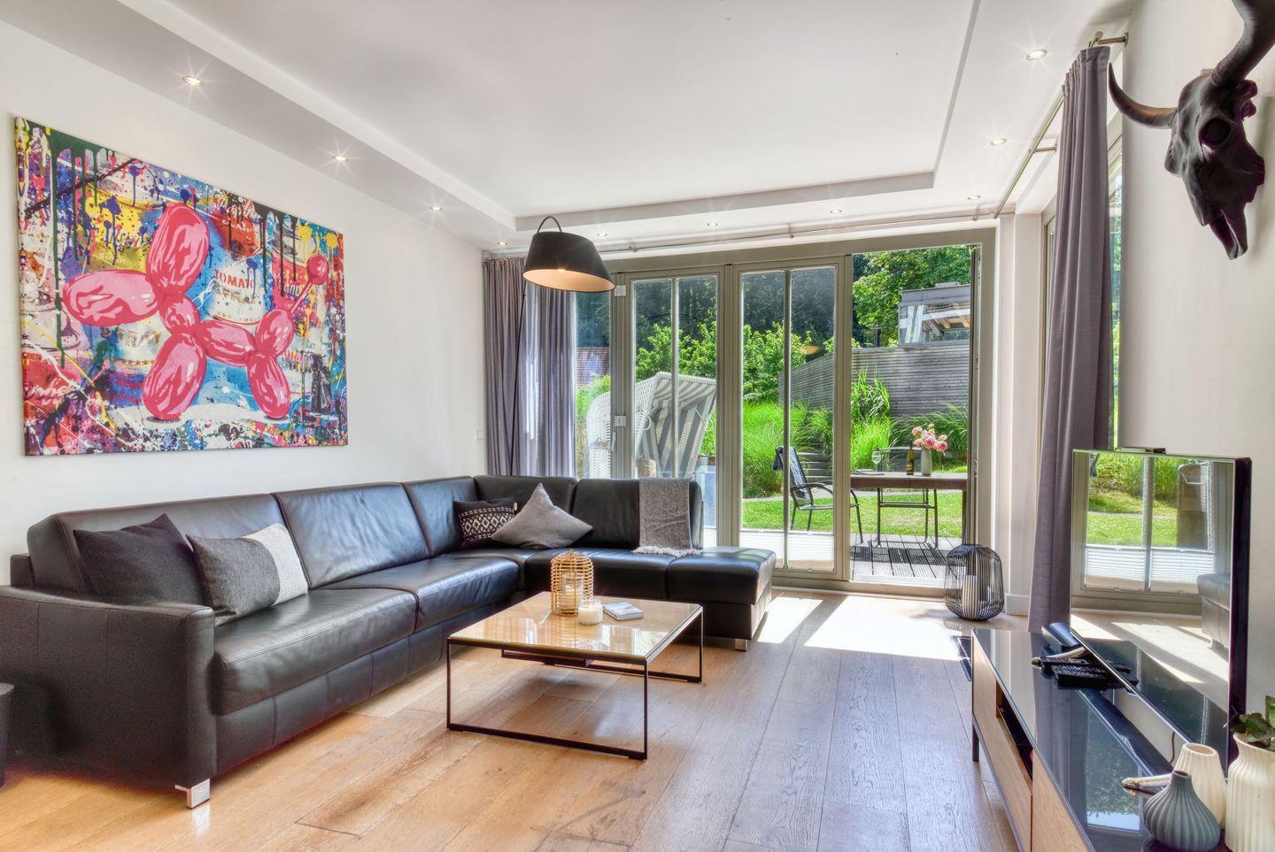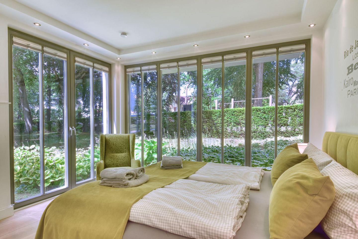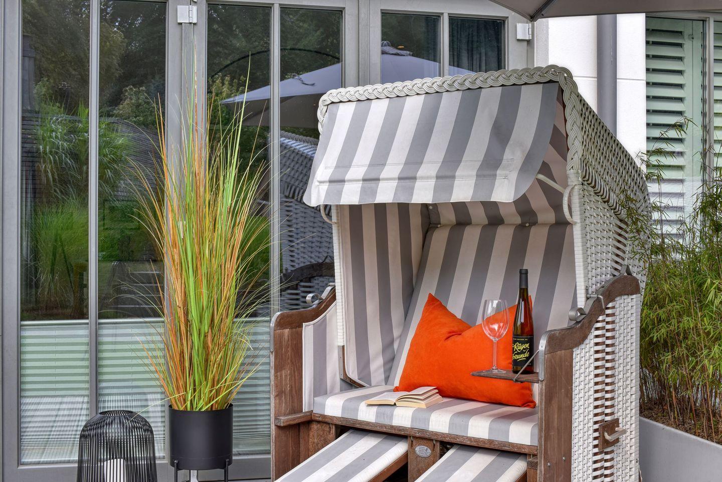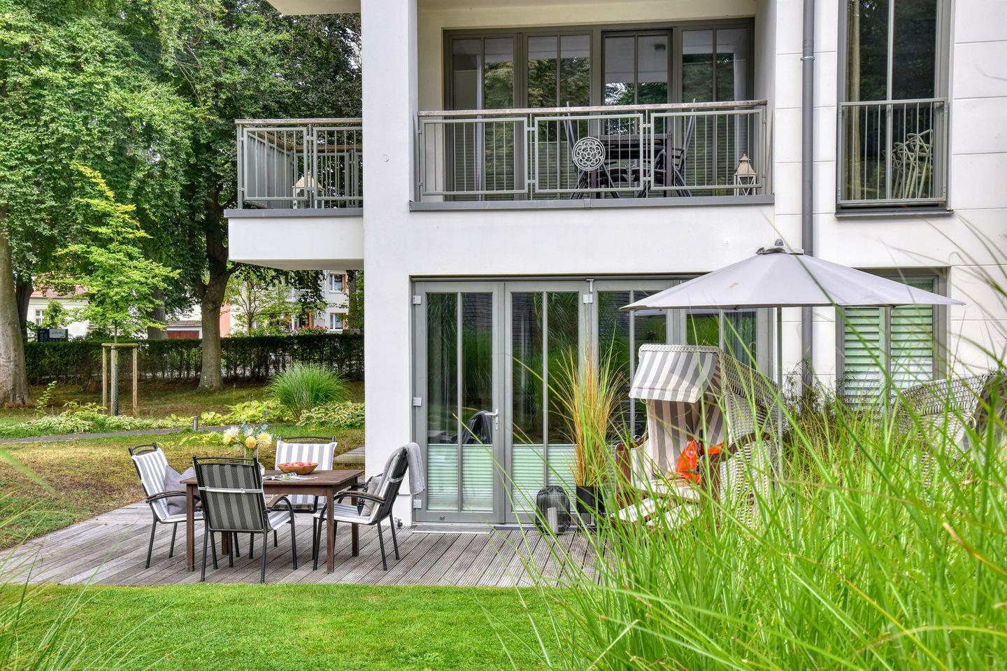 Luxuriöse Ferienwohnung Baltic Lounge in Binz mit Parkanlage und Außenpool für erholsamen Ostseeurlaub.