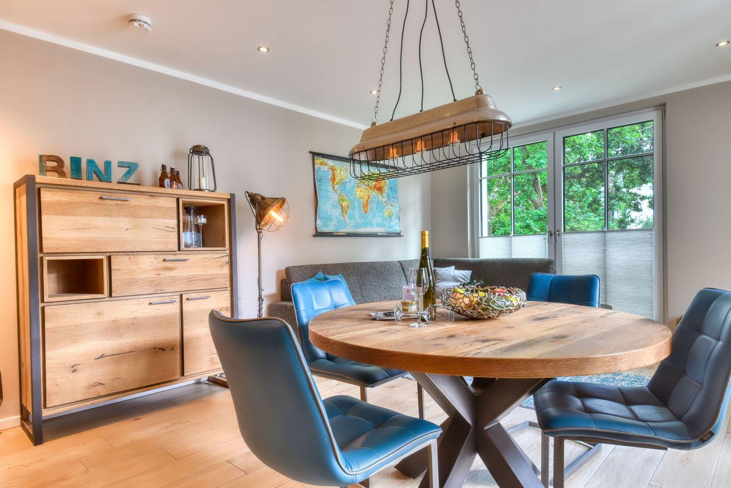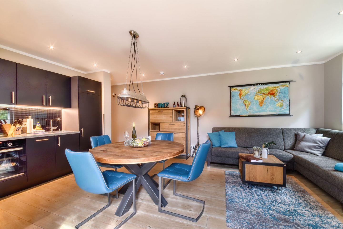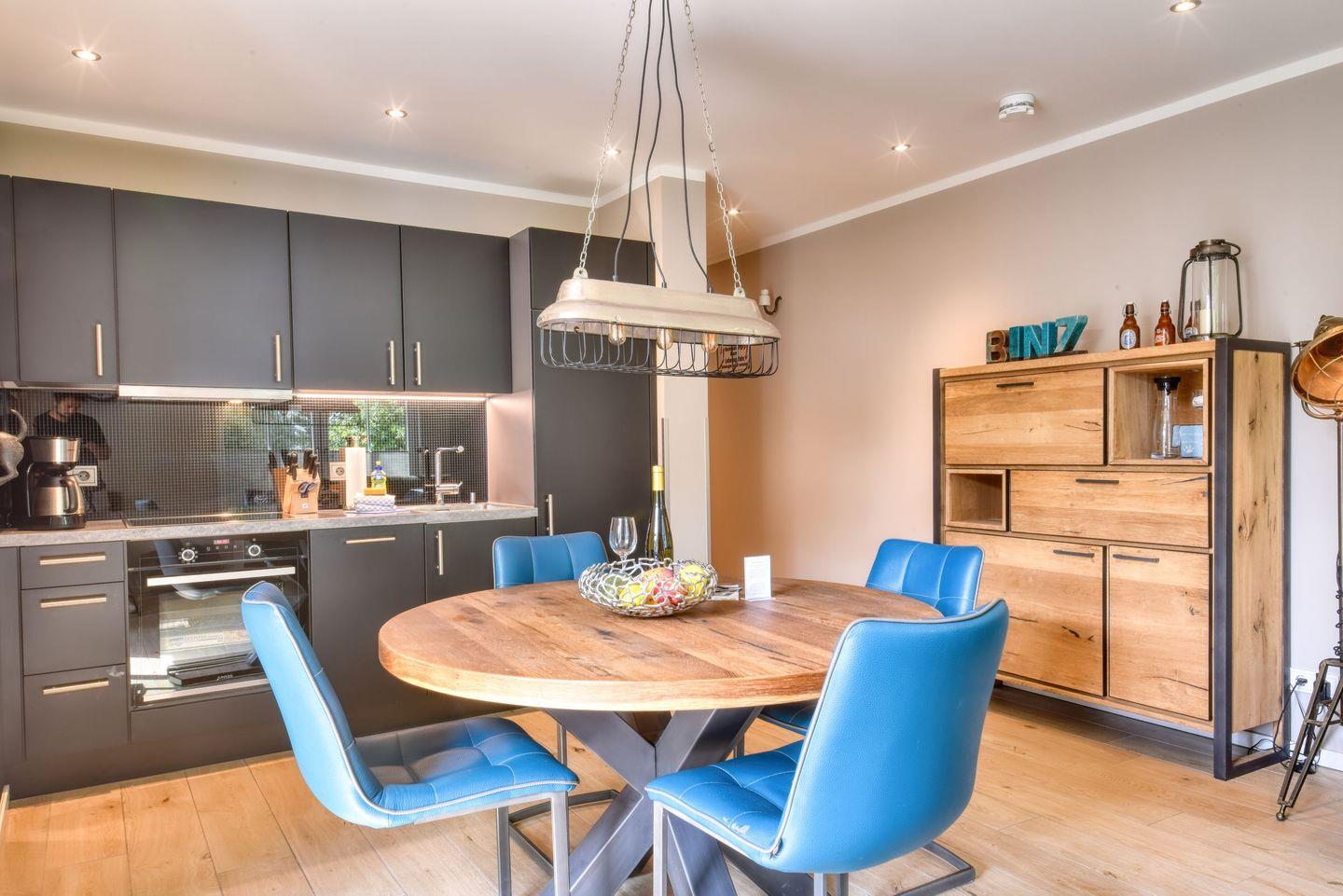 Ein besonders hübsches Urlaubsdomizil erwartet Rügen-Liebhaber im 1. Obergeschoss der Villa Sofie Binz im Appartement Nr. 9 „Lotsenbude“. Via Fahrstuhl geht es von der hauseigenen Tiefgarage hinein ins Urlaubsglück. In diesem 65 m² großen Ferienappartement finden bis zu vier Personen Platz. Kommen Sie erst einmal an und holen Sie tief Luft - denn Sandstrand und Ostseewellen sind nur wenige Gehminuten entfernt. Zum Ausspannen lädt der 10 m² große Balkon mit Gartenmöbeln (bequem verstellbare Hochlehner) und Sonnenschirm ein. Ob beim Frühstück unter freiem Himmel, beim Entspannen auf dem wohnungseigenen Balkon – hier fängt die Erholung bereits direkt nach Anreise an. Das geräumige Wohnzimmer bietet reichlich Platz zum Entspannen auf dem Ecksofa oder zum Essen am Esstisch. Die Wohnung ist im elegant-rustikalen Stil eingerichtet. Ein großer Flat-TV mit Smart-Funktion sorgt für abendliche Unterhaltung. Kostenfreies WLAN steht zur Verfügung. Die offene Wohnküche ist mit hochwertigen Küchengeräten voll ausgestattet. Die zwei Schlafzimmer laden mit bequemen Boxspringdoppelbetten zum Träumen ein. Hier gibt es einen Flachbild TV, Nachtschränke mit Lämpchen zum Lesen und einen Kleiderschrank mit Tresor und genügend Ablagefläche. Das moderne Bad verfügt über Dusche, WC, Handtuchheizung und Waschtisch.