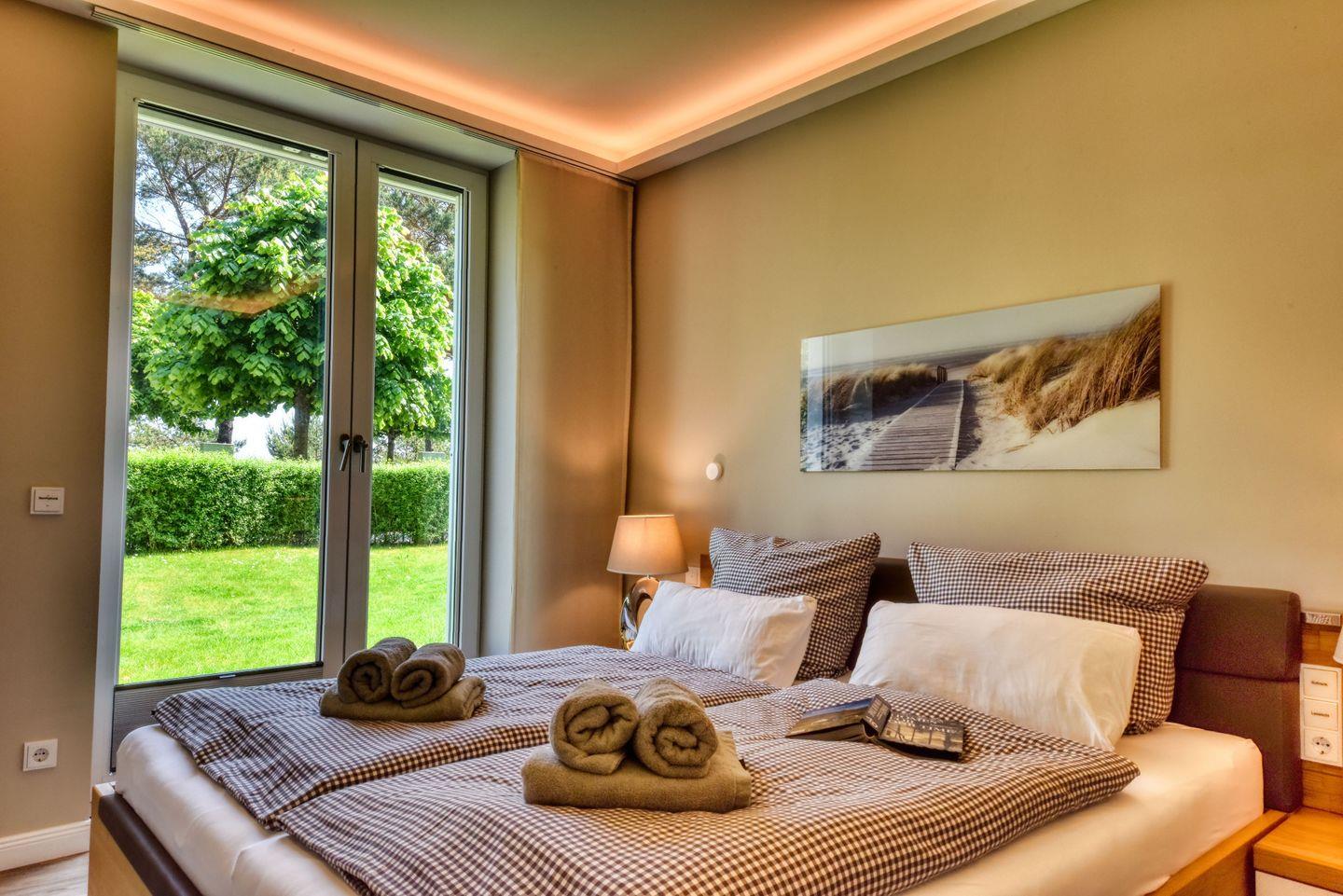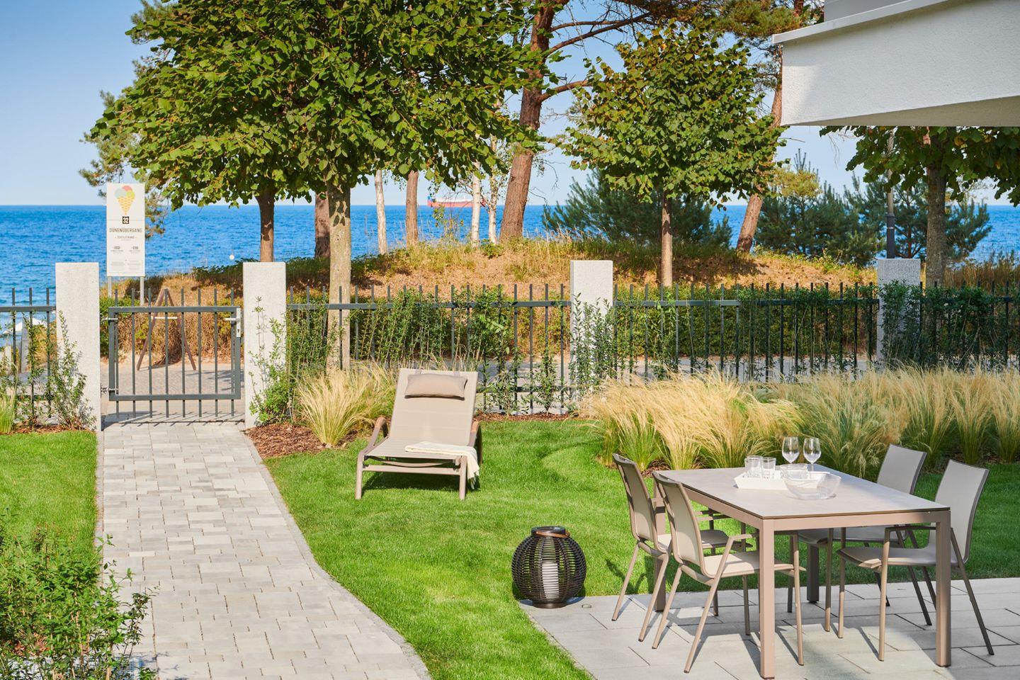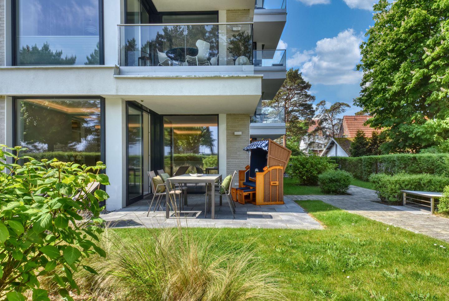 Ein Highlight der Ferienwohnung ist die private Terrasse, die mit bequemen Gartenmöbeln, Strandkorb und Sonnenliegen ausgestattet ist. Genießen Sie hier die frische Seeluft und den spektakulären Blick auf die Ostsee. Die Terrasse ist der perfekte Ort für ein gemütliches Frühstück, einen entspannten Nachmittag oder einen romantischen Abend.