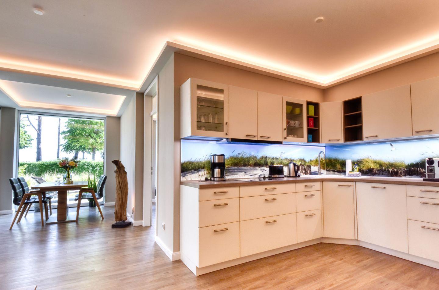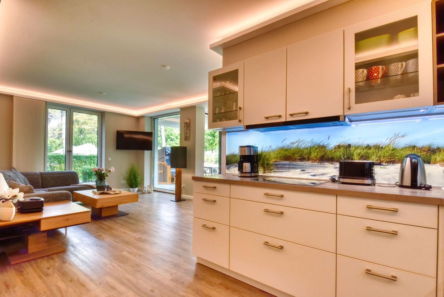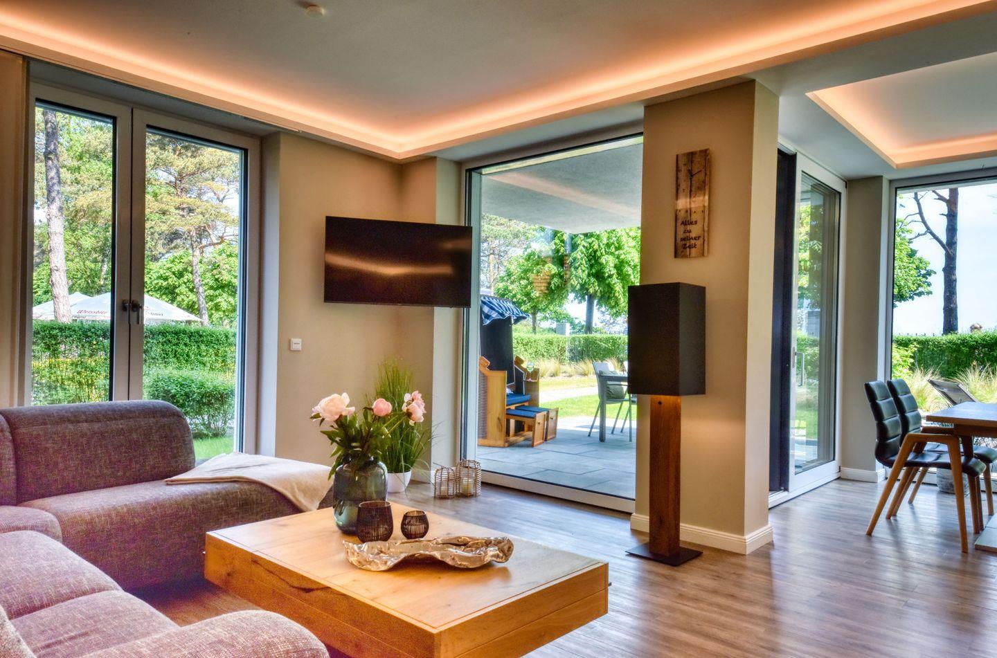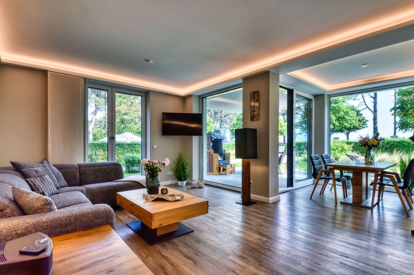 Die Ferienwohnung empfängt Sie mit einem großzügigen, stilvoll eingerichteten Wohnbereich. Hier erwarten Sie ein komfortables Sofa, ein Flachbildfernseher und eine gemütliche Leseecke – ideal für entspannte Abende. Die großen Fensterfronten bieten nicht nur viel Tageslicht, sondern auch einen traumhaften Meerblick, der jeden Aufenthalt unvergesslich macht.
