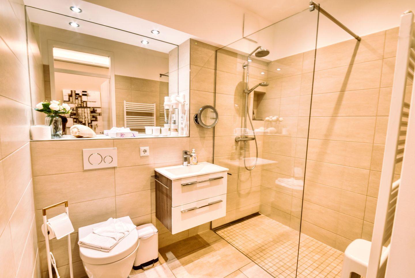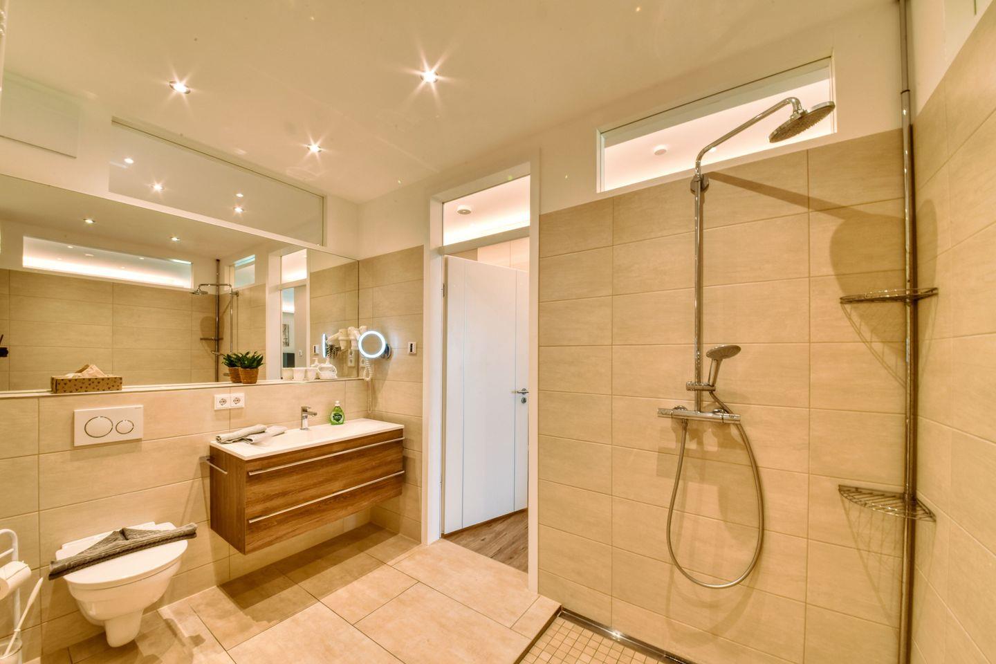 Die Ferienwohnung verfügt über zwei elegante Badezimmer, die Ihnen ein Höchstmaß an Komfort bieten. Beide Badezimmer sind mit einer geräumigen Dusche, einem eleganten Waschtisch und hochwertigen Armaturen ausgestattet. Hier können Sie sich nach einem Tag am Strand oder einer Erkundungstour wunderbar entspannen.